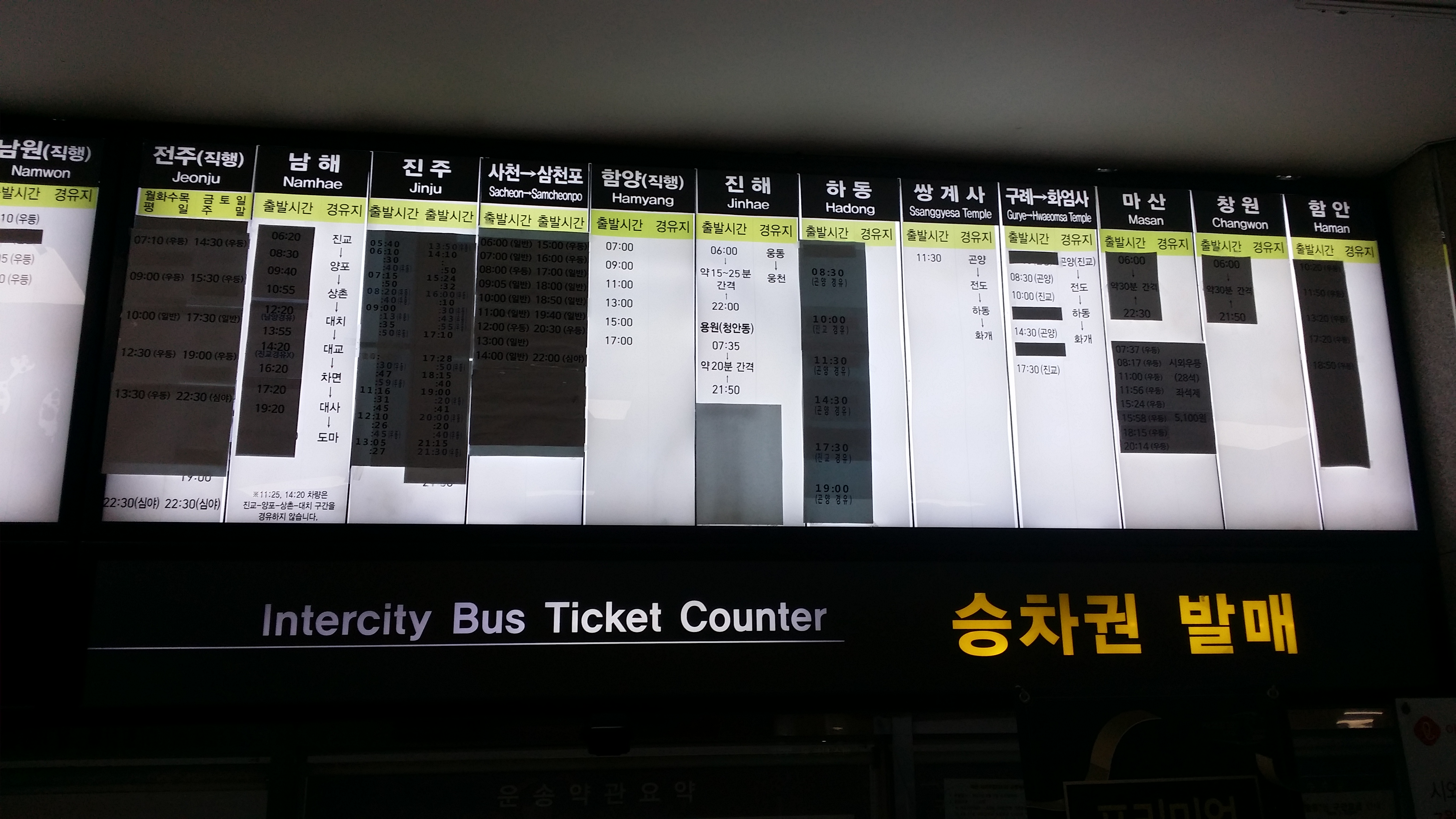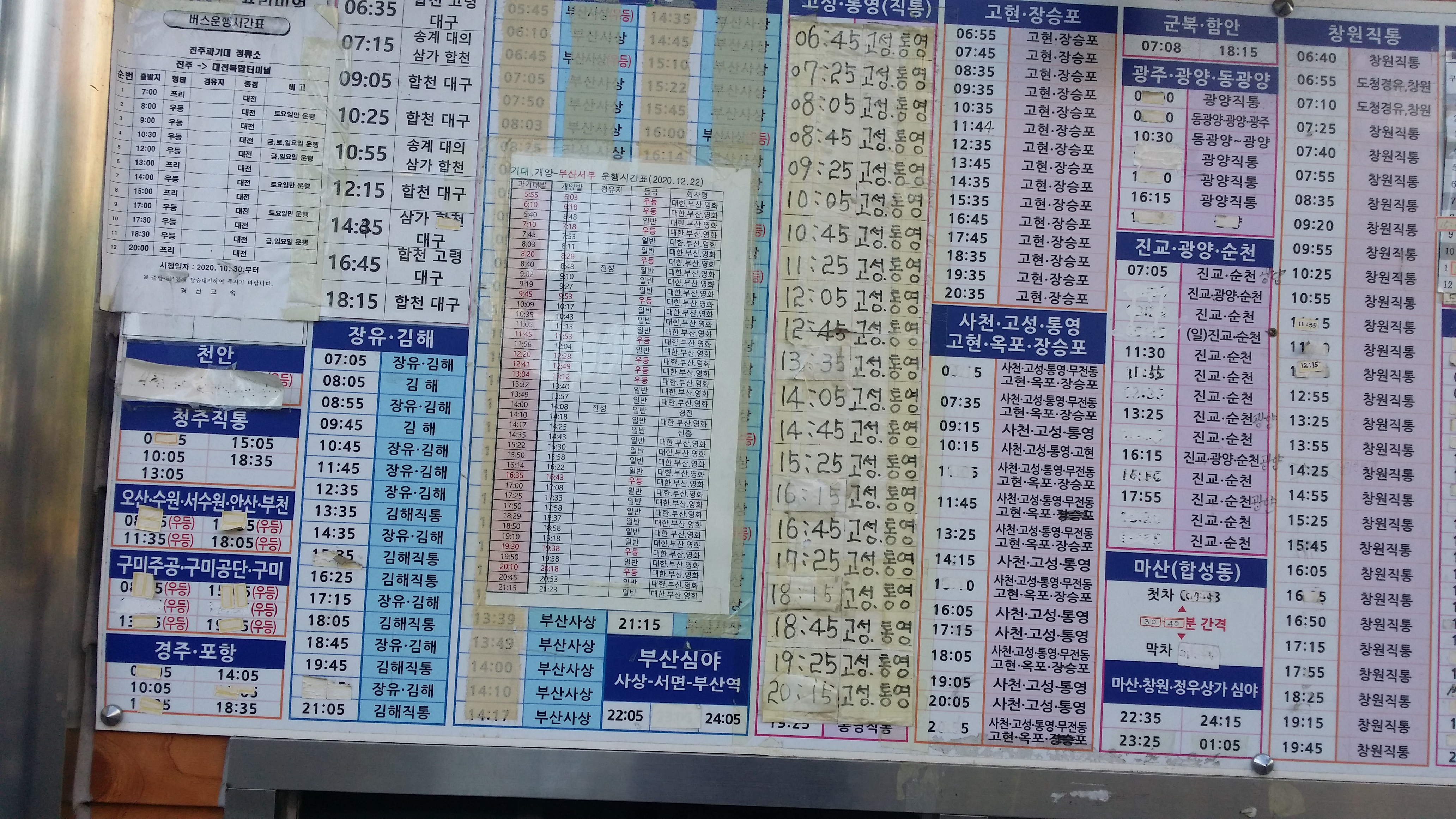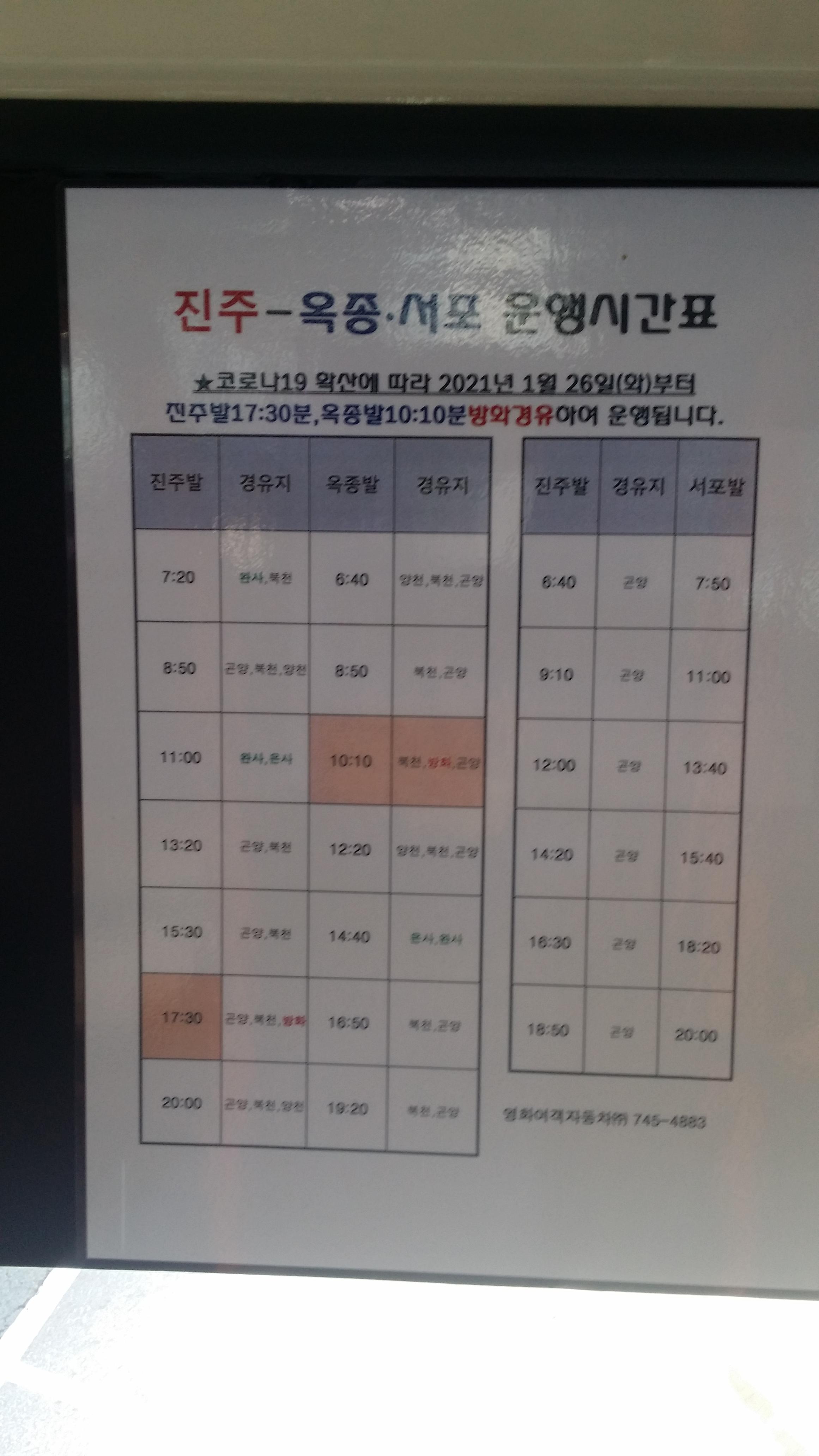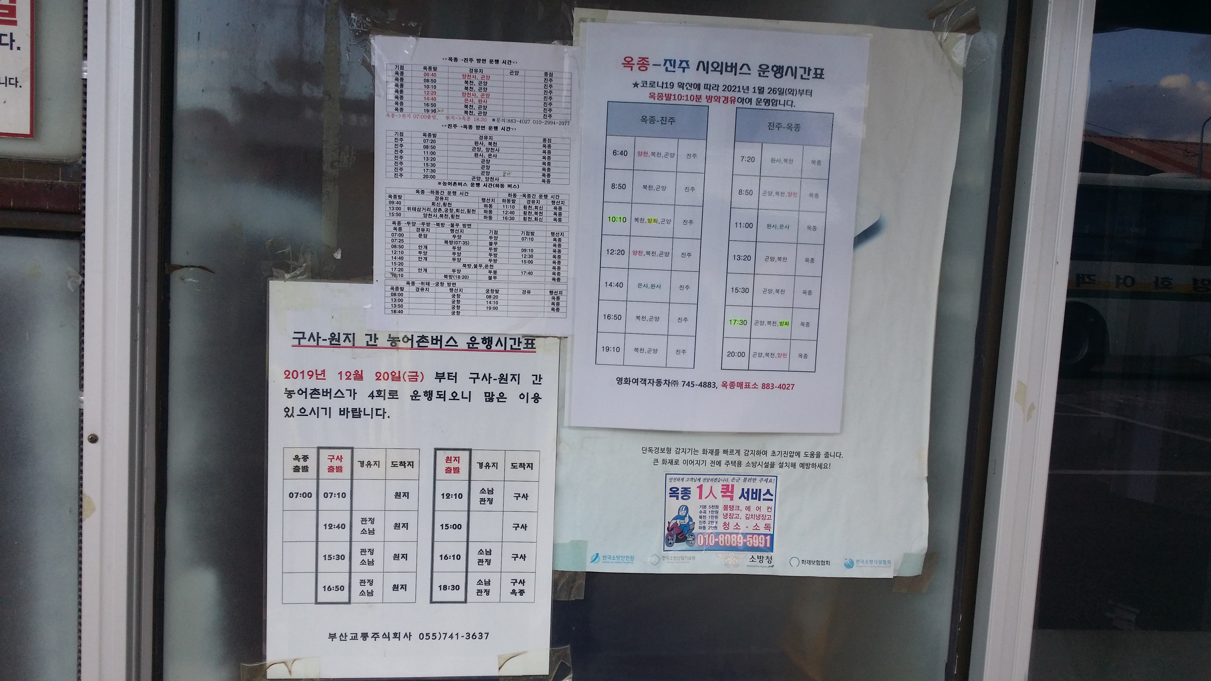 부산 서부 시외버스터미널진주에서 옥종가는 버스를 타기위해 집에서 지하철 첫차를 타고 진주행 버스를 타기위해 달린다. 18년12월15일 정수지맥때 경험이 있어 문제될게 없는데, 요는 진주에서 옥종가는 버스를 못타면 산행시간이 1시간 delay 된다. 부산에서 진주까지 소요시간이 경험상 1시간12분에서 19분 걸렸는데, 부산~진주 단거리 노선의 경우 죽어라 달리는데, 지금탄 장거리 노선의 경우 중간 경유지에서 배차 시간이 있어 빨리 달리질 않는것 같다. 그래서 중간 시간대인 1시간15분을 소요시간으로 예상하니 진주터미널에 들어갔다간 안되 진주남중학교에서 하차하여 과기대 정류소까지 600m 달리면 탈거 같네희망 소요시간을 1분 over한 7시21분 남중에 도착했다. 과기대매표소까지 600m를 4분만에 달려야 한다. ㅎ 베낭메고 달리자니 힘드네. 전방을 주시하며 걷다 뛰다 반복하여 3분만에 도착한다. 버스는 7시25분 도착, 출발한다진주에서 옥종가는 시외버스는 두개의 경로로 운행한다. 곤양을 경유하는 버스는 개양에서 승차 가능하며 약26분(터미널에서 개양까지 13분 소요)의 시간을 벌수 있는데, 원사 경유하는 노선은 개양을 경유하지 않기에 과기대앞에서 승차해야 한다. 터미널에서 과기대까진 약5분 거리다7시26분 버스는 옥종으로 향한다. 이놈의 진행 코스가 남중학교를 지나간다. 7시27분까지 남중학교에 도착하면 택시 승강장이 있어 육거리까지 택시로 이동하면 편안하게 승차? 다음엔 뛰지말고 택시타버스내 비치된 시간표교통카드 사용 가능하네 / 급하면 승차권 끊을 필요없이 바로 승차옥종 시외버스 터미널들머리까지 가는 버스가 9시40분 한번뿐이다. 게다가 회신에서 하차하여 돌고지재까지 2.2Km 걸어야 하기에 터미널에 있는 택시를 이용하기로 한다. 비용은 12000원