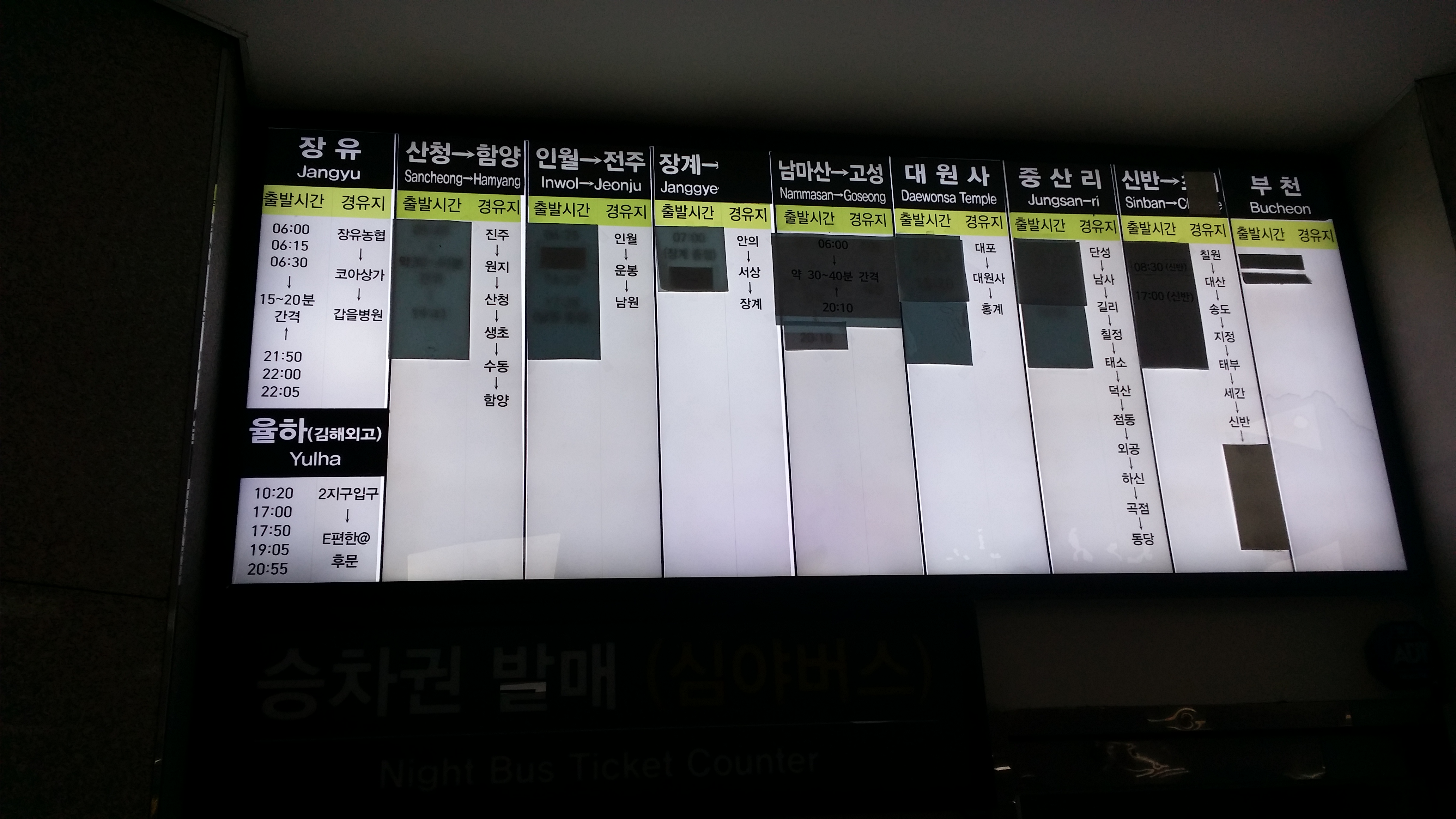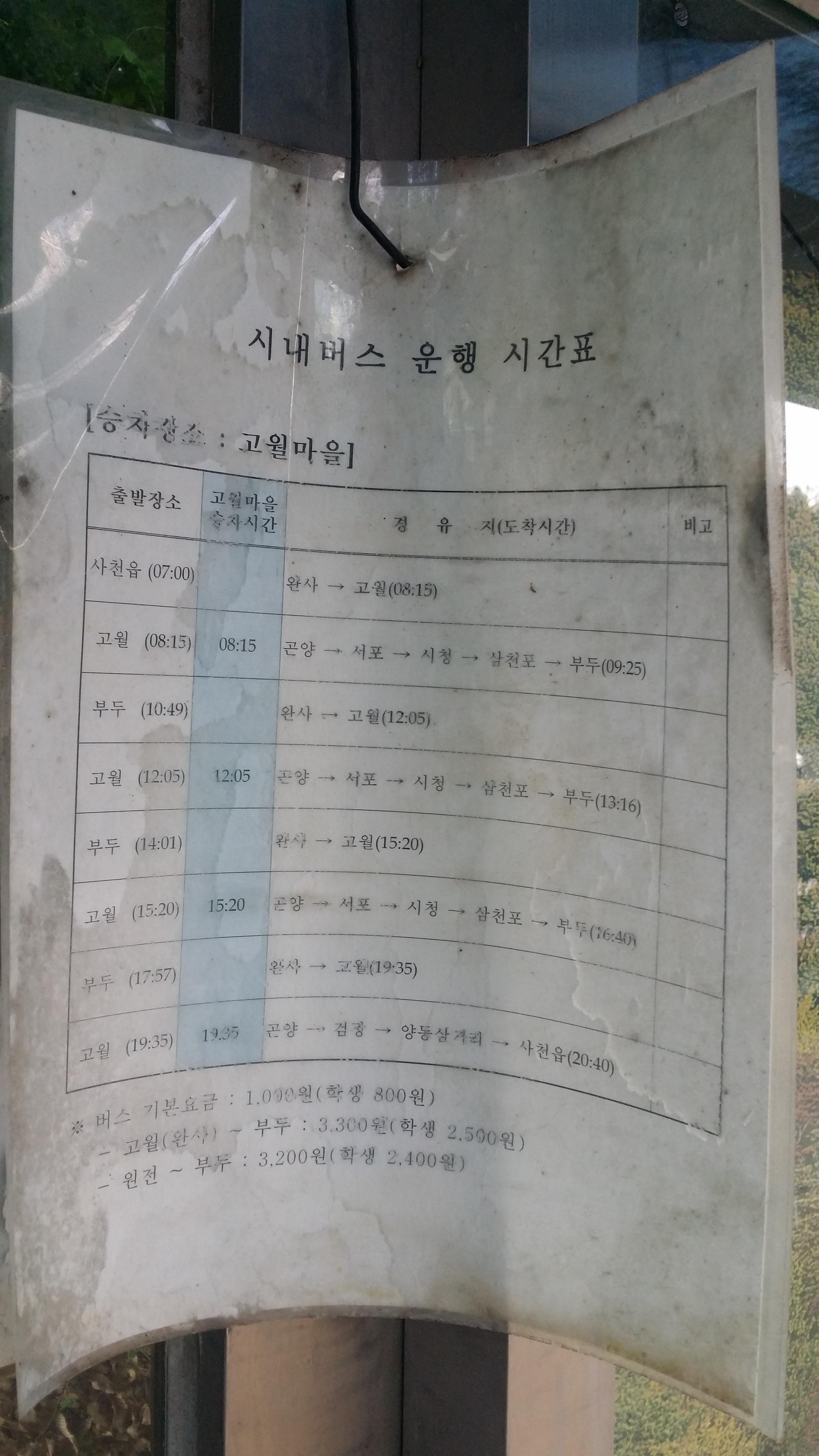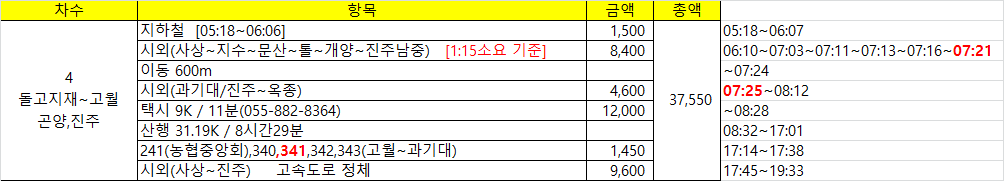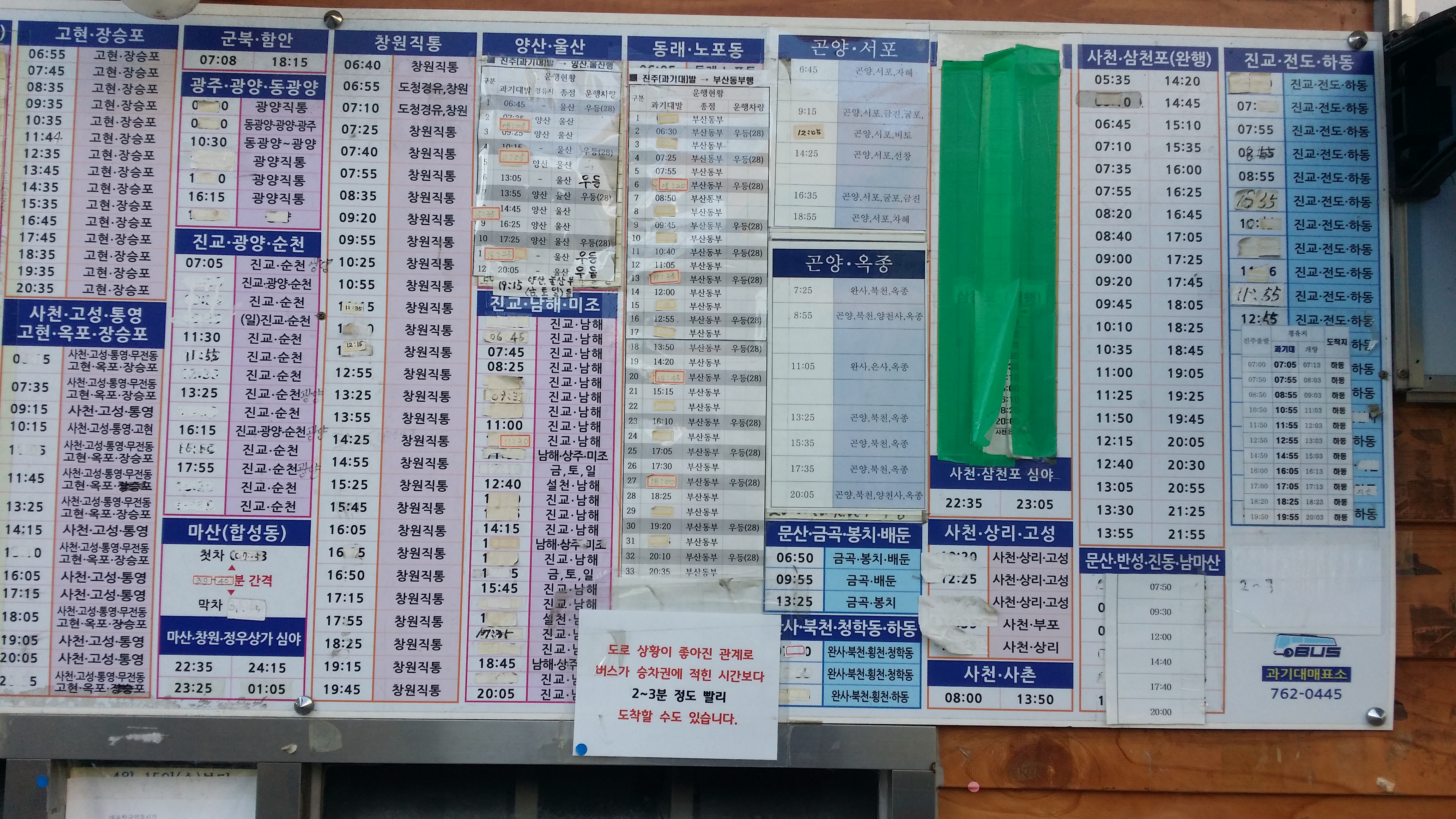 부산 서부 시외버스터미널진주에서 옥종가는 버스를 타기위해 집에서 지하철 첫차를 타고 진주행 버스를 타기위해 달린다. 18년12월15일 정수지맥때 경험이 있어 문제될게 없는데, 요는 진주에서 옥종가는 버스를 못타면 산행시간이 1시간 delay 된다. 부산에서 진주까지 소요시간이 경험상 1시간12분에서 19분 걸렸는데, 부산~진주 단거리 노선의 경우 죽어라 달리는데, 지금탄 장거리 노선의 경우 중간 경유지에서 배차 시간이 있어 빨리 달리질 않는것 같다. 그래서 중간 시간대인 1시간15분을 소요시간으로 예상하니 진주터미널에 들어갔다간 안되 진주남중학교에서 하차하여 과기대 정류소까지 600m 달리면 탈거 같네희망 소요시간을 1분 over한 7시21분 남중에 도착했다. 과기대매표소까지 600m를 4분만에 달려야 한다. ㅎ 베낭메고 달리자니 힘드네. 전방을 주시하며 걷다 뛰다 반복하여 3분만에 도착한다. 버스는 7시25분 도착, 출발한다진주에서 옥종가는 시외버스는 두개의 경로로 운행한다. 곤양을 경유하는 버스는 개양에서 승차 가능하며 약26분(터미널에서 개양까지 13분 소요)의 시간을 벌수 있는데, 원사 경유하는 노선은 개양을 경유하지 않기에 과기대앞에서 승차해야 한다. 터미널에서 과기대까진 약5분 거리다7시26분 버스는 옥종으로 향한다. 이놈의 진행 코스가 남중학교를 지나간다. 7시27분까지 남중학교에 도착하면 택시 승강장이 있어 육거리까지 택시로 이동하면 편안하게 승차? 다음엔 뛰지말고 택시타버스내 비치된 시간표교통카드 사용 가능하네 / 급하면 승차권 끊을 필요없이 바로 승차옥종 시외버스 터미널들머리까지 가는 버스가 9시40분 한번뿐이다. 게다가 회신에서 하차하여 돌고지재까지 2.2Km 걸어야 하기에 터미널에 있는 택시를 이용하기로 한다. 비용은 12000원