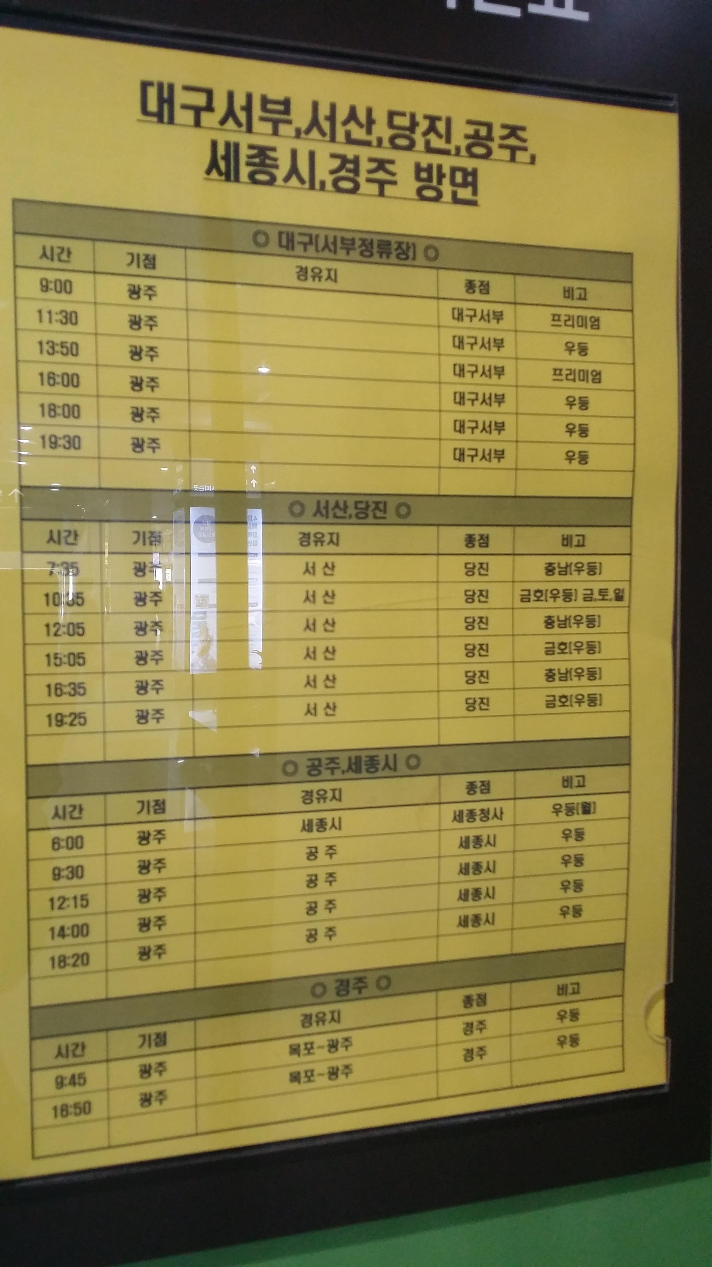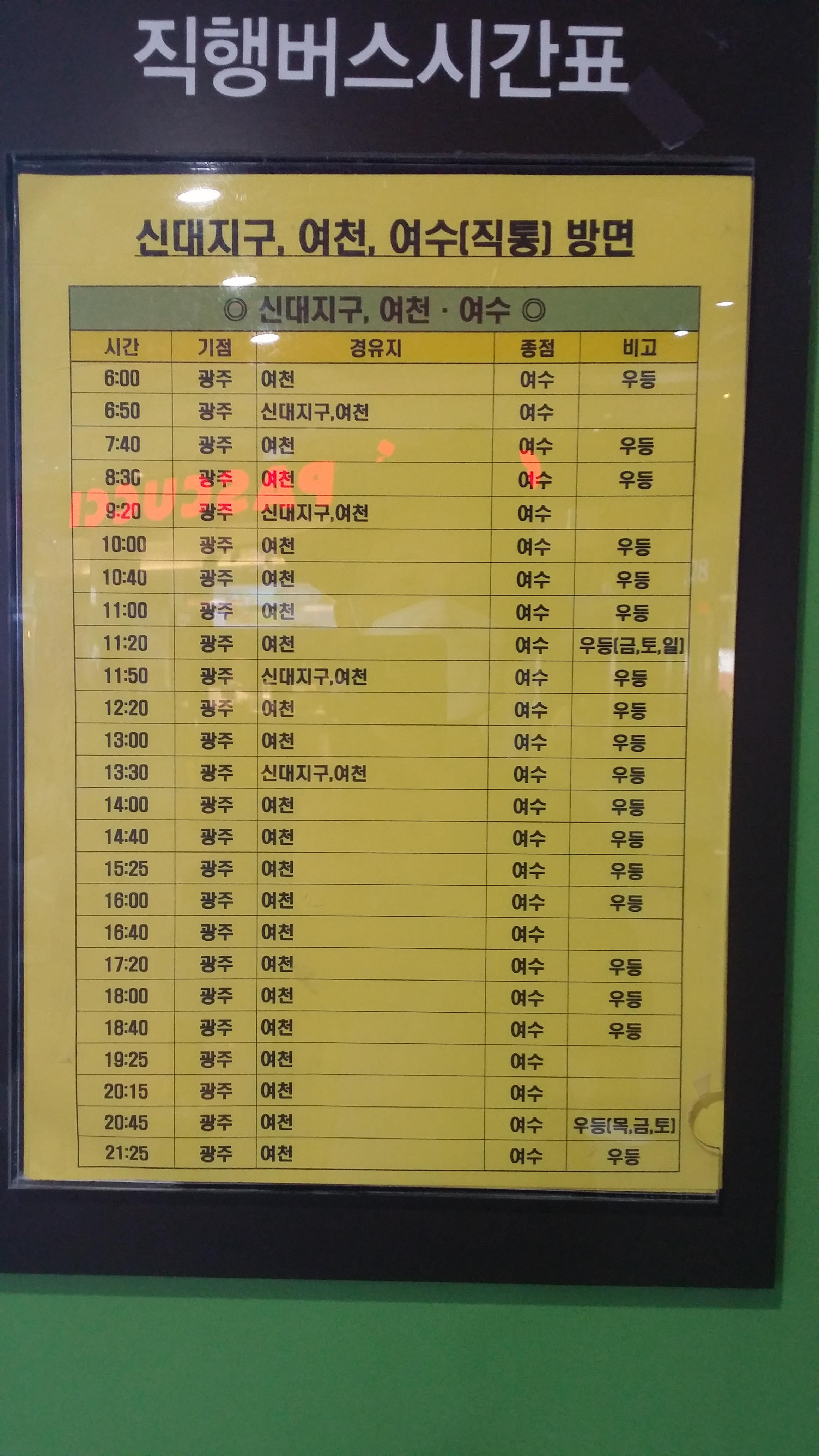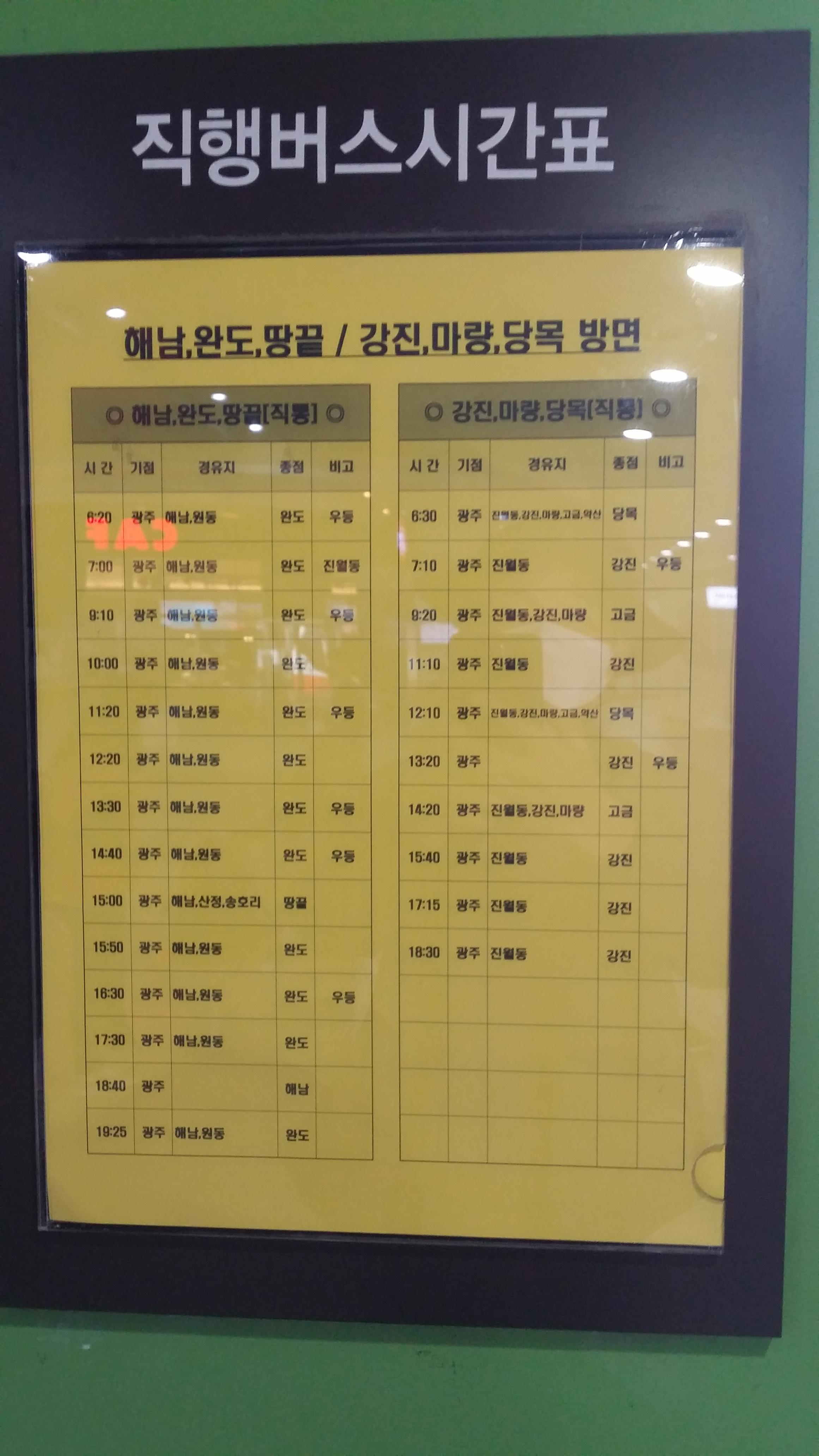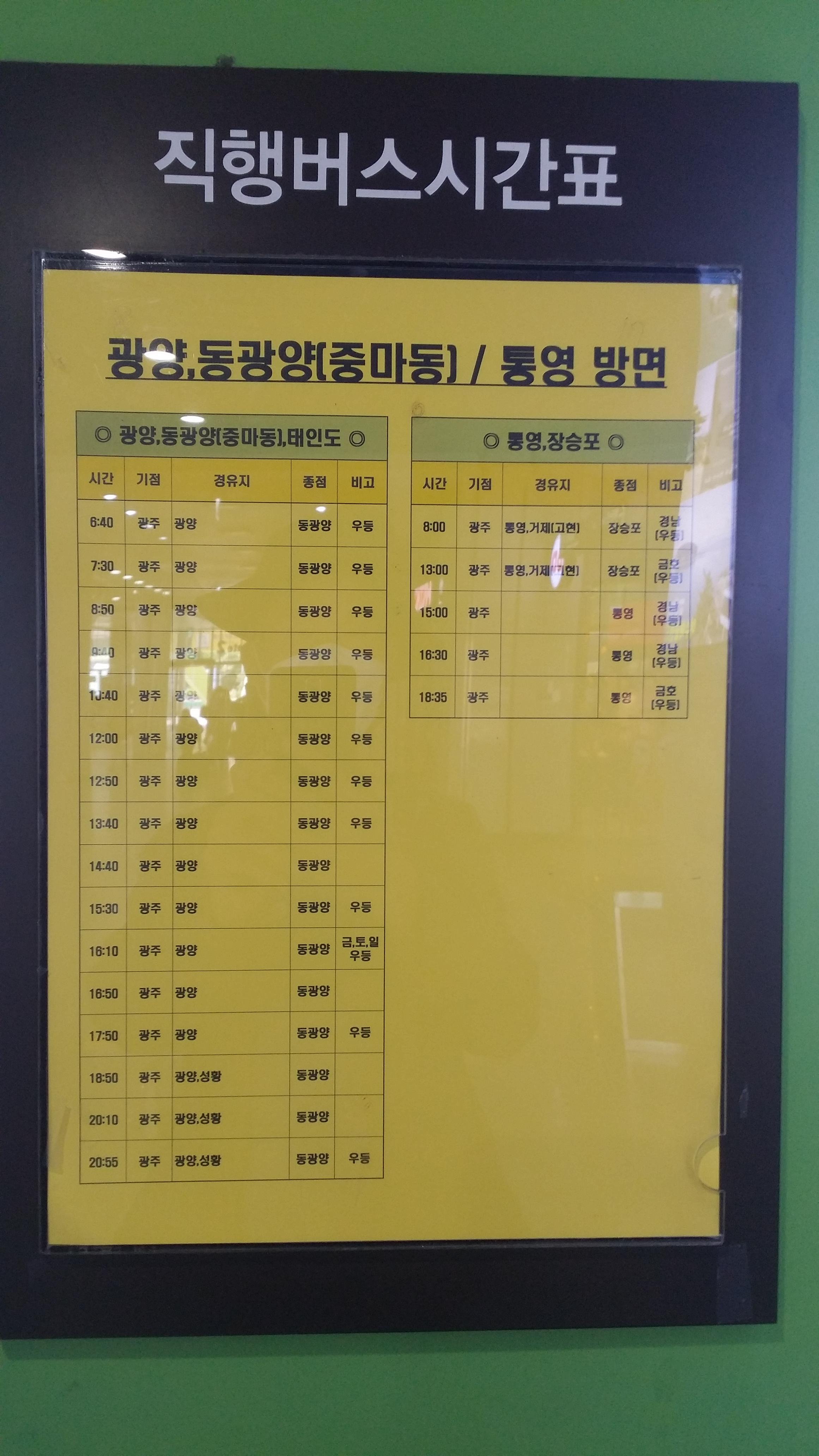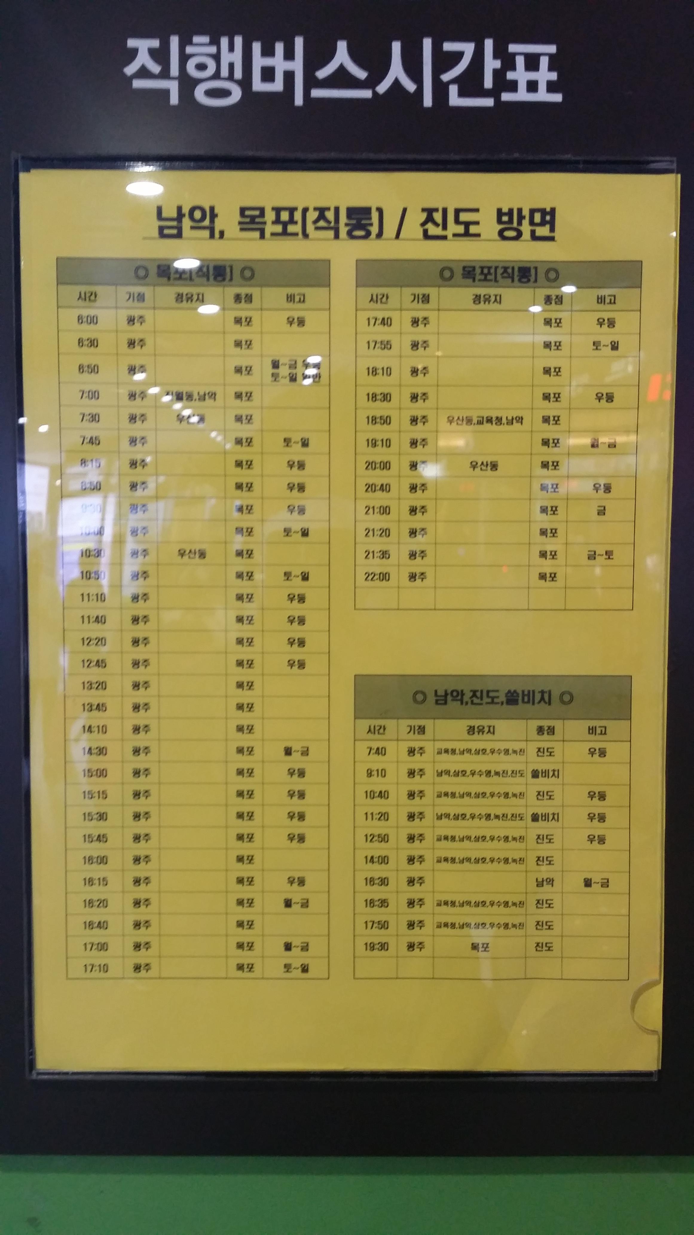 부산 동부버스터미널 / 부산에서 목포로 가는 방법은 직통 및 광주 경유 방법이 있다. 직통는 서부터미널에서 경유는 동부와 서부터미널 두군데 가능한데 동부쪽이 이른 시간에 있어 후자를 택한다부산 동부터미널에서 광주까지는 2시간55분 + 휴계시간, 서부터미널은 2시간40분 + 휴계시간, 그리고 버스타고 예약앱는 출발 20전까지, 고속버스 예약앱은 출발 5분전까지 예약가능. 또하나 아침차는 휴계 시간을 철저하게 이용하고(기사 식사? / 15분 사용), 막차는 볼일만 보고(5분) 진행 / 고속버스앱 예상 소요시간(3시간)을 믿고 유달산 일정을 세웠는데, 광주에 9시30분에(3시간10분 소요) 도착하는 바람에 엉망이 되었다유스퀘어 광주종합버스터미널 시외버스 시간표다 / 목포행 버스가 평일과 공휴일을 구분하네 10시 출발버스를 타고 호남대터널 부분을 지날때 시간 체크를 해둔다(13분 소요). 시외버스를 탈때 항상 해두는 버릇이다. 요기 나중에 다 쓰임이 된다. 버스타고앱에서 광주~목포(50분), 목포~광주(1시간8분) 예상 소요 시간이 상이하여 기사님께 여쭈니 양방향 공히 55분 가량 걸린다네.