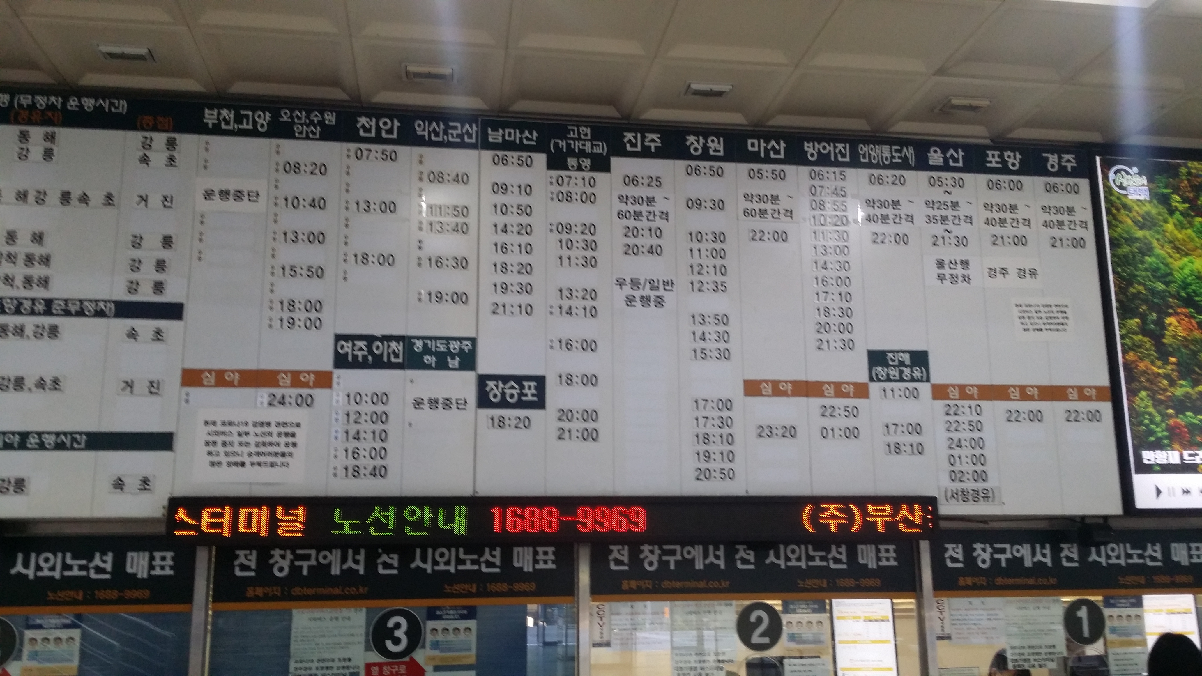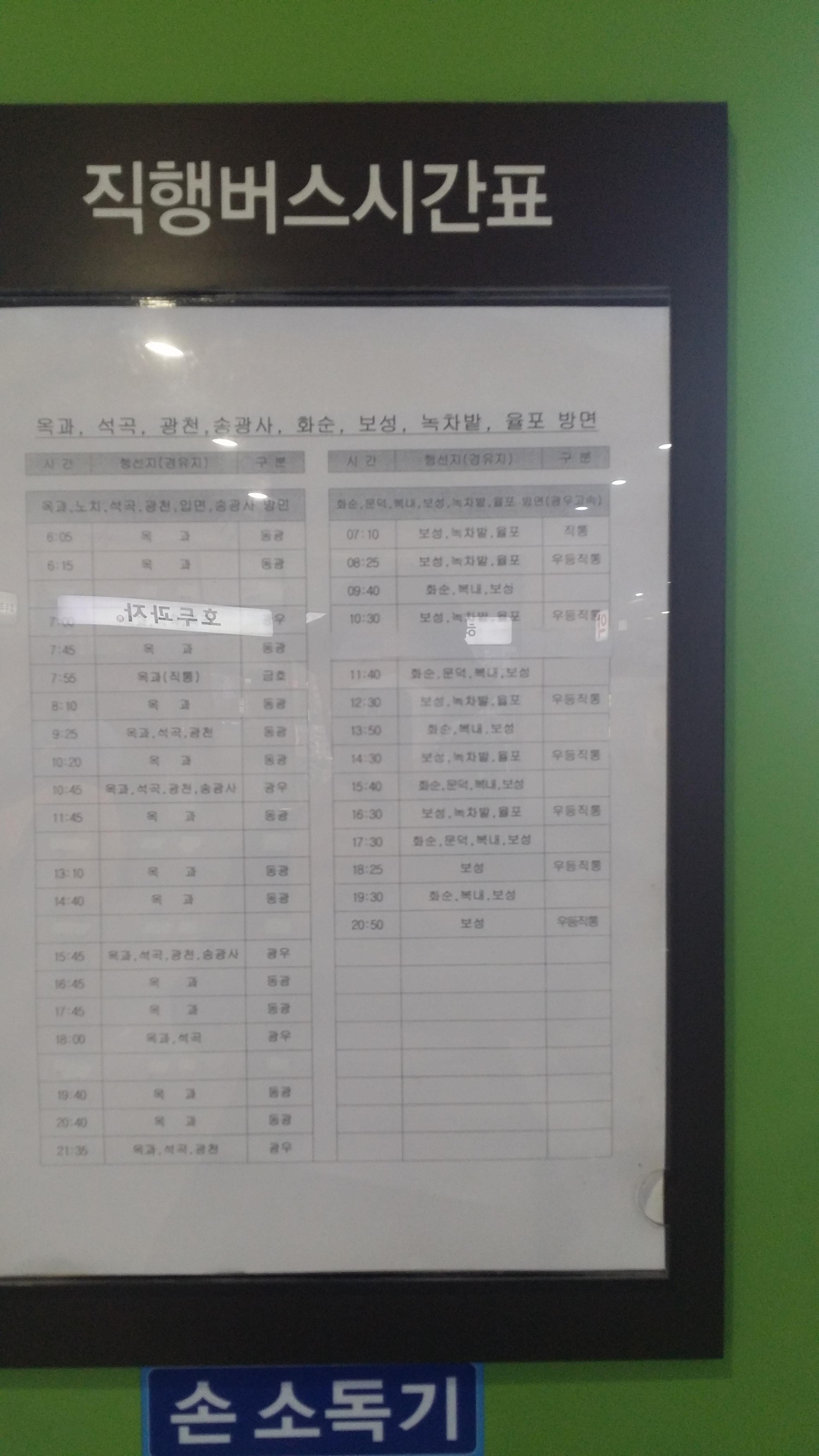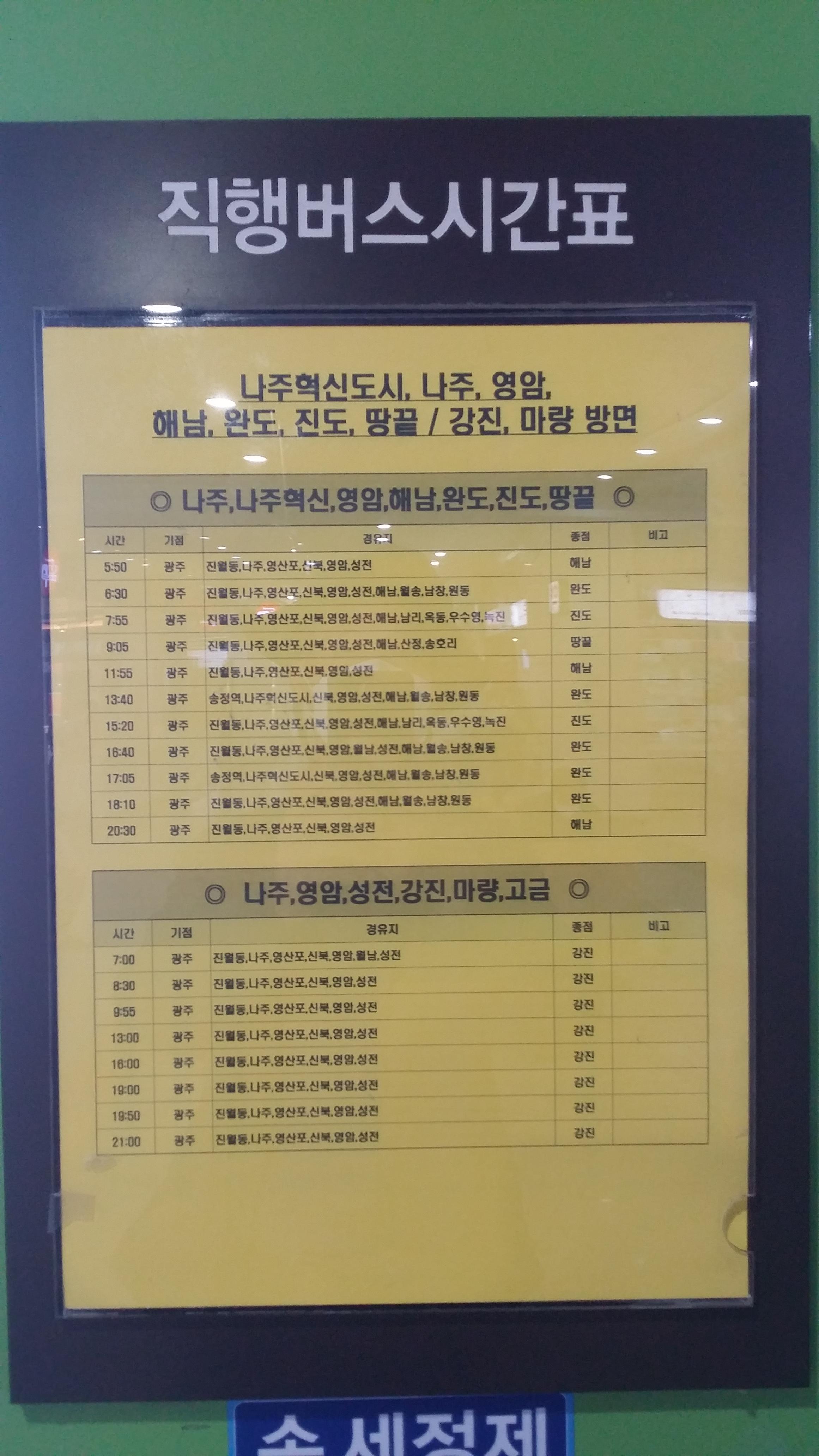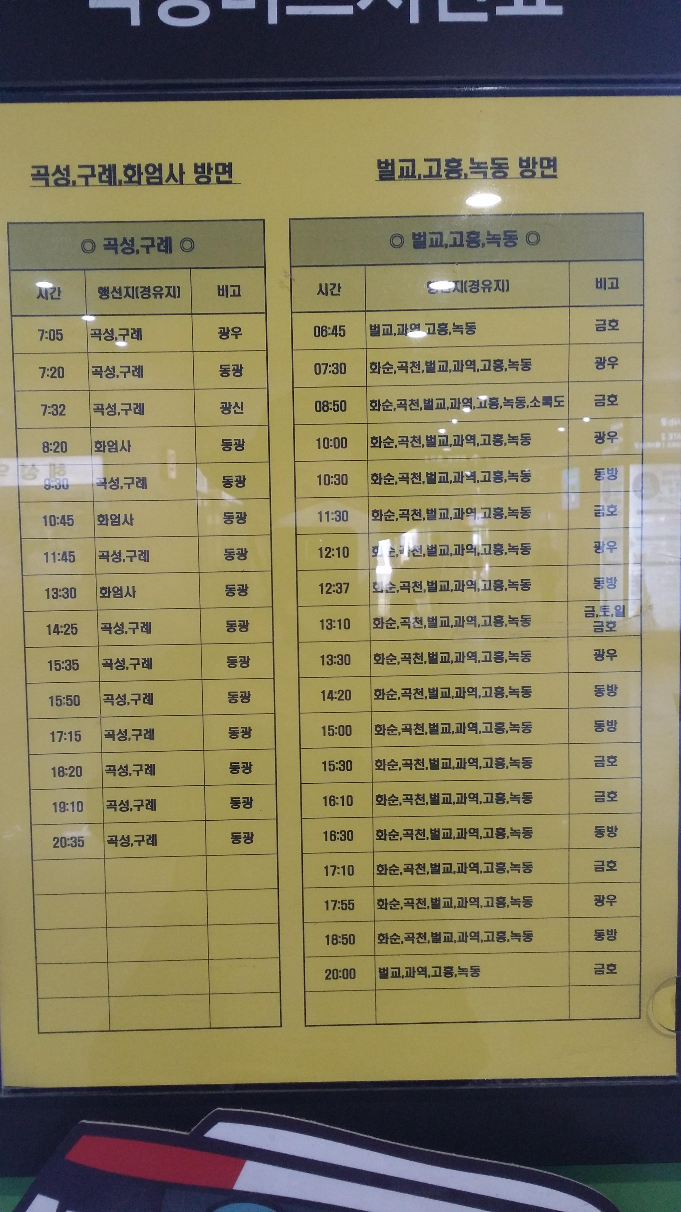 부산 동부버스터미널 / 부산에서 목포로 가는 방법은 직통 및 광주 경유 방법이 있다. 직통는 서부터미널에서 경유는 동부와 서부터미널 두군데 가능한데 동부쪽이 이른 시간에 있어 후자를 택한다부산 동부터미널에서 광주까지는 2시간55분 + 휴계시간, 서부터미널은 2시간40분 + 휴계시간, 그리고 버스타고 예약앱는 출발 20전까지, 고속버스 예약앱은 출발 5분전까지 예약가능. 또하나 아침차는 휴계 시간을 철저하게 이용하고(기사 식사? / 15분 사용), 막차는 볼일만 보고(5분) 진행 / 고속버스앱 예상 소요시간(3시간)을 믿고 유달산 일정을 세웠는데, 광주에 9시30분에(3시간10분 소요) 도착하는 바람에 엉망이 되었다유스퀘어 광주종합버스터미널 시외버스 시간표다 / 목포행 버스가 평일과 공휴일을 구분하네 10시 출발버스를 타고 호남대터널 부분을 지날때 시간 체크를 해둔다(13분 소요). 시외버스를 탈때 항상 해두는 버릇이다. 요기 나중에 다 쓰임이 된다. 버스타고앱에서 광주~목포(50분), 목포~광주(1시간8분) 예상 소요 시간이 상이하여 기사님께 여쭈니 양방향 공히 55분 가량 걸린다네.