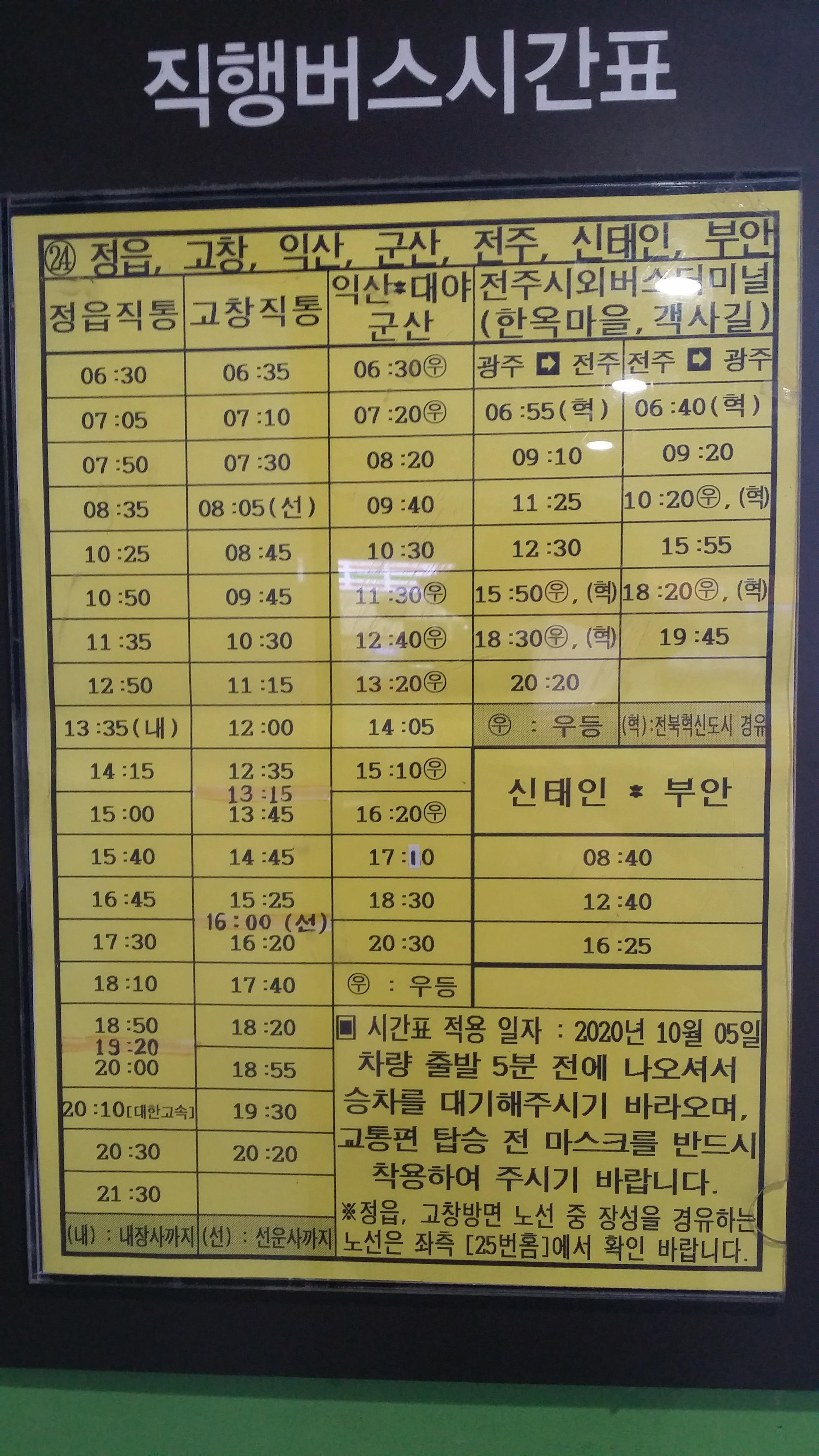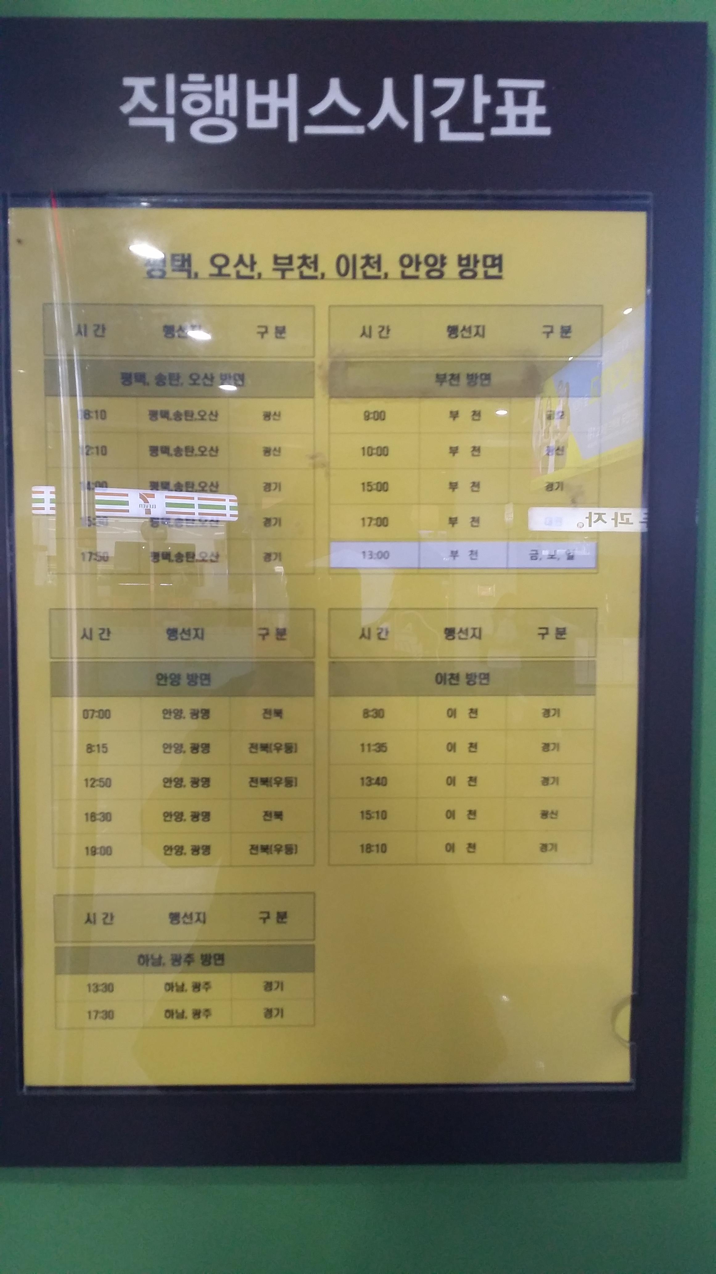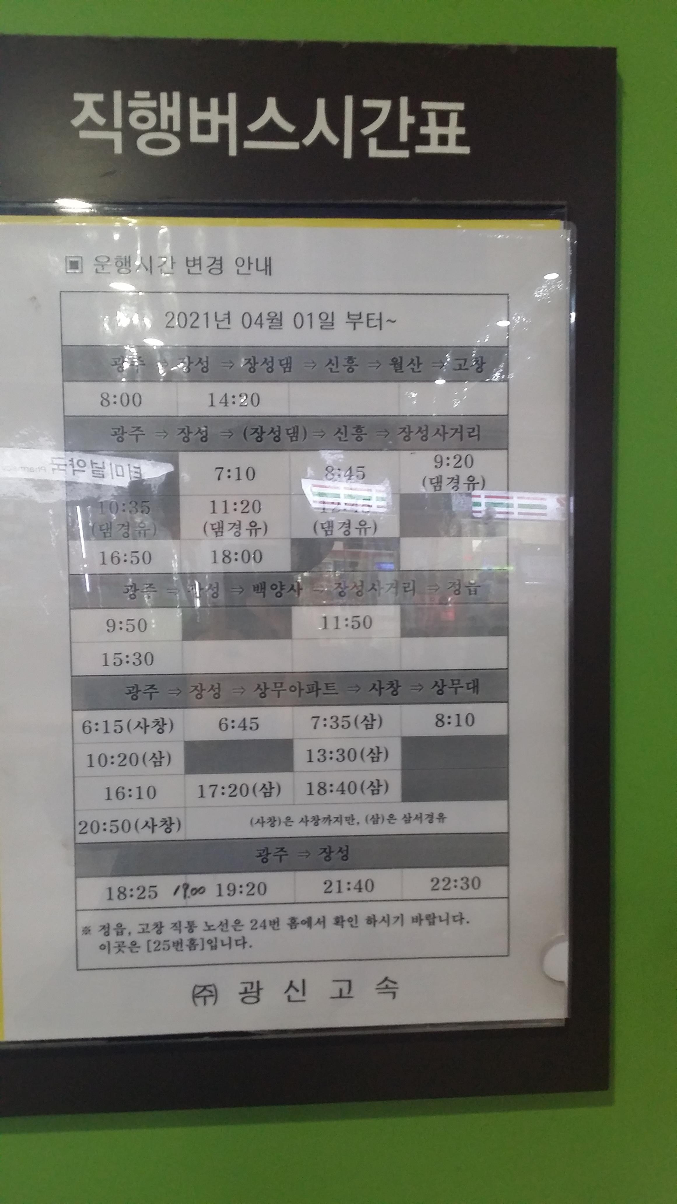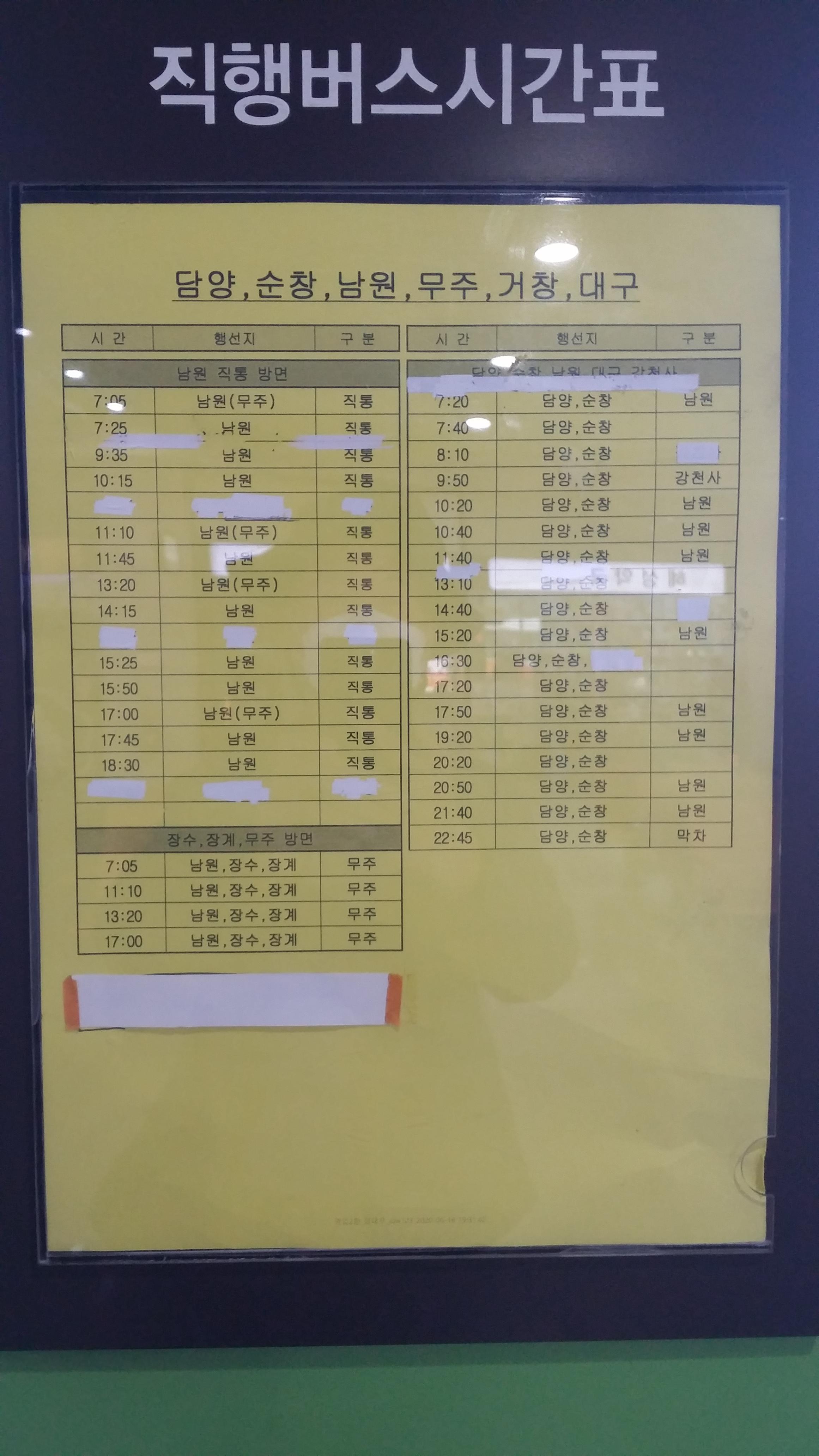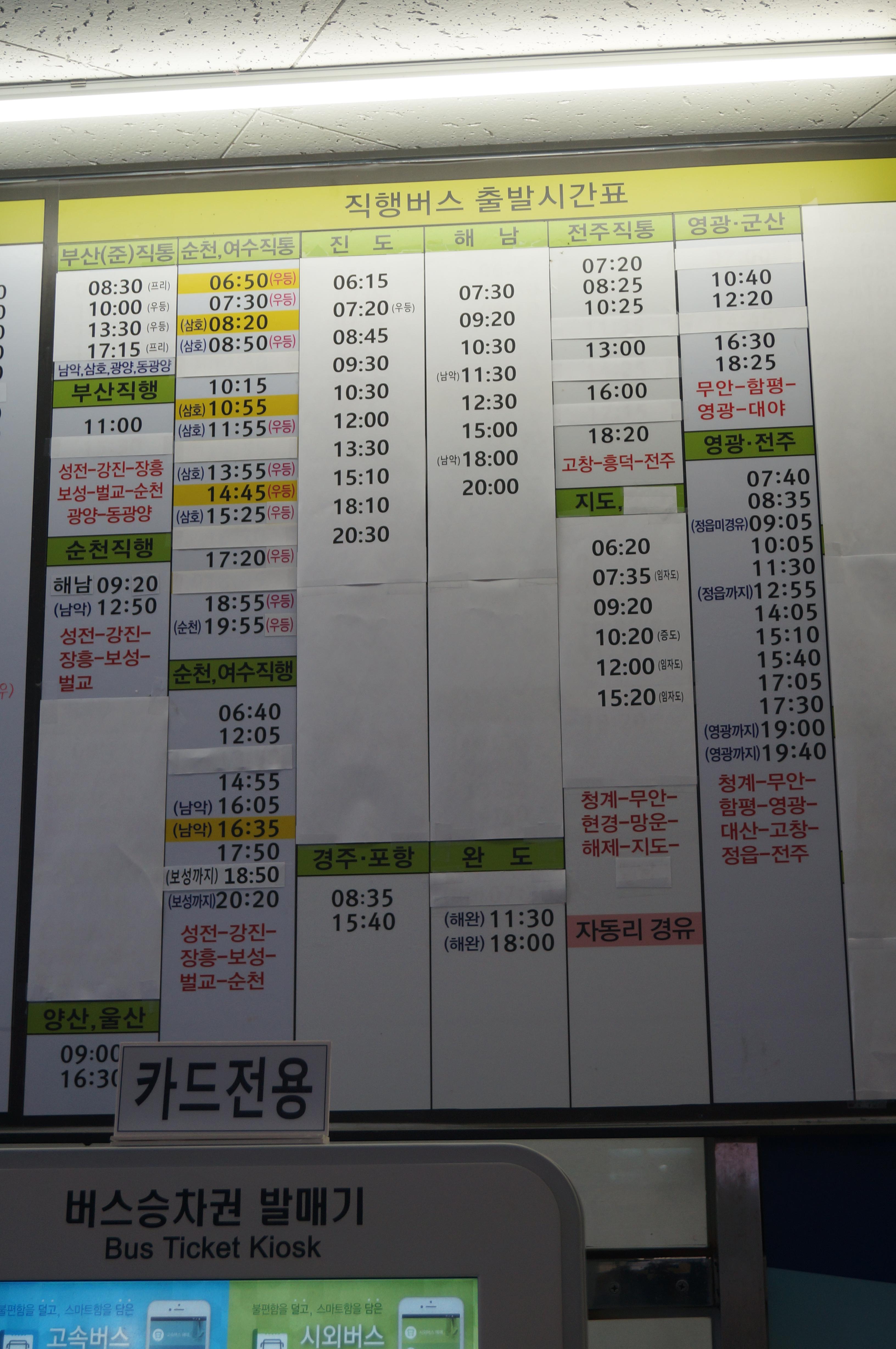 부산 동부버스터미널 / 부산에서 목포로 가는 방법은 직통 및 광주 경유 방법이 있다. 직통는 서부터미널에서 경유는 동부와 서부터미널 두군데 가능한데 동부쪽이 이른 시간에 있어 후자를 택한다부산 동부터미널에서 광주까지는 2시간55분 + 휴계시간, 서부터미널은 2시간40분 + 휴계시간, 그리고 버스타고 예약앱는 출발 20전까지, 고속버스 예약앱은 출발 5분전까지 예약가능. 또하나 아침차는 휴계 시간을 철저하게 이용하고(기사 식사? / 15분 사용), 막차는 볼일만 보고(5분) 진행 / 고속버스앱 예상 소요시간(3시간)을 믿고 유달산 일정을 세웠는데, 광주에 9시30분에(3시간10분 소요) 도착하는 바람에 엉망이 되었다유스퀘어 광주종합버스터미널 시외버스 시간표다 / 목포행 버스가 평일과 공휴일을 구분하네 10시 출발버스를 타고 호남대터널 부분을 지날때 시간 체크를 해둔다(13분 소요). 시외버스를 탈때 항상 해두는 버릇이다. 요기 나중에 다 쓰임이 된다. 버스타고앱에서 광주~목포(50분), 목포~광주(1시간8분) 예상 소요 시간이 상이하여 기사님께 여쭈니 양방향 공히 55분 가량 걸린다네.