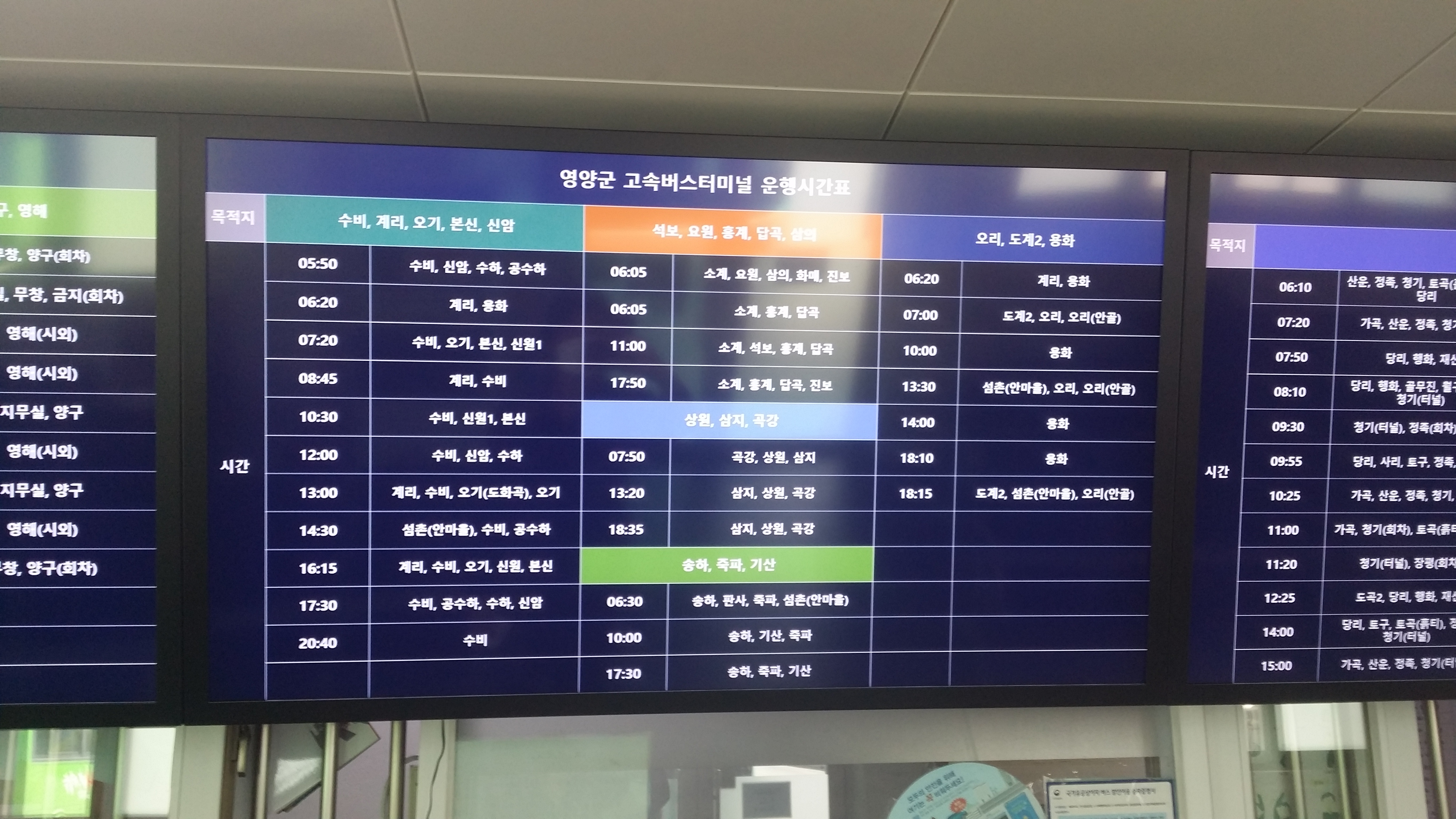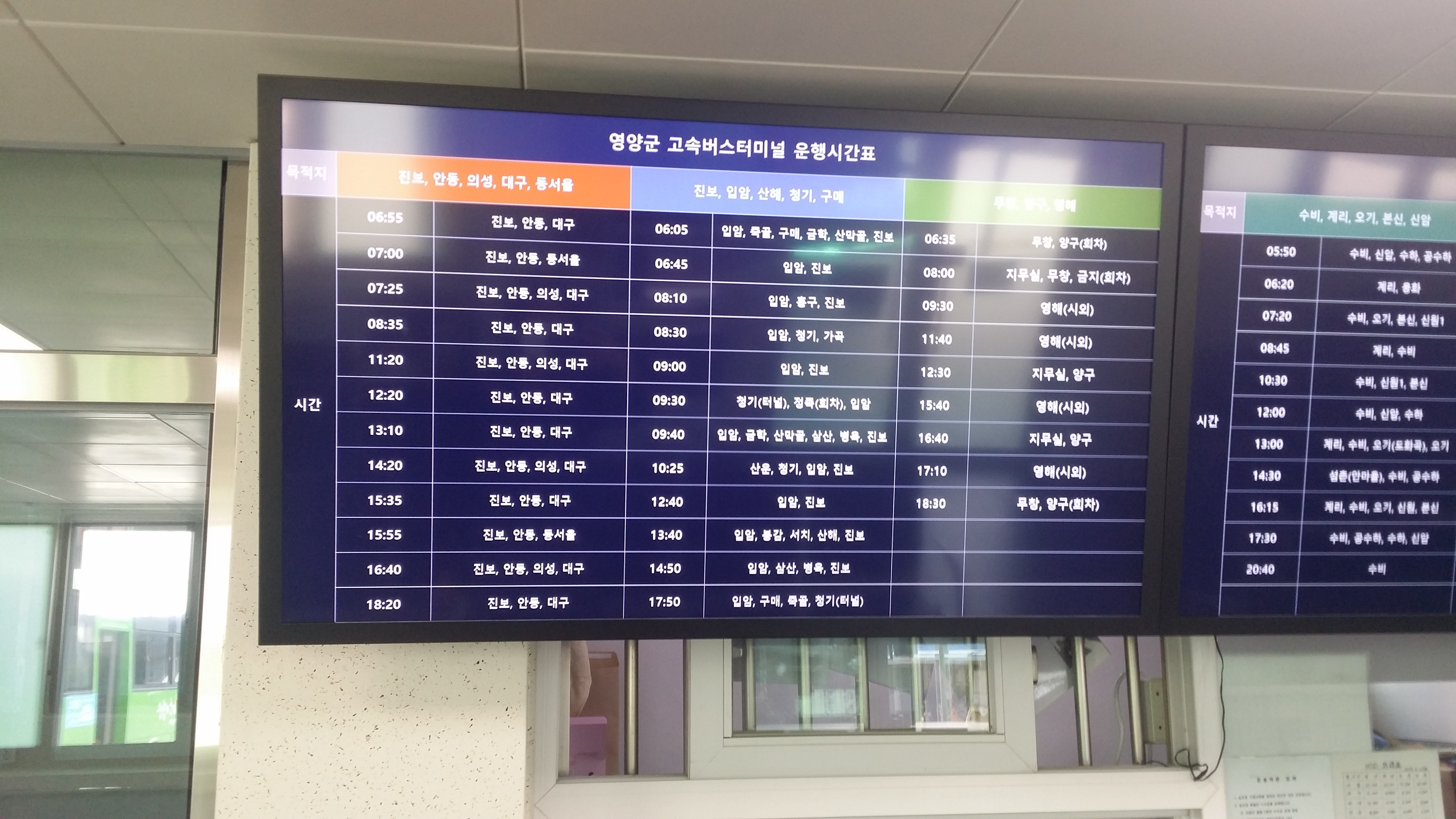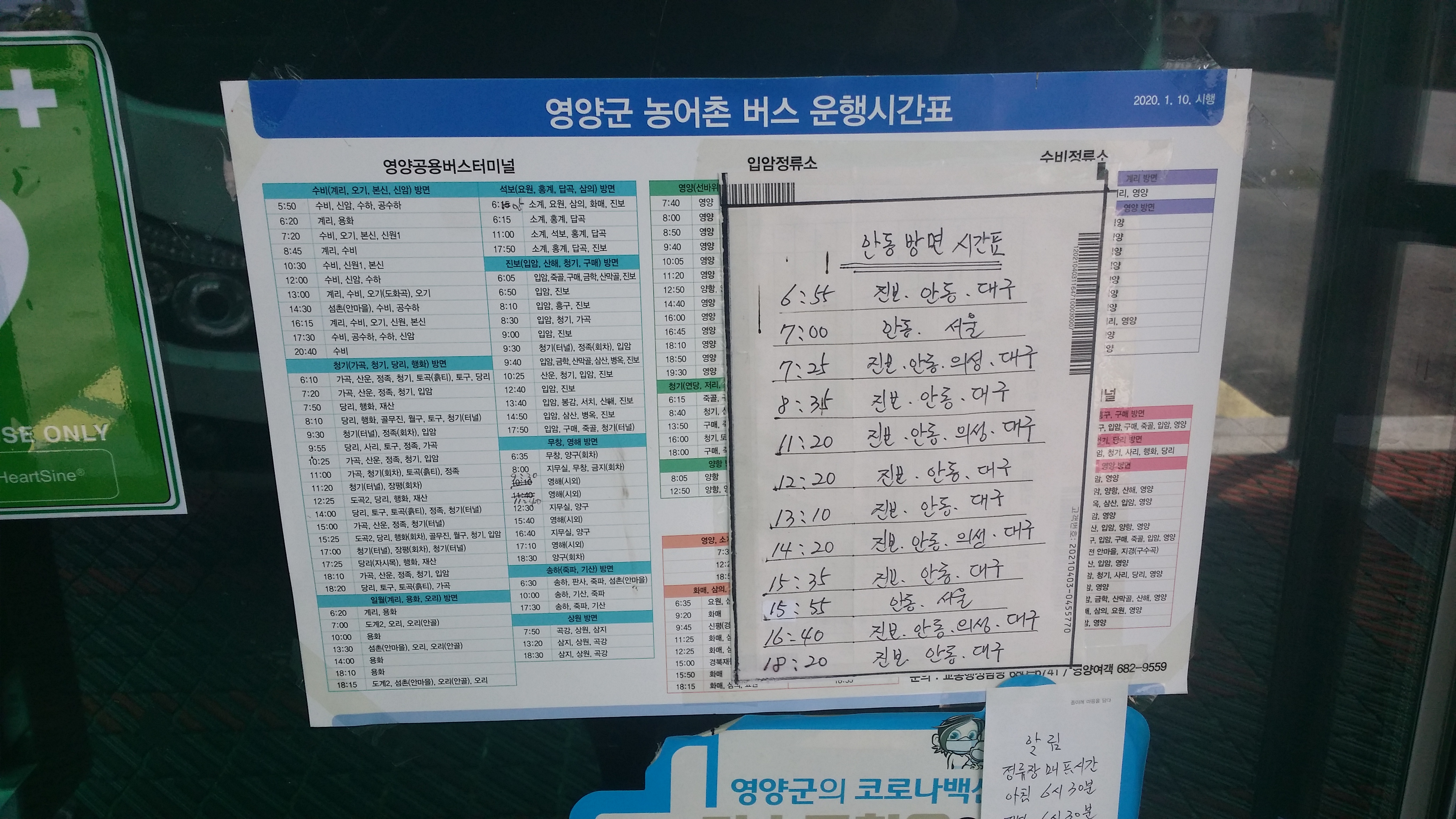 우측으로 안동역과 시내로 들어가는 버스 정류소가 있으며길건너에 옥동방면 정류장과길건너에 송현방면 정류장이 있다10시45분 영양행 버스에 올라 11시38분 진보에 도착하여 11시40분 출발한다12:05 영양에 도착했다조금 일찍 도착했으면 컵라면에 김밥을 곁들여 먹었을텐데, 여유가 없어 생수에 김밥을 허겁지겁 먹는다12시25분 출발해야할 버스가 꿈틀거리며 27분 터미널을 나선다. 이유가 있었다 운전사가 사적인 일로 북부정류장에 세우고 전화를 한다. 미련곰탱이들이 엉뚱한데서 기다려 2분을 더 소비하고 2명을 태우고 출발한다. 독골에서 17시24분경 버스를 탈려면 바쁜데, 이것들이. 트롯트를 크게 틀고 운전에 집중하는게 아니라 유람을 떠나는 관광버스마냥 떠들어댄다. 와 열받네. 2명 차비도 안받았으니 업무상 횡령 혐의로 고발해, 녹취도 해놓았는데, 인생이 불쌍하여 봐준다 13:06 논골정류소 못미쳐 고개 정상에 세워준다