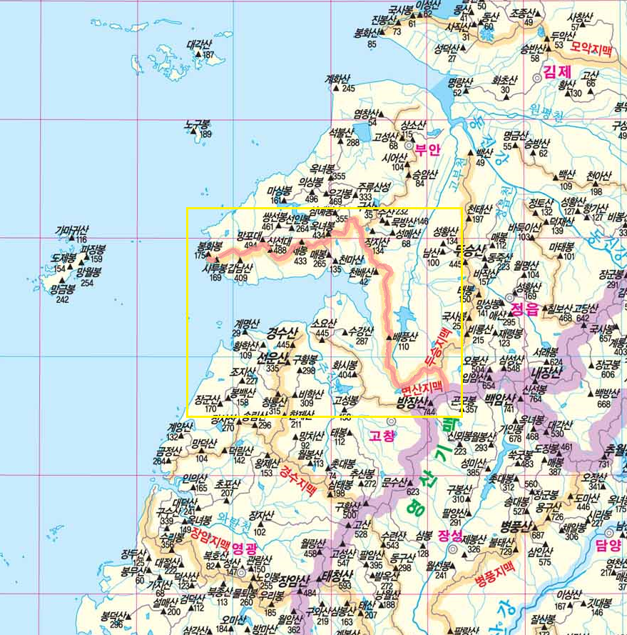 변산지맥(邊山枝脈)은 영산기맥의 장성갈재에서 서쪽으로 약1.7km 떨어진 방장산(733.6m)에서 북쪽으로 분기하여