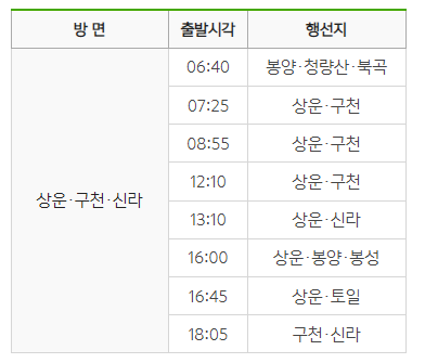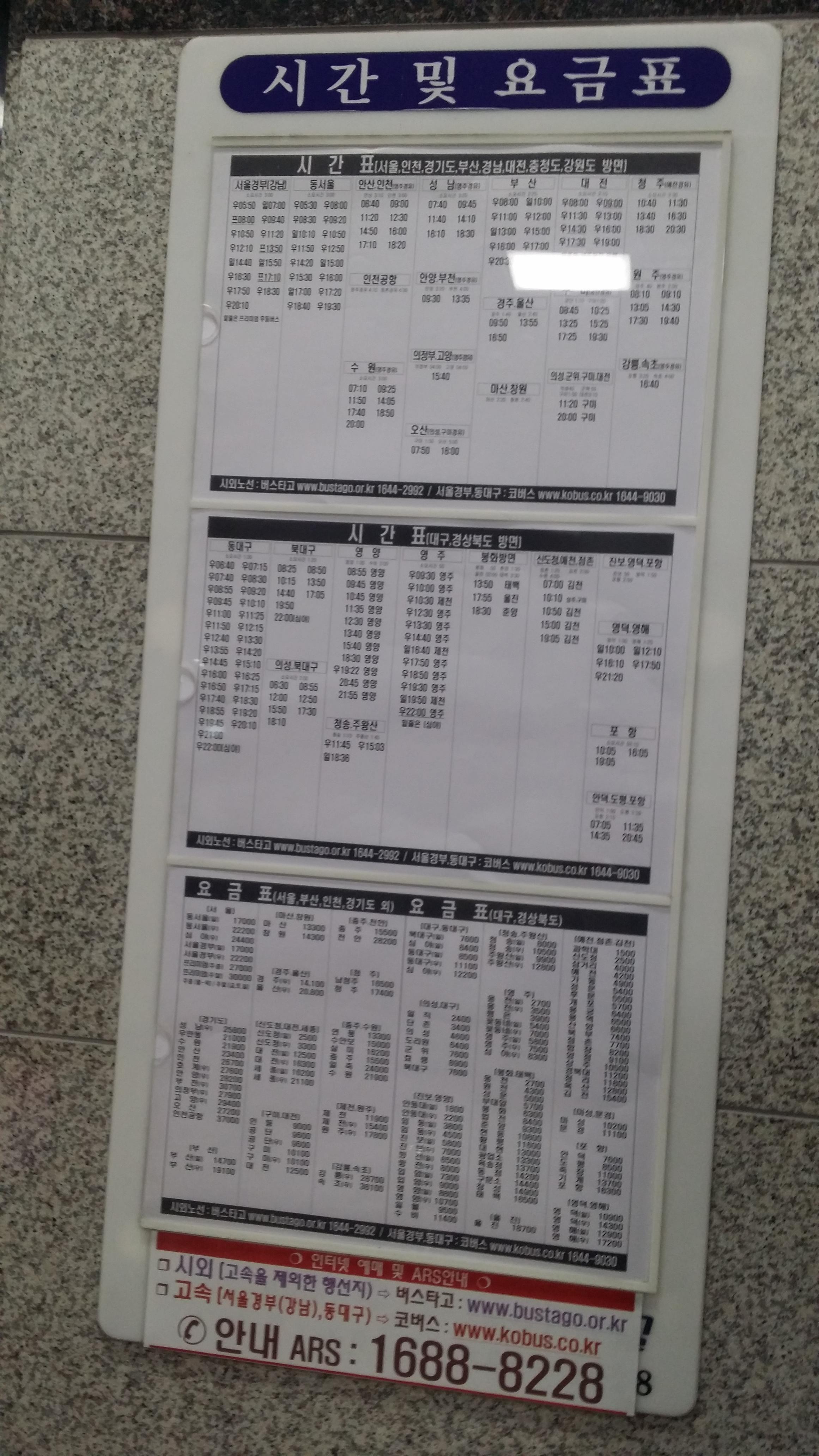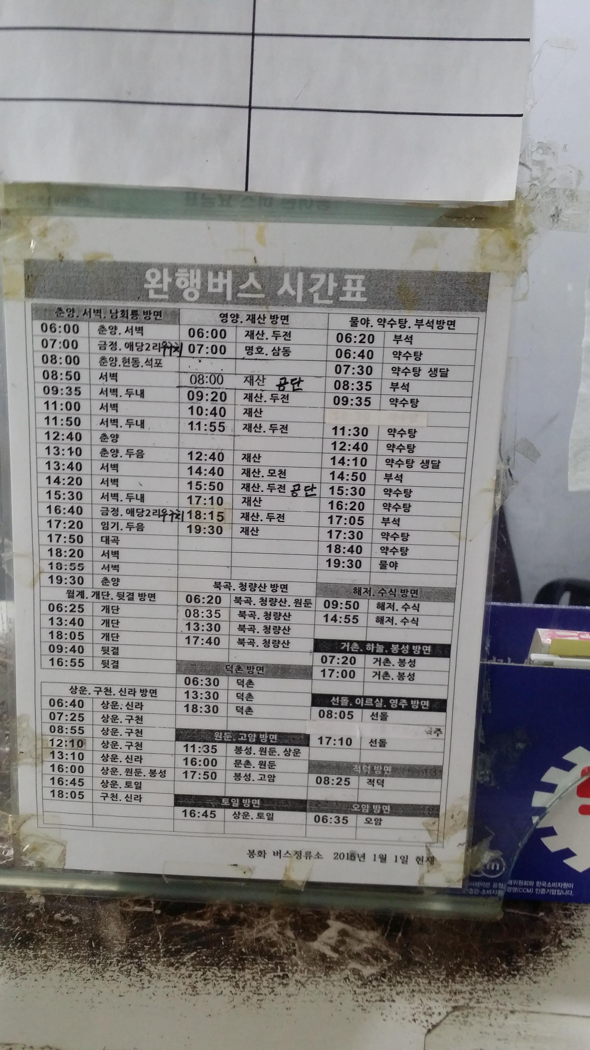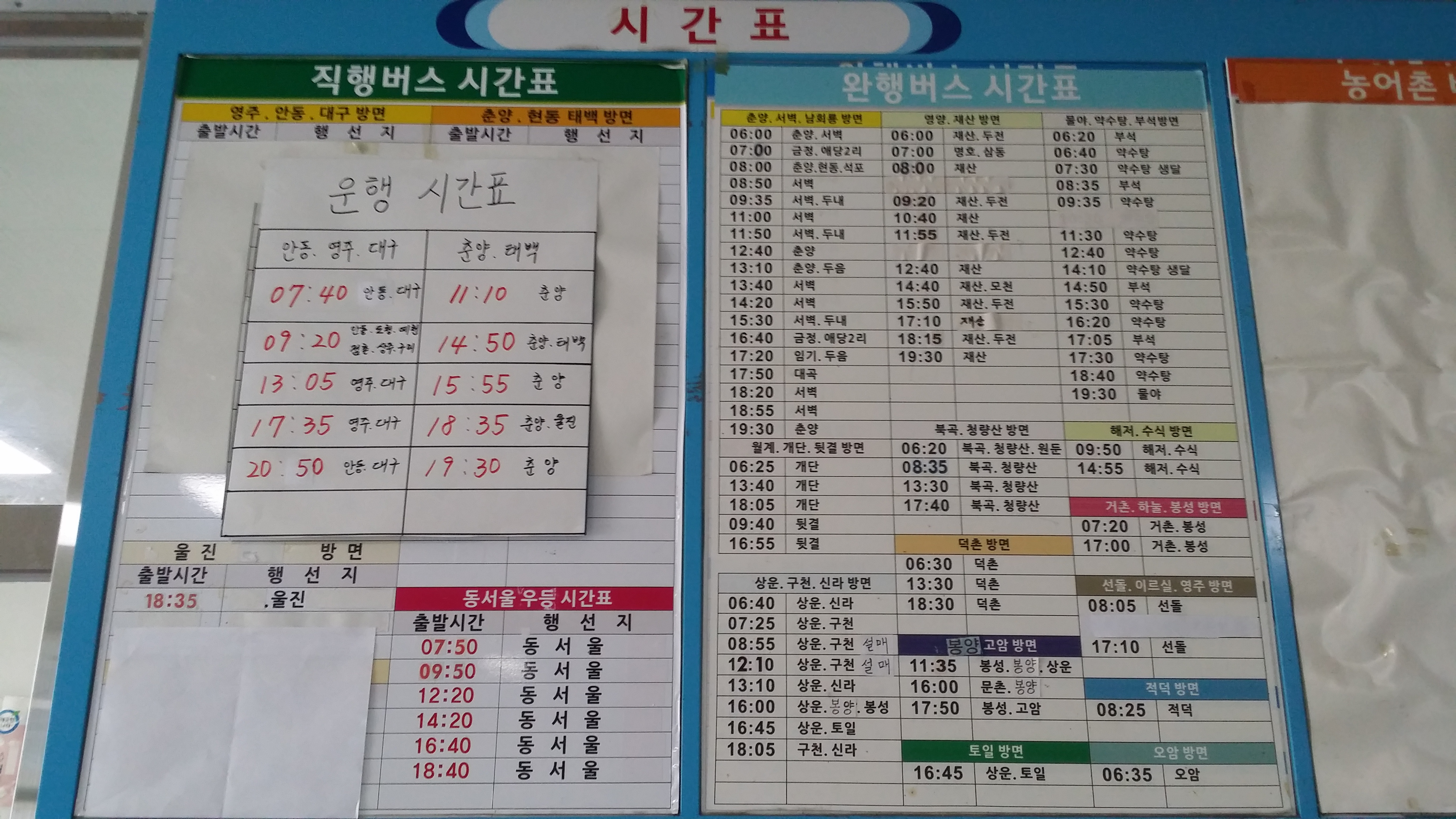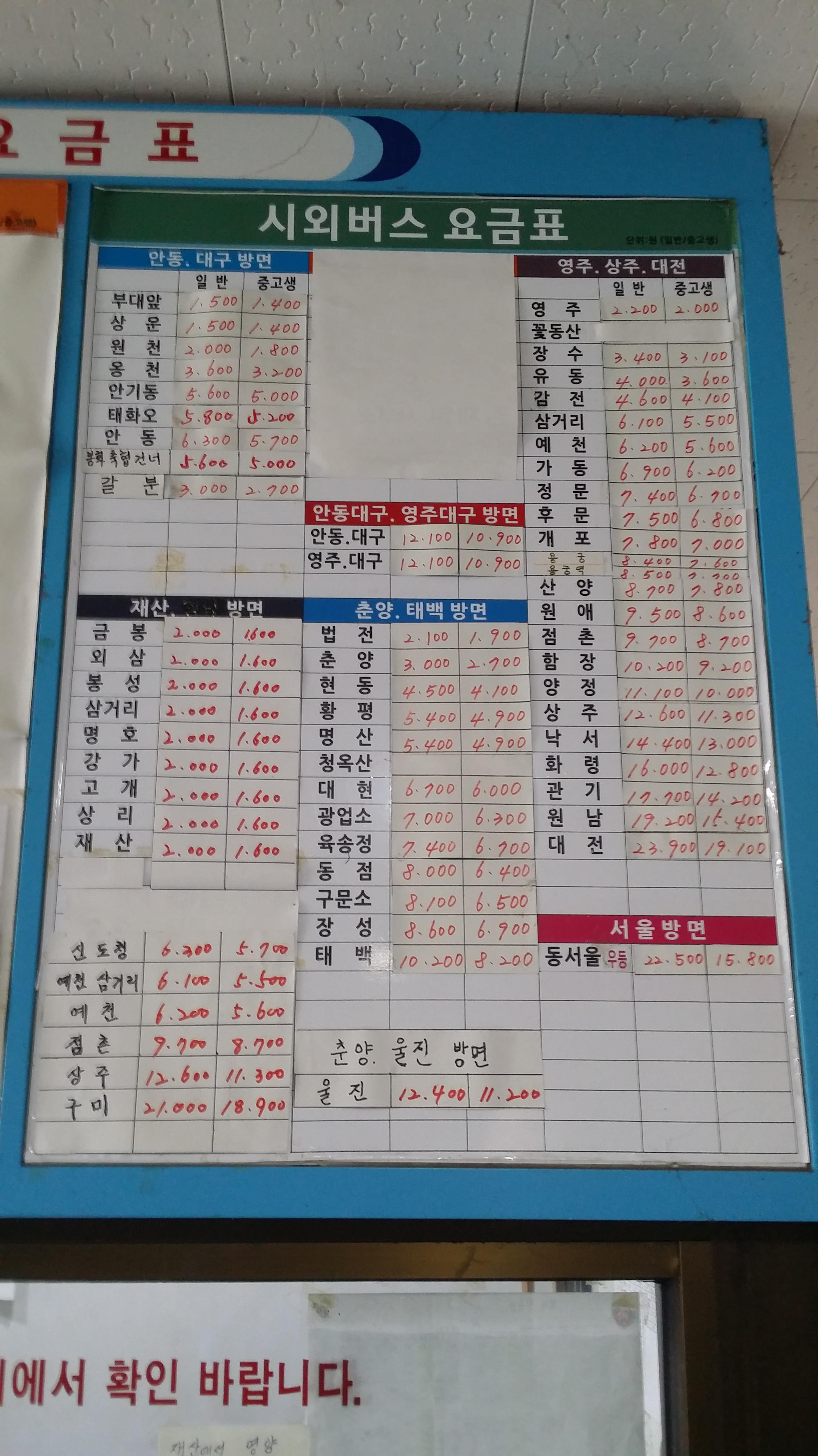 12시20분 영주여객 출발 버스를 놓치고, 다음 시간대를 알수없어 조마조마 합니다. 언놈인지 버스 도착 알림판엔 봉화행 33번 버스가 올라왔다 사라졌다 몇번 반복하더니 12시40분 버스가 차고지를 출발합니다.참고로 13시에 봉화행 버스가 있더군요. 12시42분 상가시장에서 봉화행 33번 버스를 환승하는데 1100원을 찍네요 전엔 무료 환승한것 같은데영주 시내버스 시간표(일부)우째던 봉화터미널에서 신라가는 13시10분 버스를 탈수 있게끔 13시3분 봉화우체국에서 하차하여 터미널로 향합니다 20시50분 안동가는 버스가 예전엔 옹천을 경유 했는데, 매표소에서 변동사항이 있는지 확인 안한게 나중에 심장 쪼리게 했습니다