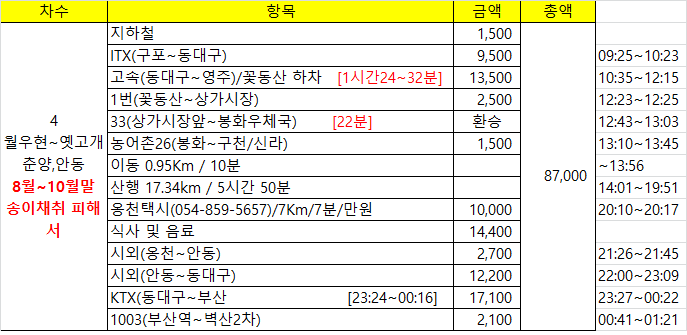 19:25 봉수산(△/570m/용암지맥 분기점) 맥길 야간 산행은 쥐약이다. 오늘 일몰이 19시19분. 20분은 렌턴없이 견딜수 있다. 마음이 급하다 보니 삼각점 찾는것도 잊어 버렸다19:40 송이산막19:51 옛고개 / 택시부터 부르고 매점을 이용하여야 하는데, 물이 워낙 급해 맥주1캔과 생수 500ml를 한방에 조지고 19시55분 옹천택시(054-859-5657)를 호출한다. 5분 거린데 20시10분경 택시를 타고 20시17분 옹천에 도착하니 부산행 막차(20시10분)는 벌써 떠났다. 9030원 나왔는데 4만원만 거슬러주네. 이시간에 와준것만도 고맙는데, 따지지 않았다 참고로 옛고개 휴계소에서 옹천까진 도보로 6.6Km/75분 소요 예상된다영주~예고개 : 20분, 옛고개~옹천 : 7분 예상 / 적어도 19시17분까진 도착하여야 하는데몇집 안되는 시골바닥에 이시간에 식사가 된다는게 그나마 다행인게 선택의 여지가 없다. 3년전에 21시20분에 지나가던 버스가 올 생각을 안한다 분명 봉화에서 20시50분에 안동, 북대구 가는 시간이 있었는데, 그사이 변동이 생겨 옹천을 경유 안하는게 아닌지 별의별 생각이 다 떠오르네. 21시26분 버스가 도착한다. 현금이 필요하다. 카드 단말기 안되어 안동터미널에서 환전하여 지불 안동에서 22시 심야버스를 타고 23시9분 복합환승센터에 도착했다. 열씸히 달리며 SRT 예매앱을 구동하는데, 동대구역 구내 Wi-Fi가 통신 간섭을해 앱이 다운. 23시12분 부산행 SRT 열차에 도착하여 승무원에게 열차내에서 티케팅 가능하냐 물으니 150% 받는다네. 베부르구만. 일이 안될려니 또 판단미스 다음차를 타느냐, 구포 경유 차를 타느냐, SRT를 타느냐 고민하다 빠르고 비싼놈 탔는데, 부산역에 도착하니 집으로 가는 심야버스가 SRT를 타고와도 될 정도로 기다려야 했다