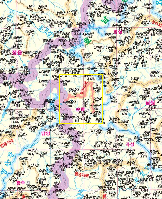 무이지맥(武夷枝脈)은 호남정맥 광덕산(585.8m) 북쪽 300m 지점에서 동쪽으로 분기하여 무이산(557.2m), 건지산(411.9m), 장덕산(297.5m), 대동산(160.8m)을 지나 순창군 유등면 내이마을앞 경천(鏡川)이 섬진강에 드는 합수점에서 끝나는 도상거리 30.3km 되는 산줄기로 경천의 우측 분수령이 된다.