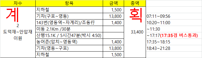 16:27 심하네 우측 인삼밭으로 우회하니 벌초로 등로가 좋아진듯하더니 더엉망이다16:34 안압재 / 오늘은 여기까지16:41 압치버스정류소 햇볕이 따가워 무주방면 정류소에서 버스를 기다린다. 건너편에 수돗가가 있어 도둑질한다 버스는 종점에서 약 10분후 도착하기에 55분을 기다려 17시35분 버스에 오른다18시8분 영동역에 하차하여 편의점에서 라면으로 떼운다. 시원한 맥주 한잔이 그립다만 알러지 약을 복용하는 관계로 PASS