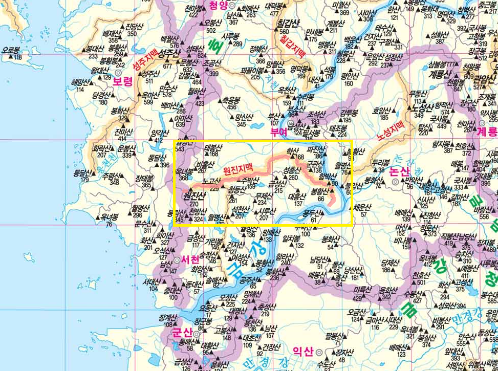 원진지맥(遠進枝脈)은 금북정맥 백월산(575.6m)에서 남쪽으로 38.5km 떨어진 신산경표 호서정맥의 부시치 고개와 놋점이고개 사이의 272.8봉에서 동쪽으로 가지를 쳐 원진산(遠進山.270m), 학산(鶴山.168.3m) 함박산(咸朴山.90.2m)을 지나 부여군 세도면 가회리에서 금강에 맥을 다하는 도상거리 38.1km의 산줄기를 말한다.