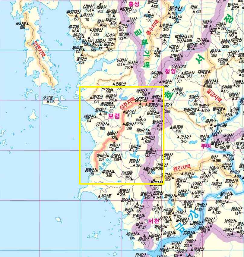 성주지맥(聖住枝脈)은 금북정맥의 백월산(白月山.576.5m)에서 남쪽으로 약 3km 떨어진 호서정맥의 623.7봉에서 남서쪽으로 가지를 쳐 성태산(星台山.632m), 문봉산(文奉山.632.33m), 성주산(聖住山.677m), 장군봉(582.6m), 성주산(聖住山.510.5m), 옥마산(玉馬山.599m), 봉화산(烽花山.329m), 잔미산(413.5m), 통달산(通達山.179.1m)을 지나 보령시 웅천앞바다 부사방조제앞까지 이어지는 산줄기로 웅천천의 좌측 분수령이 되는 도상거리 33.3km되는 산줄기다