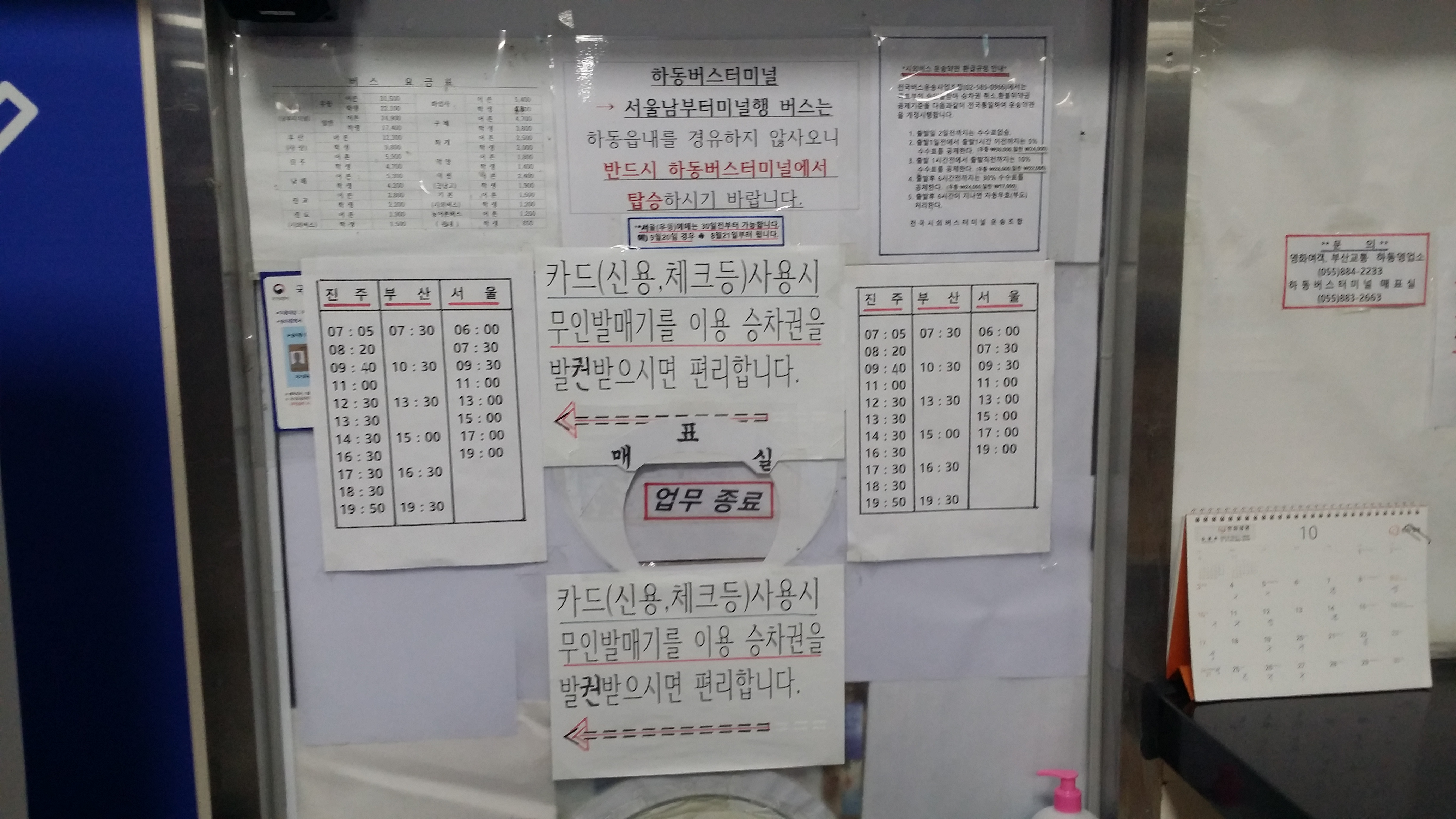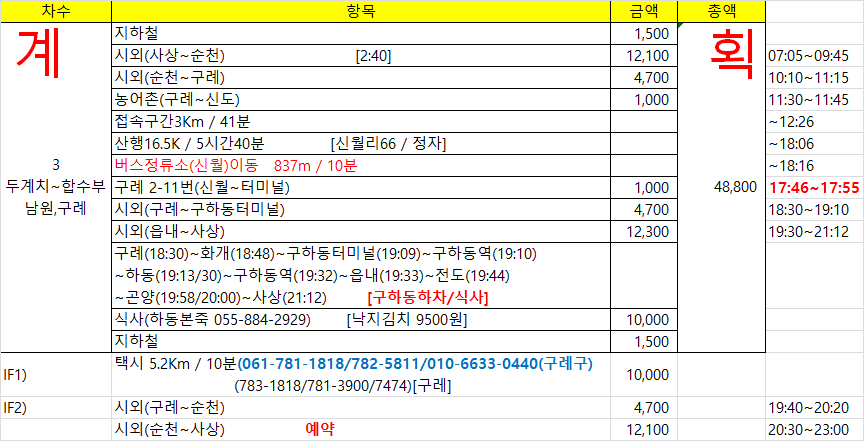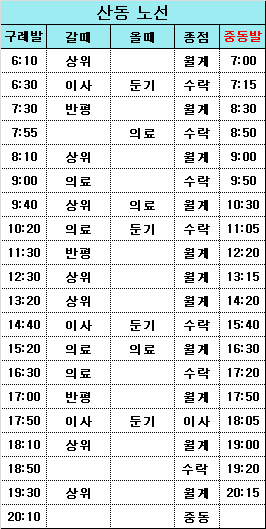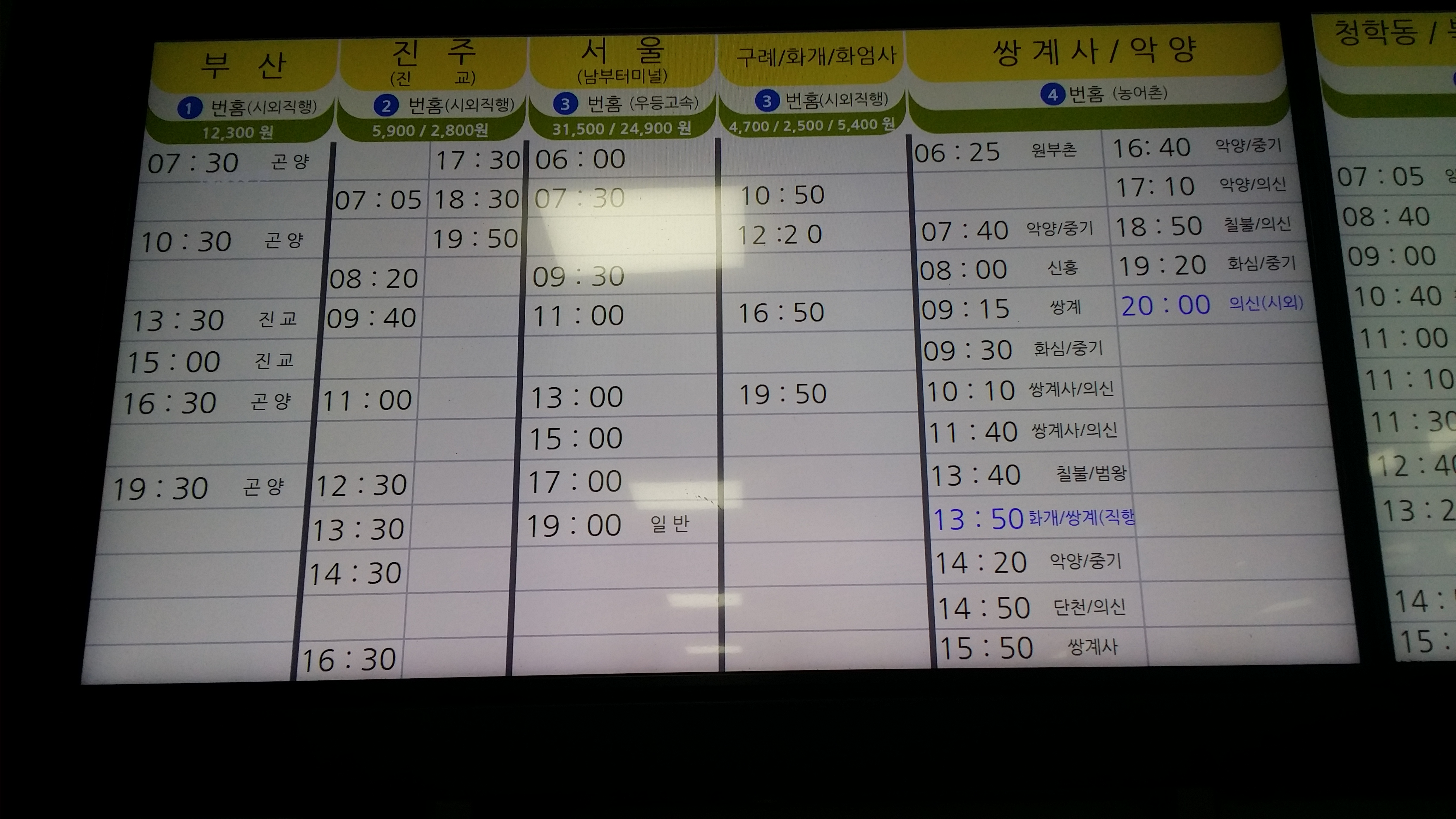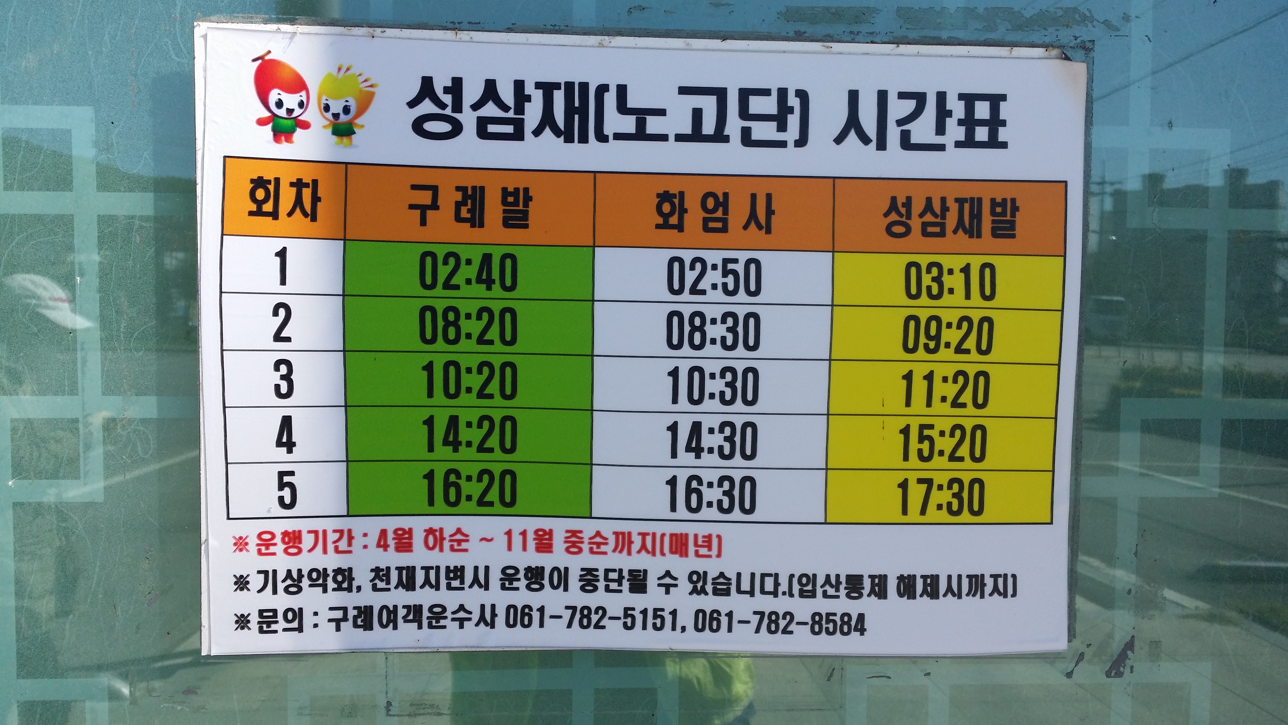 부산에서 구례가는 첫차가 8시30분에 있다 이놈을 타면 구례에 11시30분 이후로 도착한다. 11시30분 산동방면으로 진행하는 농어촌 버스를 타야 부산오는 막차를 탈수 있기에 순천으로 이동하여 다시 구례로 이동하는 방법을 택한다때이른 10월에 전국이 한파 특보가 발효중이다. 25,6도를 유지하던 기온이 갑자기 곤두박질쳤다. 거기다 바람까지 분다.7시5분 버스를 타고 순천으로 이동한다순천방면 버스는 섬진강휴계소에 꼭 들린다. 사상에서 출발한 버스가 동광양에서 순천으로 출발하는 시간을 너무 여유롭게 잡았기에 15분간 휴식을 잡아야 한다순천에서 10시10분 구례행 버스에 오른다10:17 북부정류소(전남 순천시 매곡동 121-5)을 지나10:38 괴목(전남 순천시 황전면 괴목리 463)을 경유10:50 구례에 도착했다11시30분 월계행 버스에 오른다