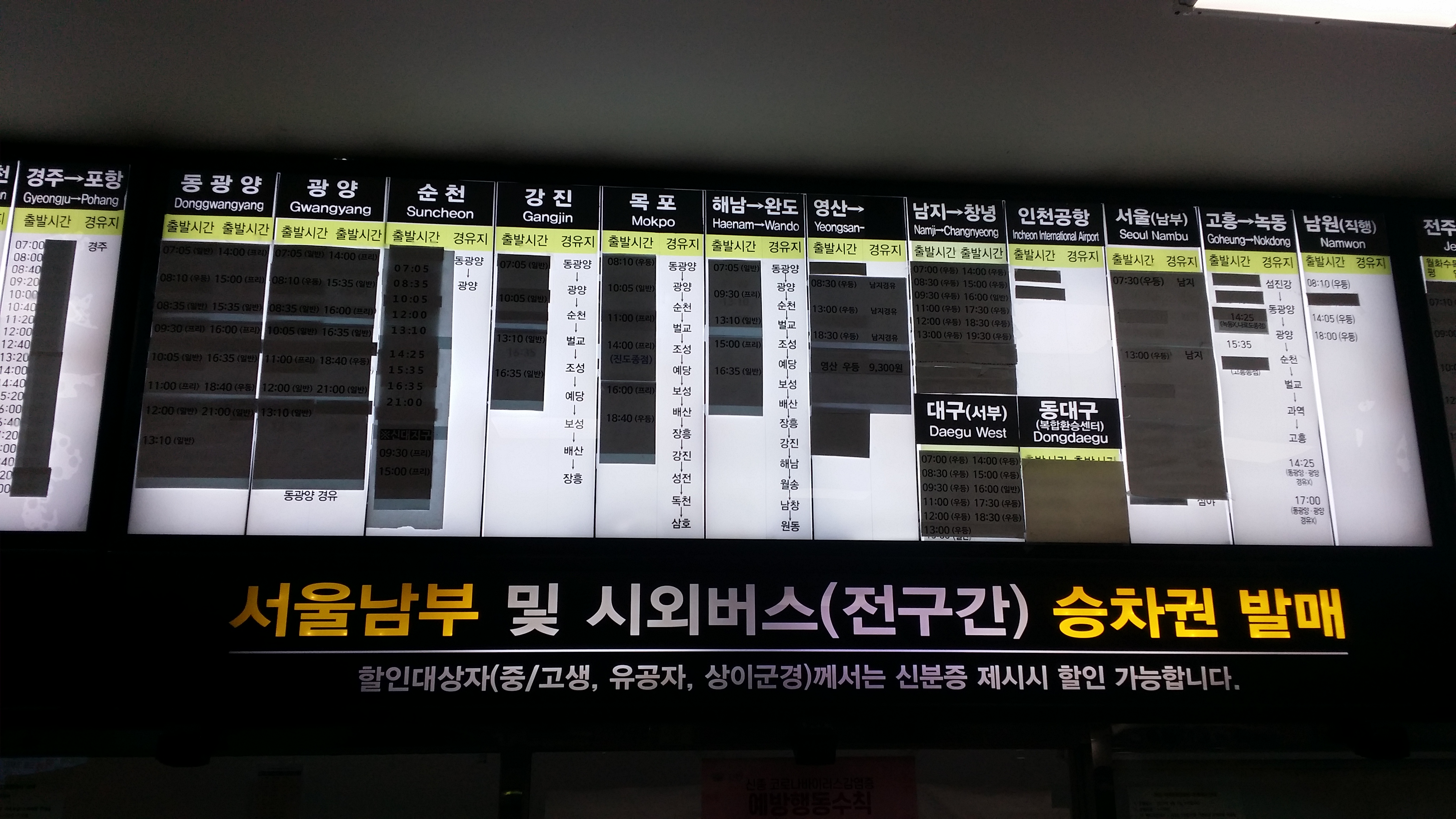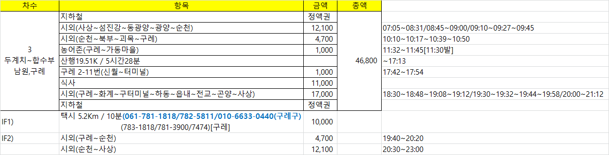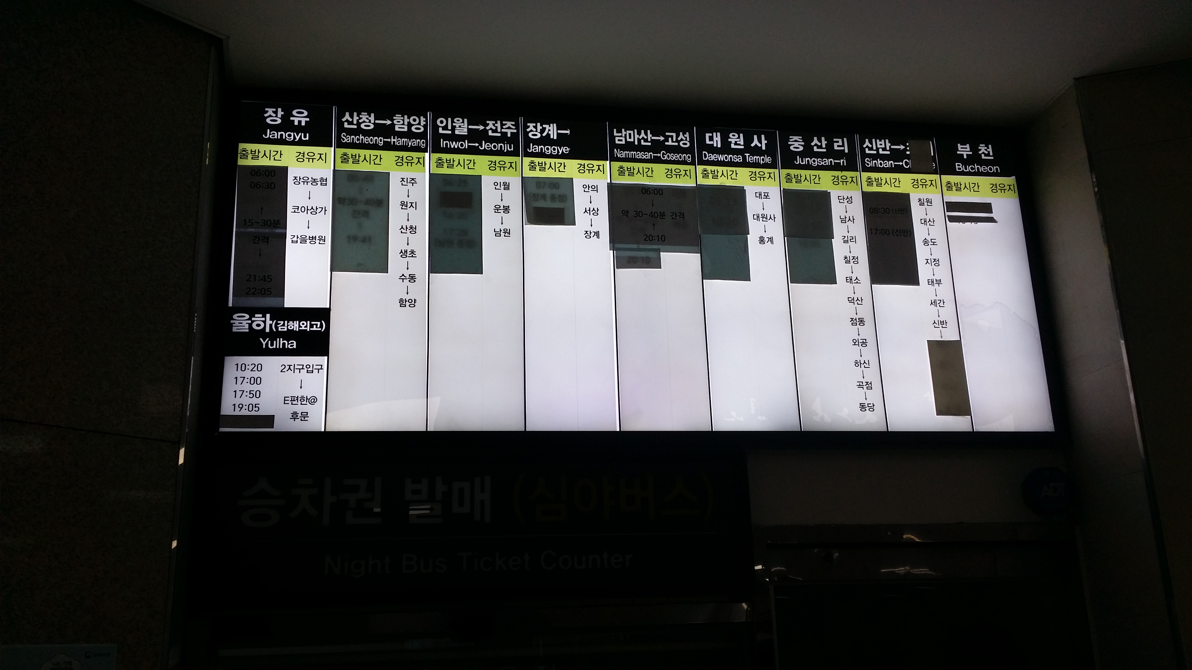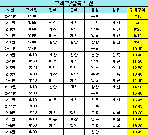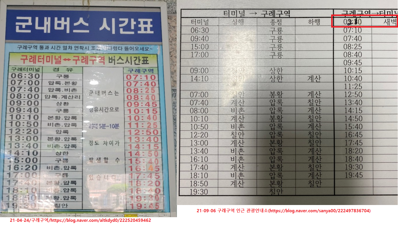 부산에서 구례가는 첫차가 8시30분에 있다 이놈을 타면 구례에 11시30분 이후로 도착한다. 11시30분 산동방면으로 진행하는 농어촌 버스를 타야 부산오는 막차를 탈수 있기에 순천으로 이동하여 다시 구례로 이동하는 방법을 택한다때이른 10월에 전국이 한파 특보가 발효중이다. 25,6도를 유지하던 기온이 갑자기 곤두박질쳤다. 거기다 바람까지 분다.7시5분 버스를 타고 순천으로 이동한다순천방면 버스는 섬진강휴계소에 꼭 들린다. 사상에서 출발한 버스가 동광양에서 순천으로 출발하는 시간을 너무 여유롭게 잡았기에 15분간 휴식을 잡아야 한다순천에서 10시10분 구례행 버스에 오른다10:17 북부정류소(전남 순천시 매곡동 121-5)을 지나10:38 괴목(전남 순천시 황전면 괴목리 463)을 경유10:50 구례에 도착했다11시30분 월계행 버스에 오른다
