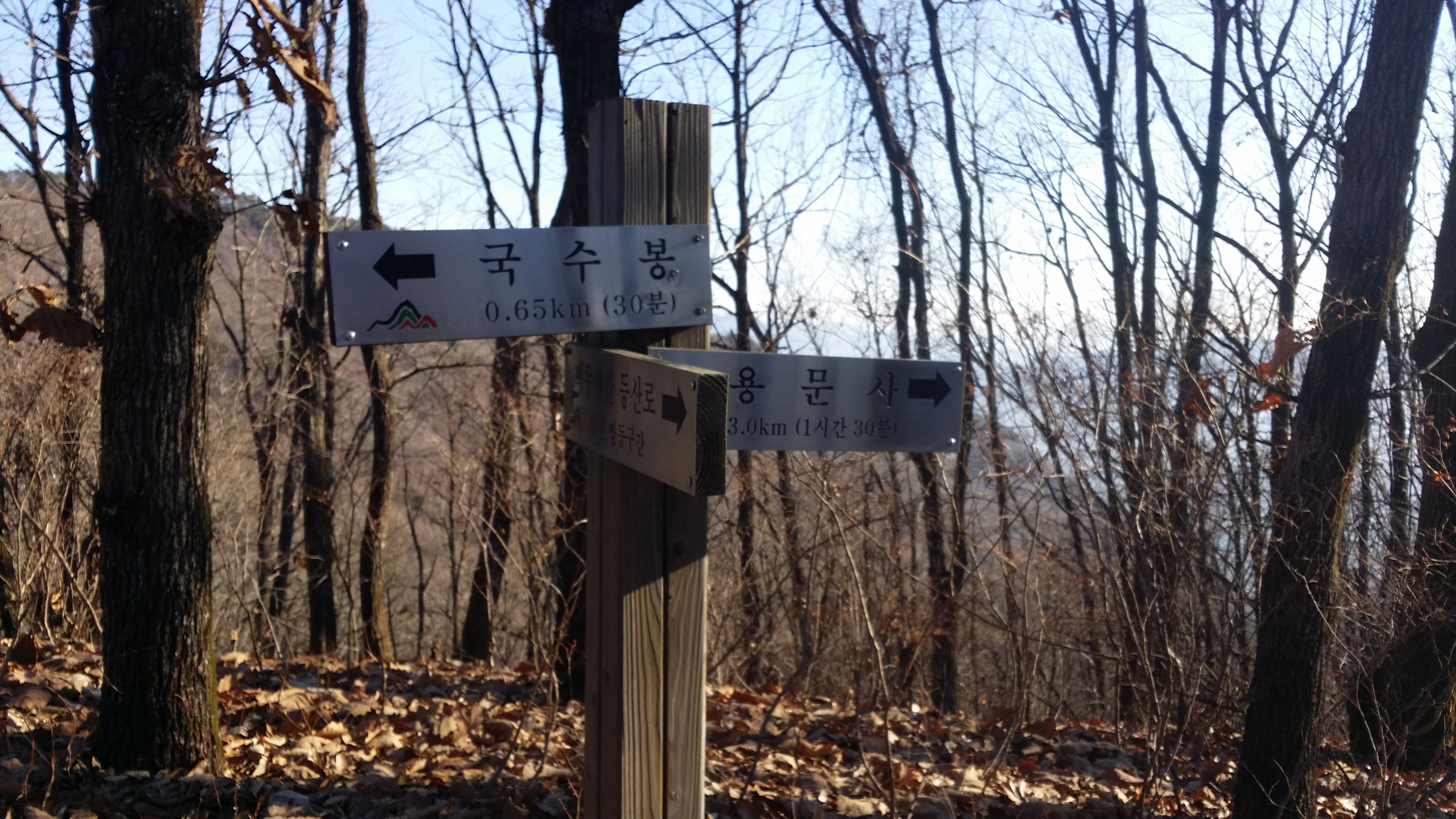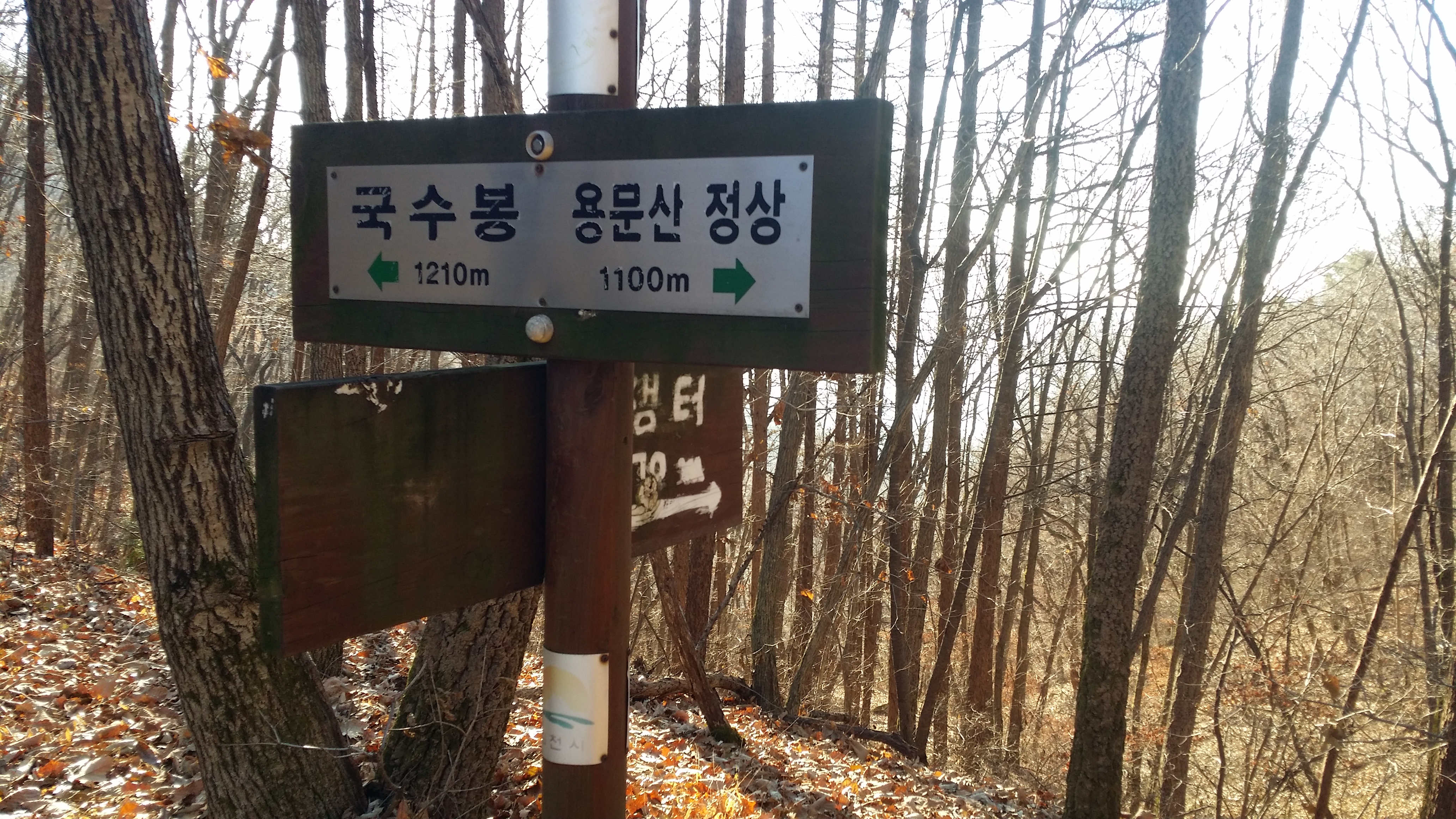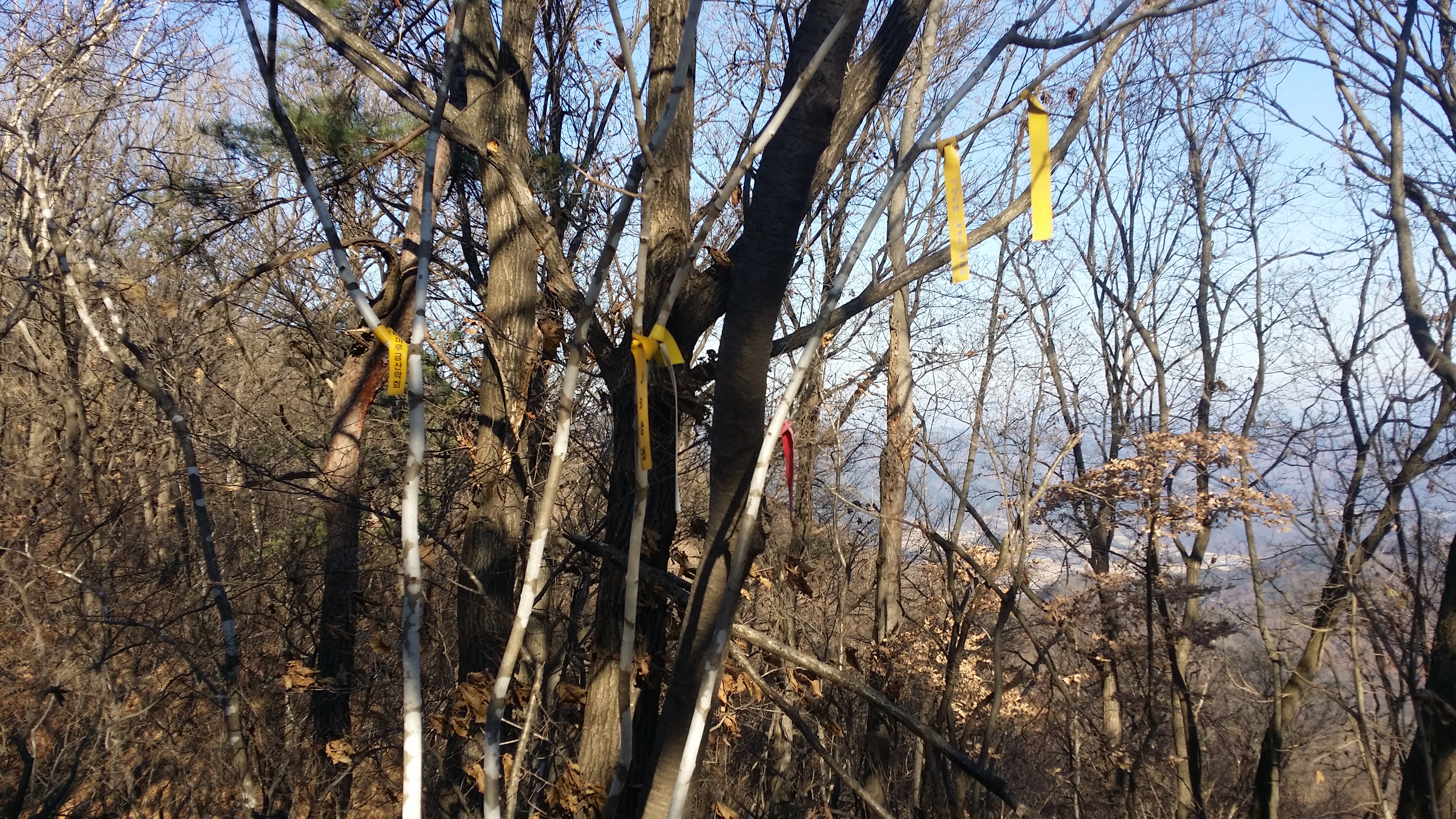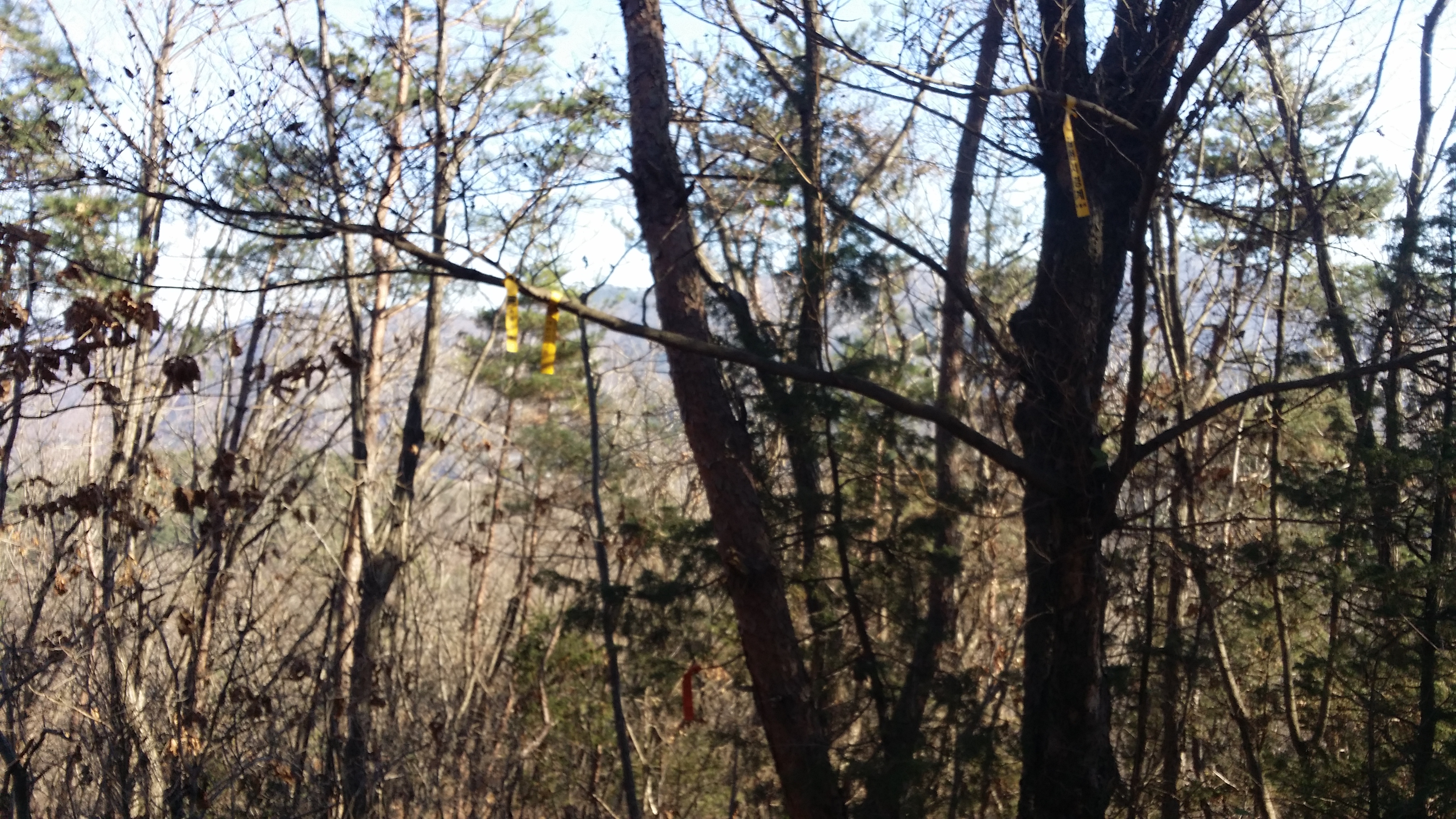 (463.7봉에서) 기양산15:33 산태백(296.3m)15:42 356.9봉15:55 갈림길 / 맥길은 저 두개의 시그럴 방향이 아니라 시그럴이 없는 우측길을 택합니다15:58 산태백재 / 오늘은 여기까지 걷고 버스타러 갑니다