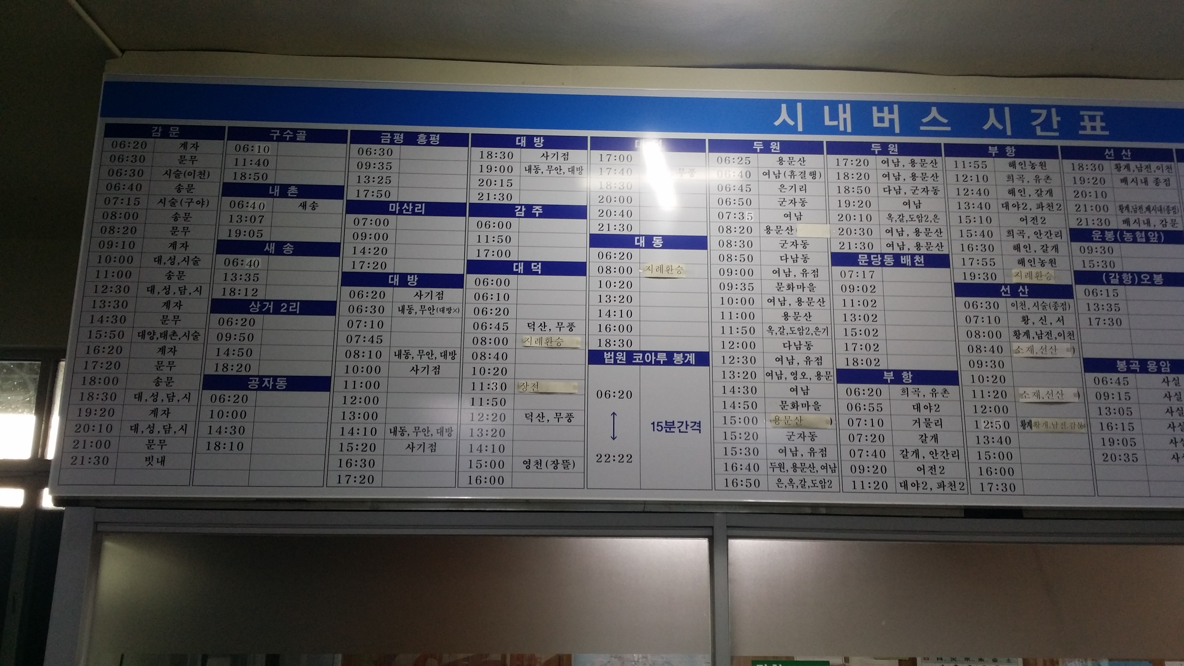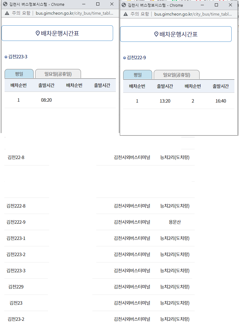 07시40분 김천터미널에 도착하여 8시20분 용문산으로 운행하는 223-3번을 환승한다. 김천시청 홈피엔 222-9번을 제외하곤 능치2리가 종점으로 표시되어 있다. 그런데 이놈들이 되돌아 올땐 출발점이 용문산이다. 해서 계획엔 1.2Km를 걷는다는 각오를 하고 기사님께 읍소하여 용문산까지 이동할 생각이었는데 김천시외버스 터미널 시간표를 보니 ALL 용문산이 종점이다. 이거 이거 민원 넣어야 겠네.