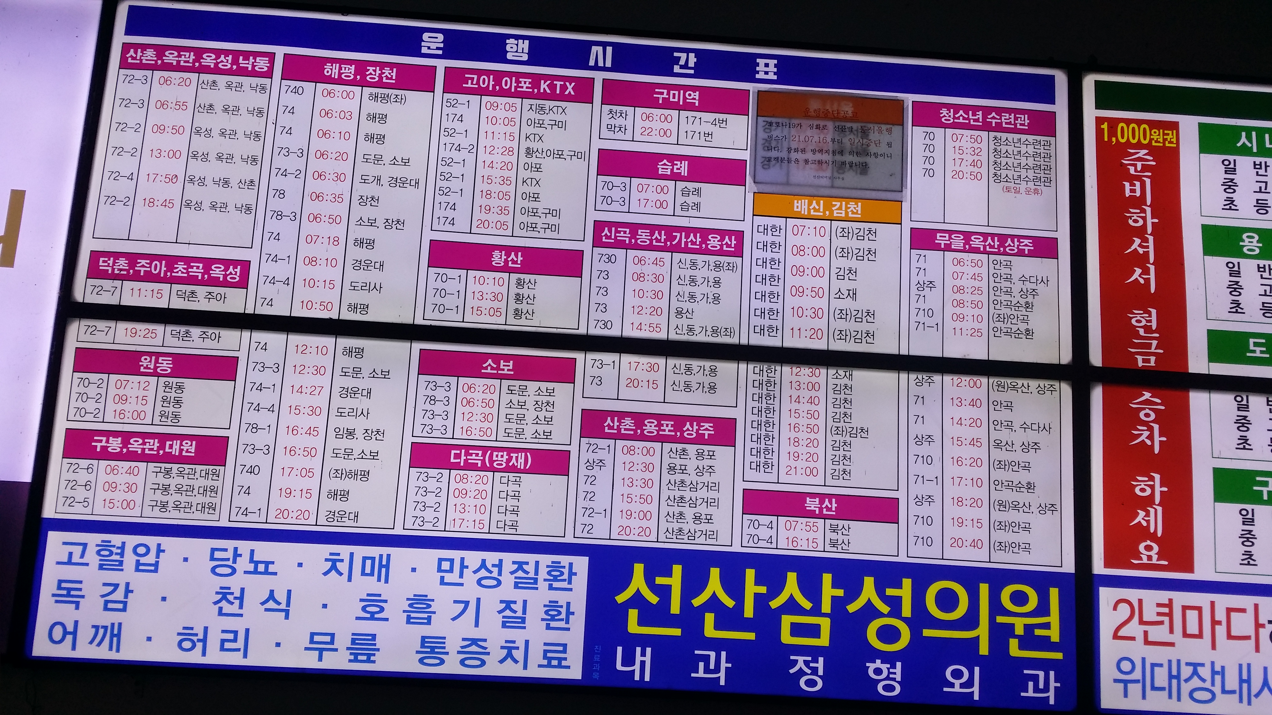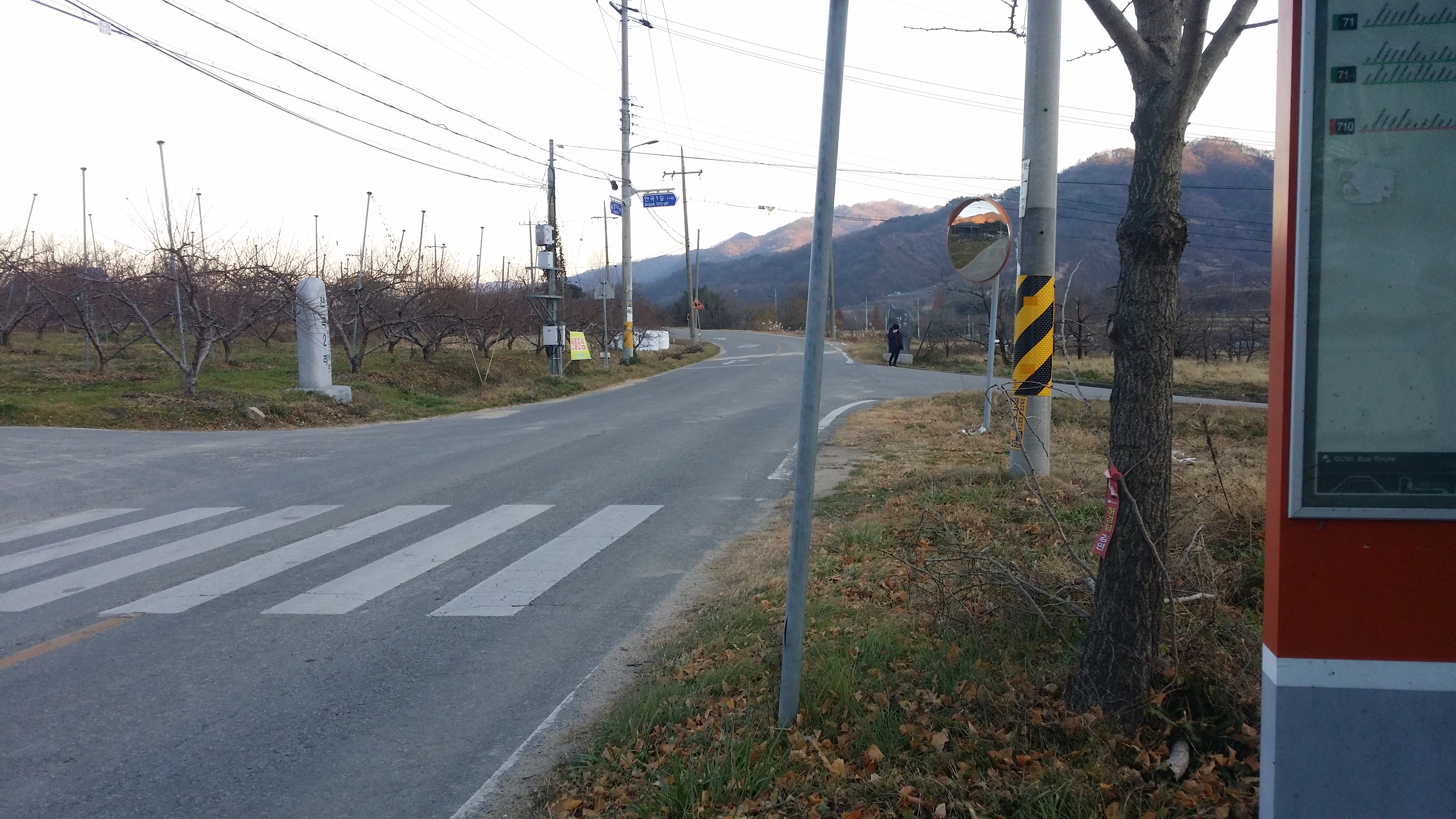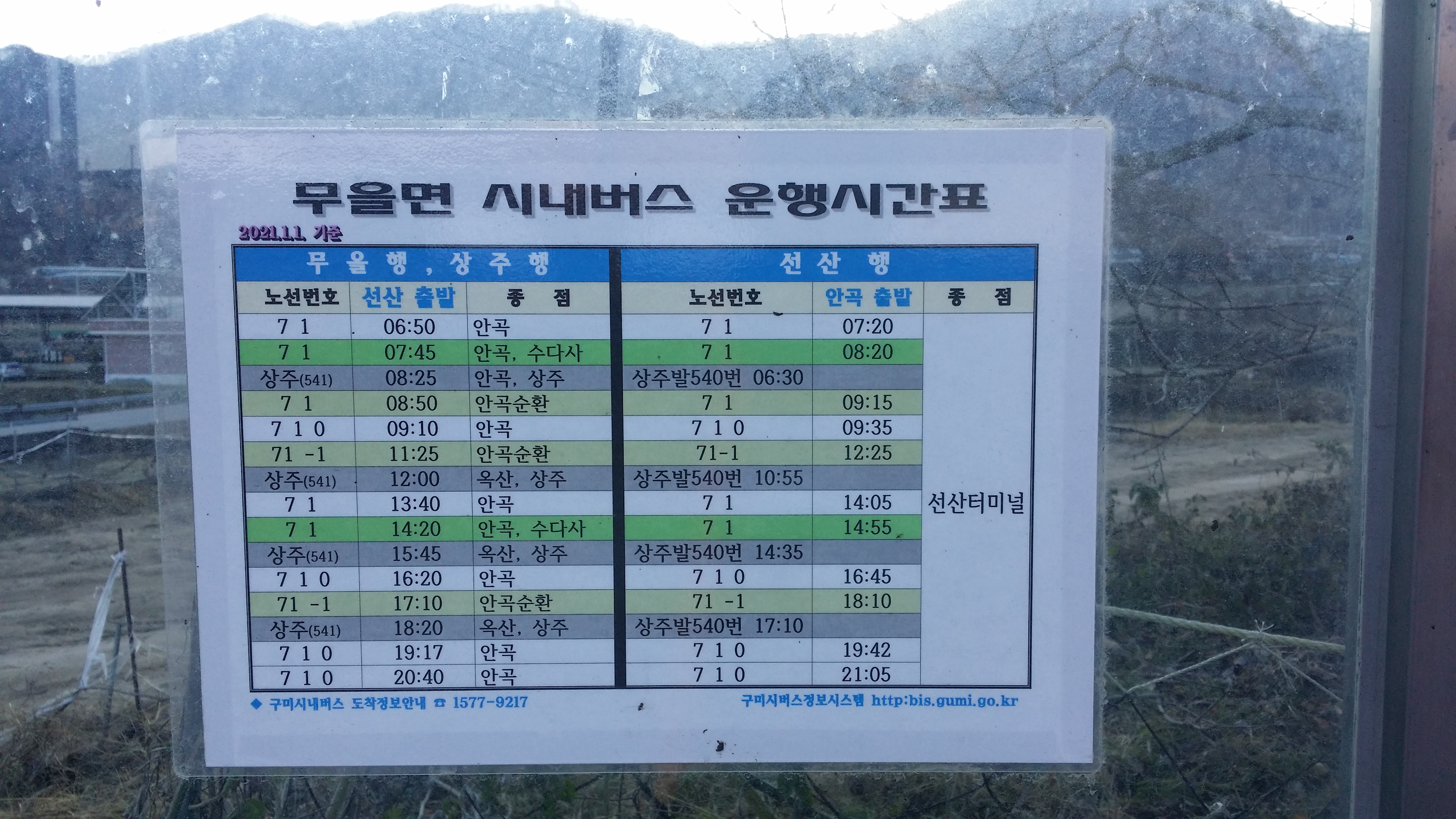 버스 정류소는 여긴데 실질적으론 20m 전방 안곡1리 표지석에서 기다려야 합니다. 버스는 16시46분에 도착하여 16시47분에 출발합니다. 오는데 26분 소요되었으니 17시10분 구미가는 버스 환승은 물건너 갔다고 생각 했는네...기특하게도 17시7분에 선선터미널에 도착하여 여유롭게 17시10분 버스를 타고 구미역으로 향합니다. 예전엔 선산터미널에서 구미역까진 170번은 27분, 171번은 39분 소요되었는데, 오늘은 170번이 평소답지 않게 안전운행 하여 34분만에 구미역에 도착 했습니다. 만약 17시10분 차를 놓치고 17시25분차를 탔다면 17시59분경 구미역에 하차하여 18시3분에 부산으로 가는 열차를 타야 했습니다. 버스에서 하차하여 여유를 가지고 기차에 오르기까지 3분이 소요되던데(보행자 신호 제외) 문제는 버스에서 내려 보행자 신호 대기 시간에 따라 탈수도 못탈수도 있네요. 다음엔 보행자 신호 최대 대기 시간을 체크해 봐야 겠습니다