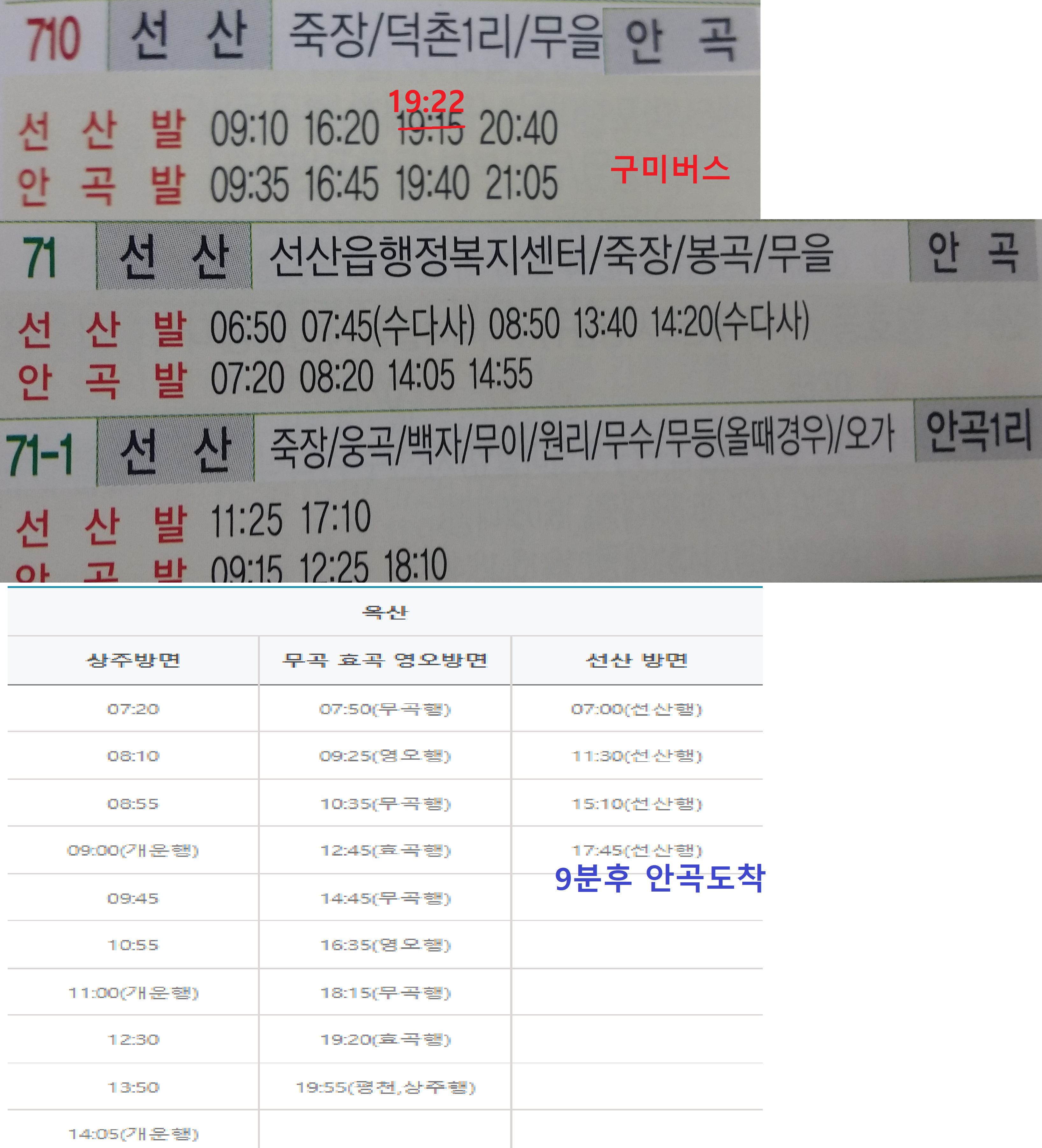 16:10 안곡정류소 / 정류소에 도착 하자 마자 선산에서 15시45분에 출발한 상주버스가 지나갑니다 구미버스는 요금도 저렴하고, 환승도 가능 하지만 상주버스(옥산+9분후 도착)는 환승 불가하며 요금도 비쌉니다정류소 건너편으로 묵집 안내판이 있던데 식사 가능한지 모르겠네요