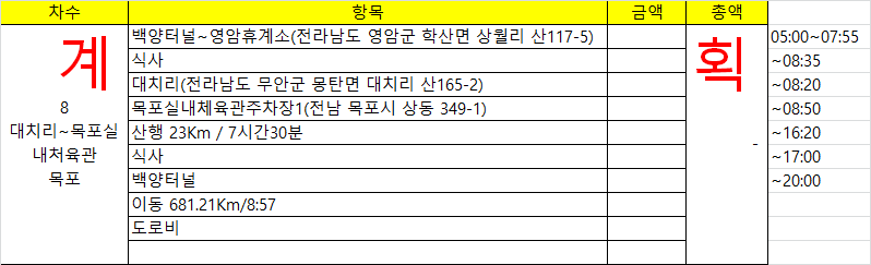 16:20 266.2봉(△)16:23 무안클린밸리CC에 다가오자 등로가 좌측으로 떨어진다. 백양산 다람쥐님이 아침에 마루금에 올라서니 가시밭길이라 개고생 했다며 CC따라 내려서라는데 중간에 우측으로 떨어지는 갈림길을 못봤다. 일단 되돌아서 마루금을 따라 내려선다. ㅎ 가지말라는 길이 여기구나 16시20분 산행 종료 예상했기에 못먹어도 GO16:40 대치리 갈림길 / 산행종료 / 늦게 와서 장비 정리할 시간도 없다 바로 출발17:40~18:08 정남진 휴계소 야외 테이블에서 차돌박이 된장국을 먹는다. 음식이 대체적으로 짜다. 다음엔 다른곳을 알아봐야겠다. 야외테이블이 있어 마음에 들었는데 음식이 별로라...