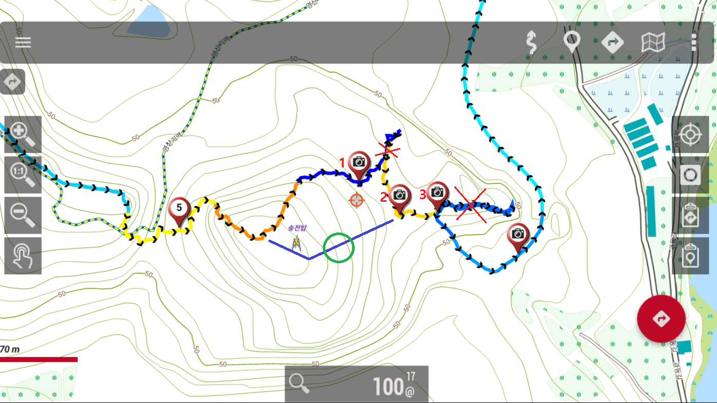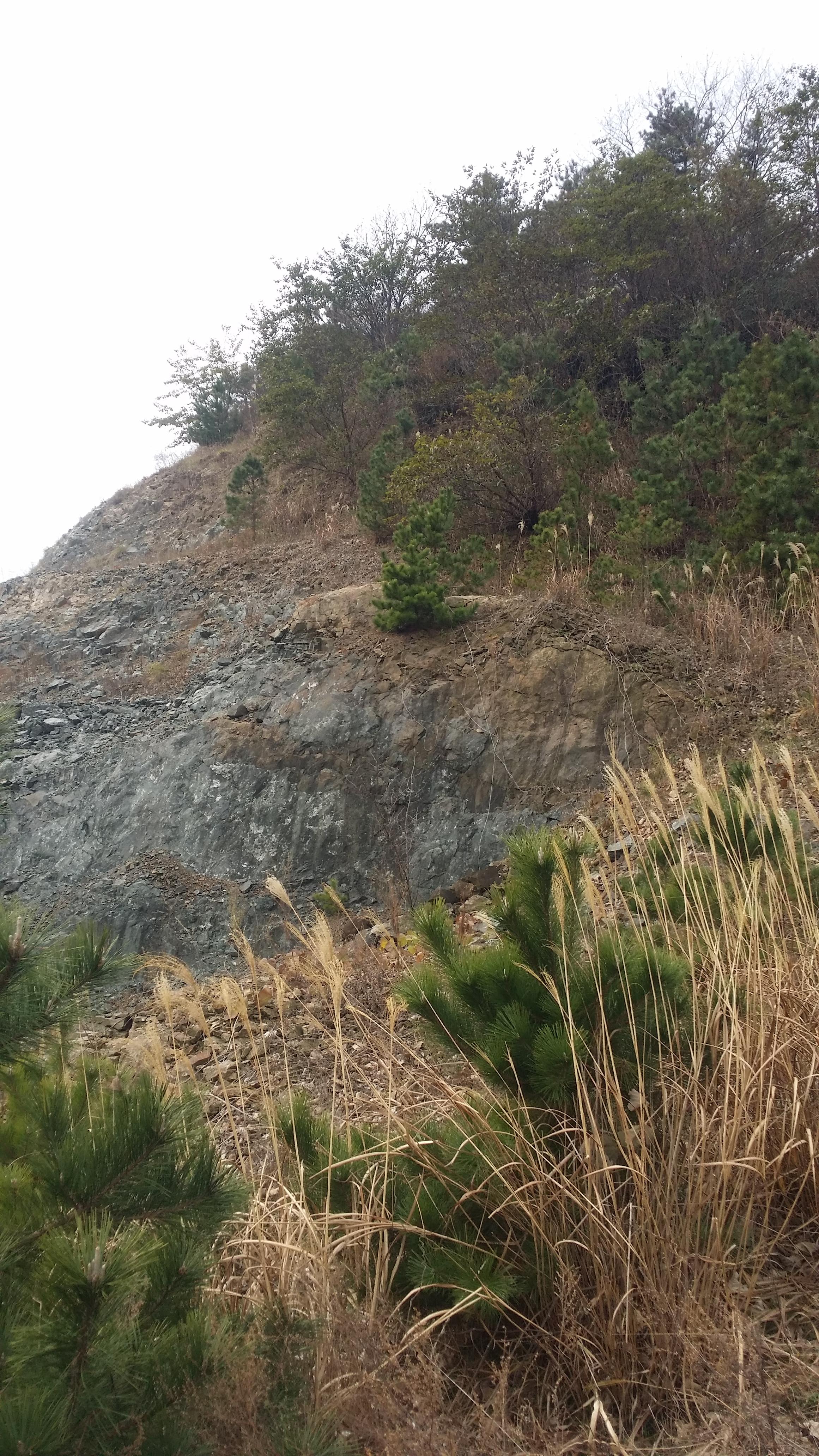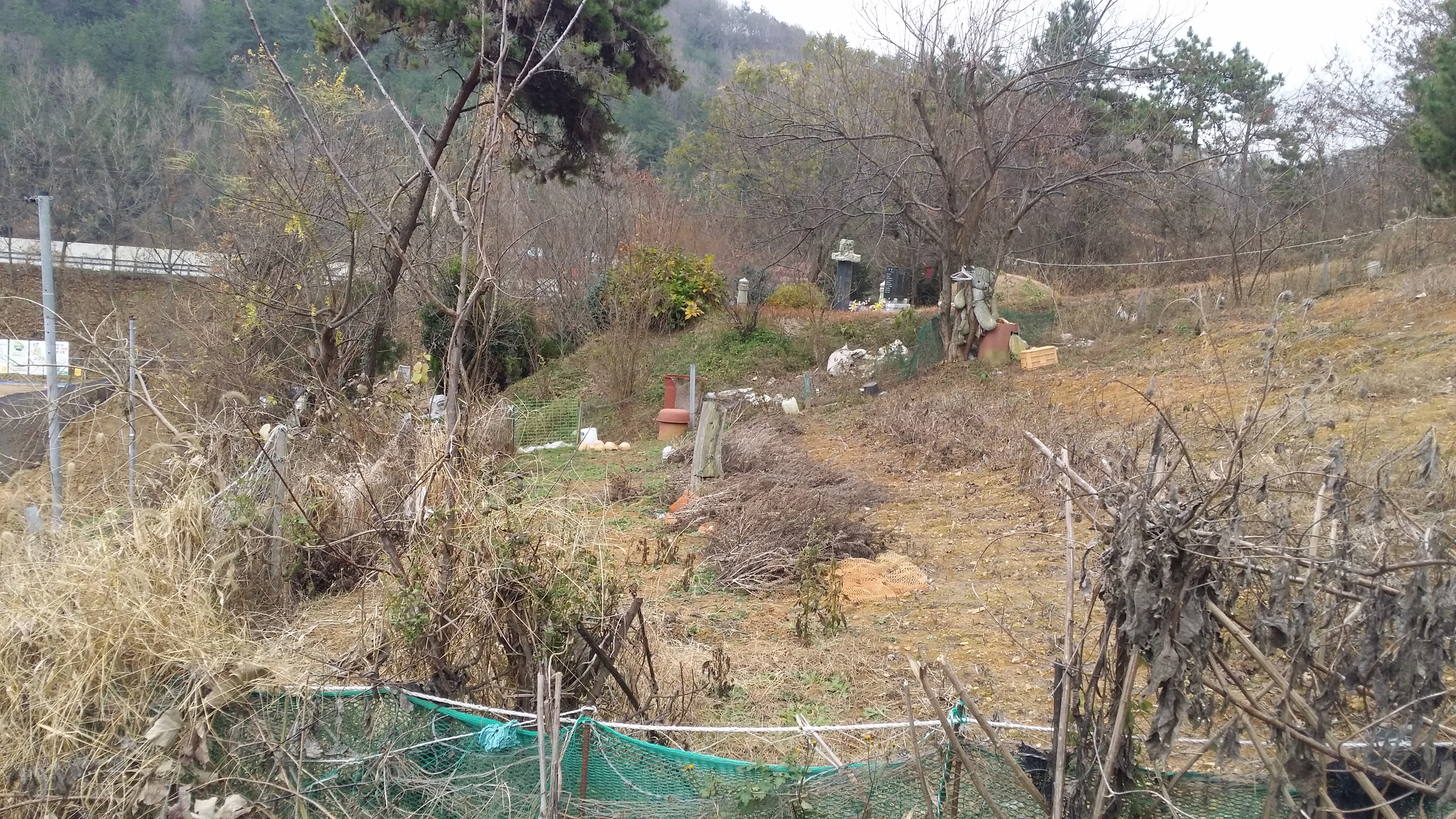되돌아 나오면서 내려설수 없는 절개지를 바라본다11:15 정면에 78봉이 있다. 육안상 좌측으로 오를수는 있는데 정면에 보이는 사면을 봐서 내려서는 길이 있을런지 모르겠네. 이지점을 10시15분경 통과해야 하는데 너무 늦었다 포기하자11:20~11:22 절개지를 돌아오니 좋은상황은 아니지만 오를수 있겠는데, 시간이 없다. 미련이 남아 왔다리 갔다리 하다 포기한다. 나중에 A조를 만나 78봉 진행을 부탁했는데, 묵은길도 없고, 올라가는건 어찌 했는데, 내림길은 가시나무 천국으로 개고생했다네. 그리고 안부에 내려서니 울타리가 쳐진 사유지로 농사철엔 욕먹을 각오해야 한다네. 결론은 진행 불가11:32 추자재 / 마루금은 서해안고속도로를 가로지른다. 우측으로 굴다리가 있다11:36 굴다리를 지나 다시 좌측으로 이동하여야 하는데, 남들이 갔다는 산행기도 없어 쉬운길을 택하기로 한다 사진은 텃밭을 통과후 찍은사진인데 진행 방향으로 넝굴군락지라 여름엔 글쎄.내가 참고한 트랙은(녹색) 합수부로 향하는 트랙으로 우측에 공장이 있고 절개지로 올라서야해 쉬운길로 진입했는데(파랑선) 안부 근처에 가니 참고트랙과 만나지네. 합수부로 진행시 참고 트랙 방향인(녹색) 골짜기로 내려서는게 편할것 같다. 그리고 안부에서 마루금(노랑선)으로 진행한 흔적은 시간 관계상 생략하고 진행한다11:49 155.6봉