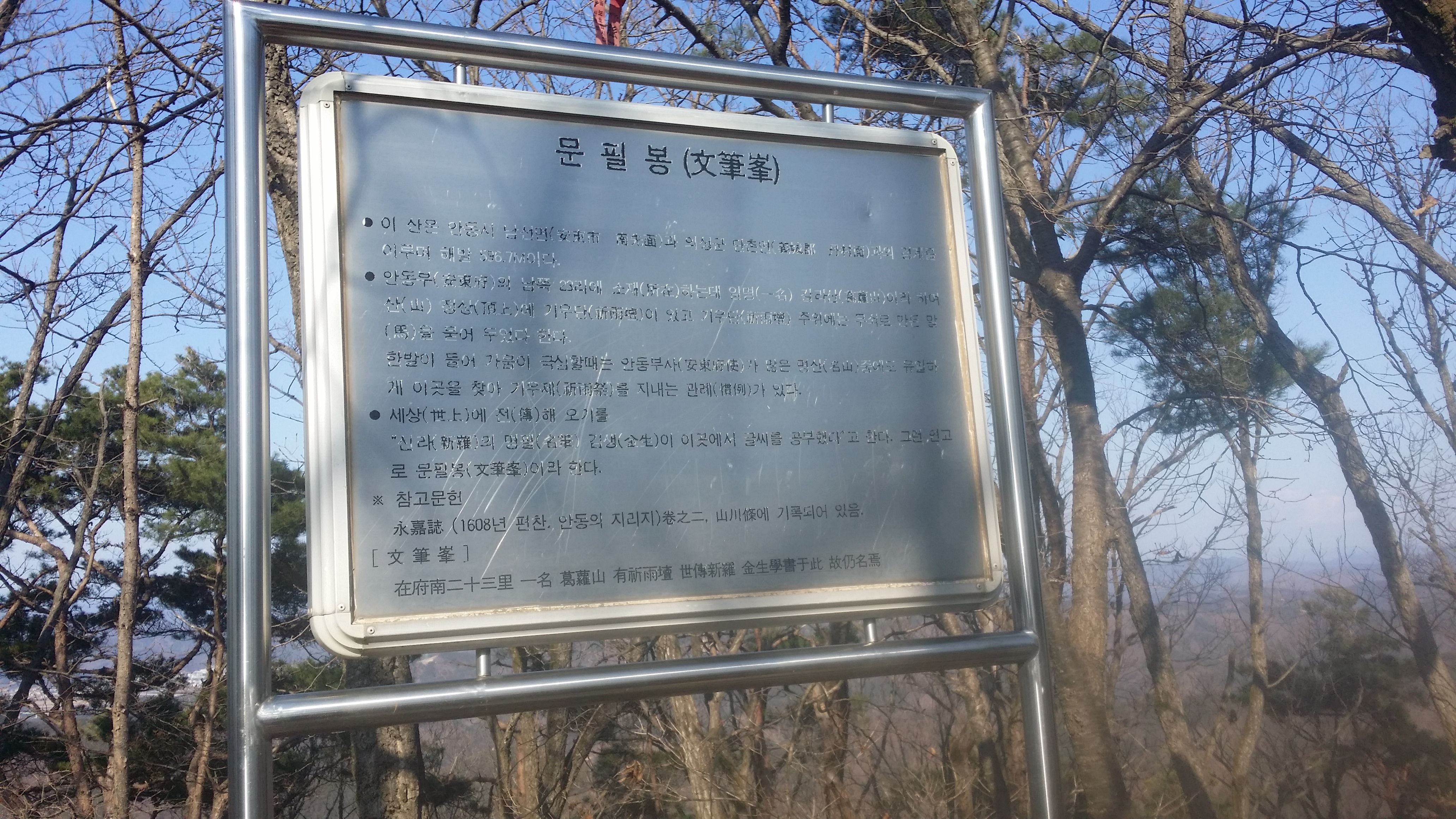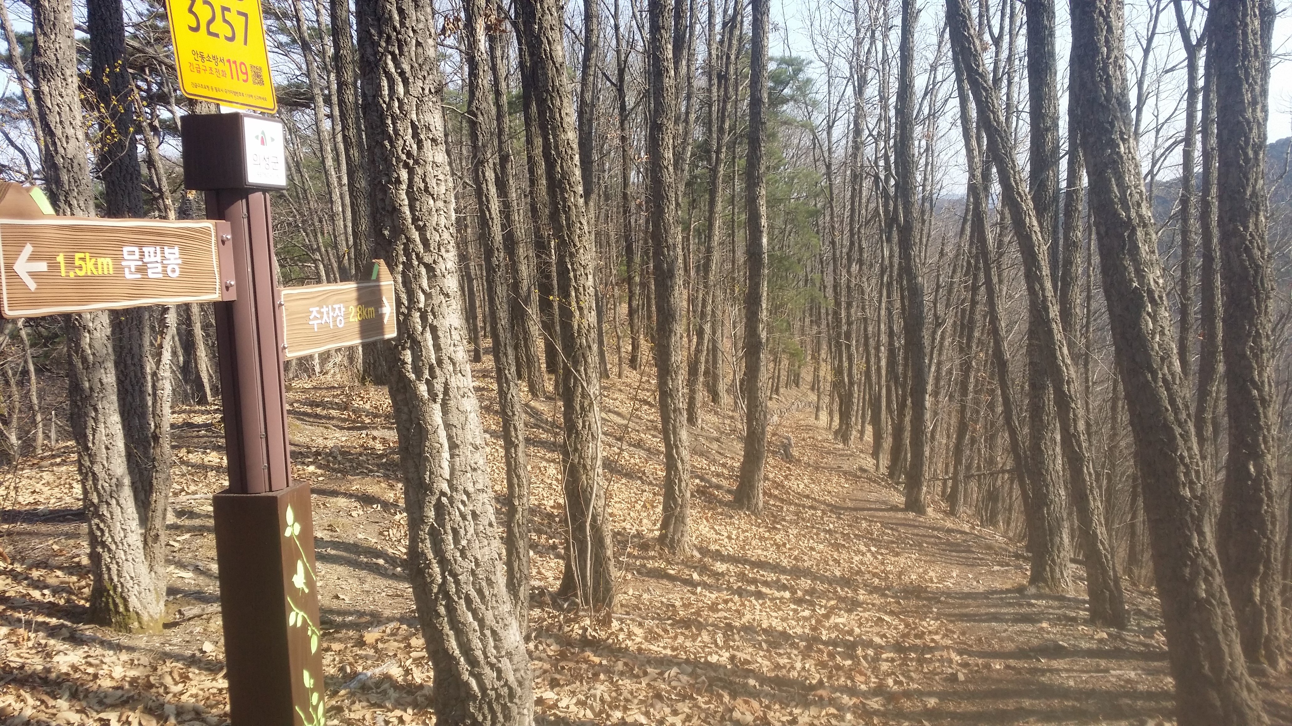 15:28 사거리 / 오른쪽으로 내려서면 안동 412번 버스를 이용할수 있다15:36 제2산림욕장 갈림길 / 안동 412번 버스 승강장 가는길15:45 문필봉 전망데크 / 오늘 구간은 볼거리가 없다. 전망데크를 설치 했는데 특징이 없네15:45 565.7봉/문필봉?15:47 문필봉 해설판 / 국토지리원은 565.7봉 으로만 표시되어 있다. 말 그대로 옛부터 문필봉이라 했다면 국토지리원에 요청하면 될텐데 너거만 떠들면 뭐하냐15:51 갈라산 우회길 / 힘들면 갈라산 패스 하라고
