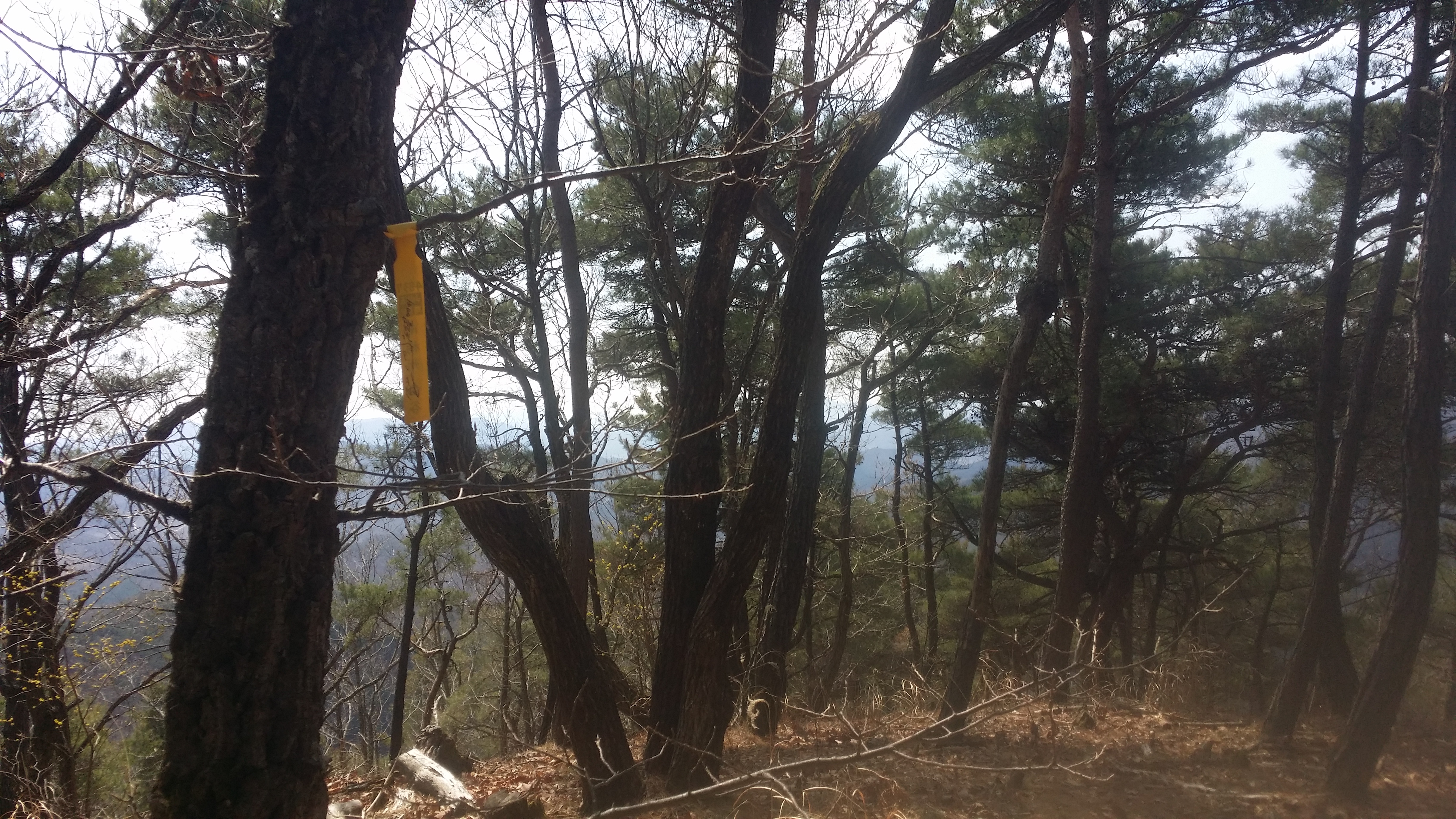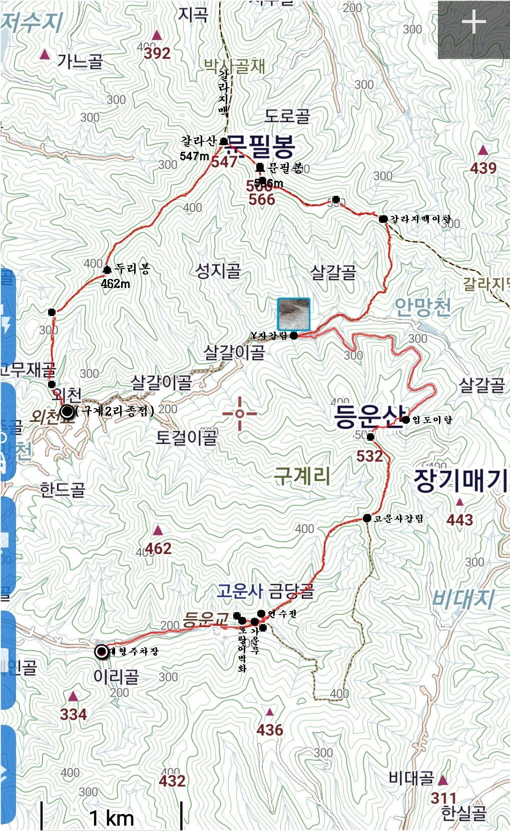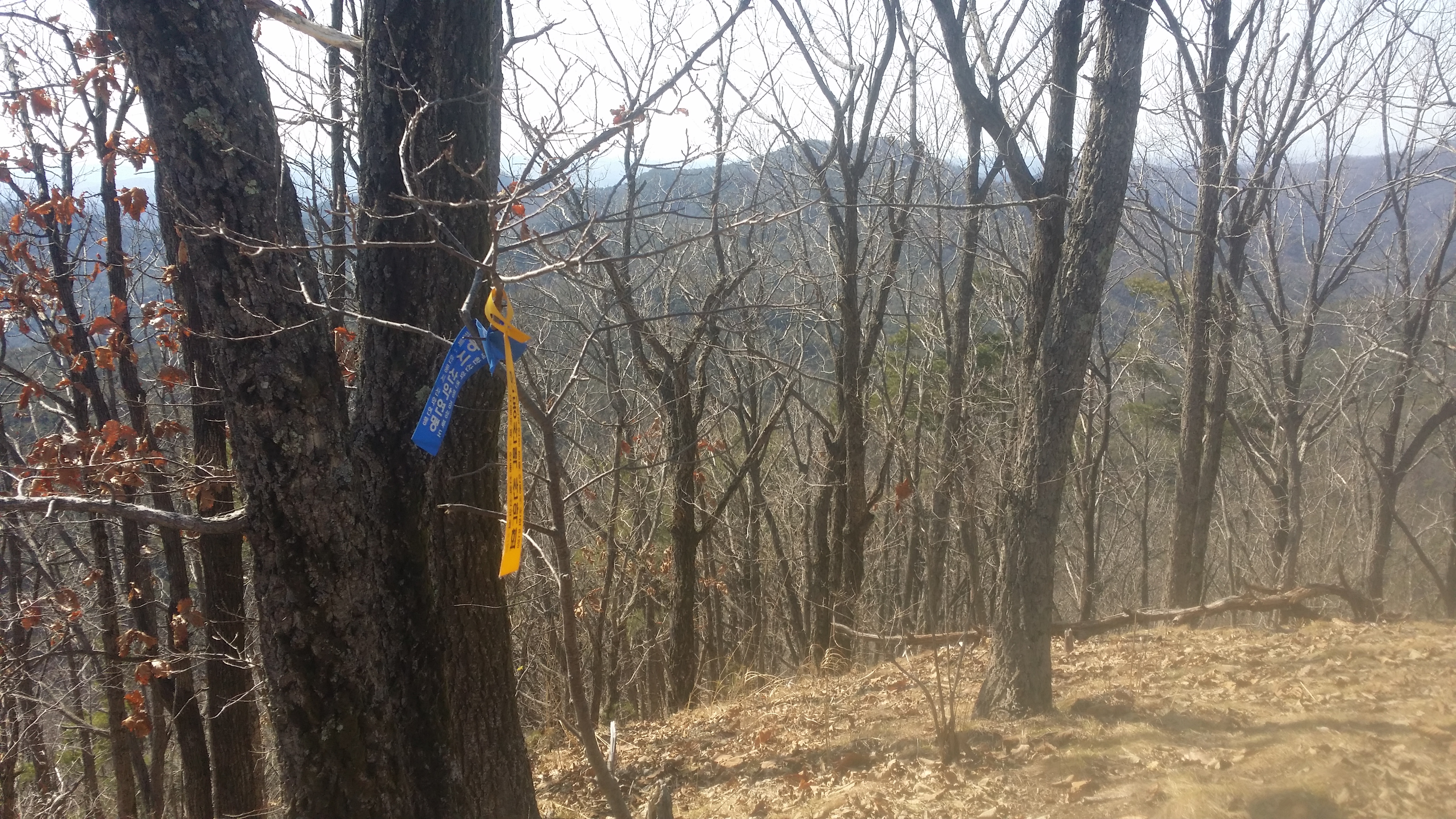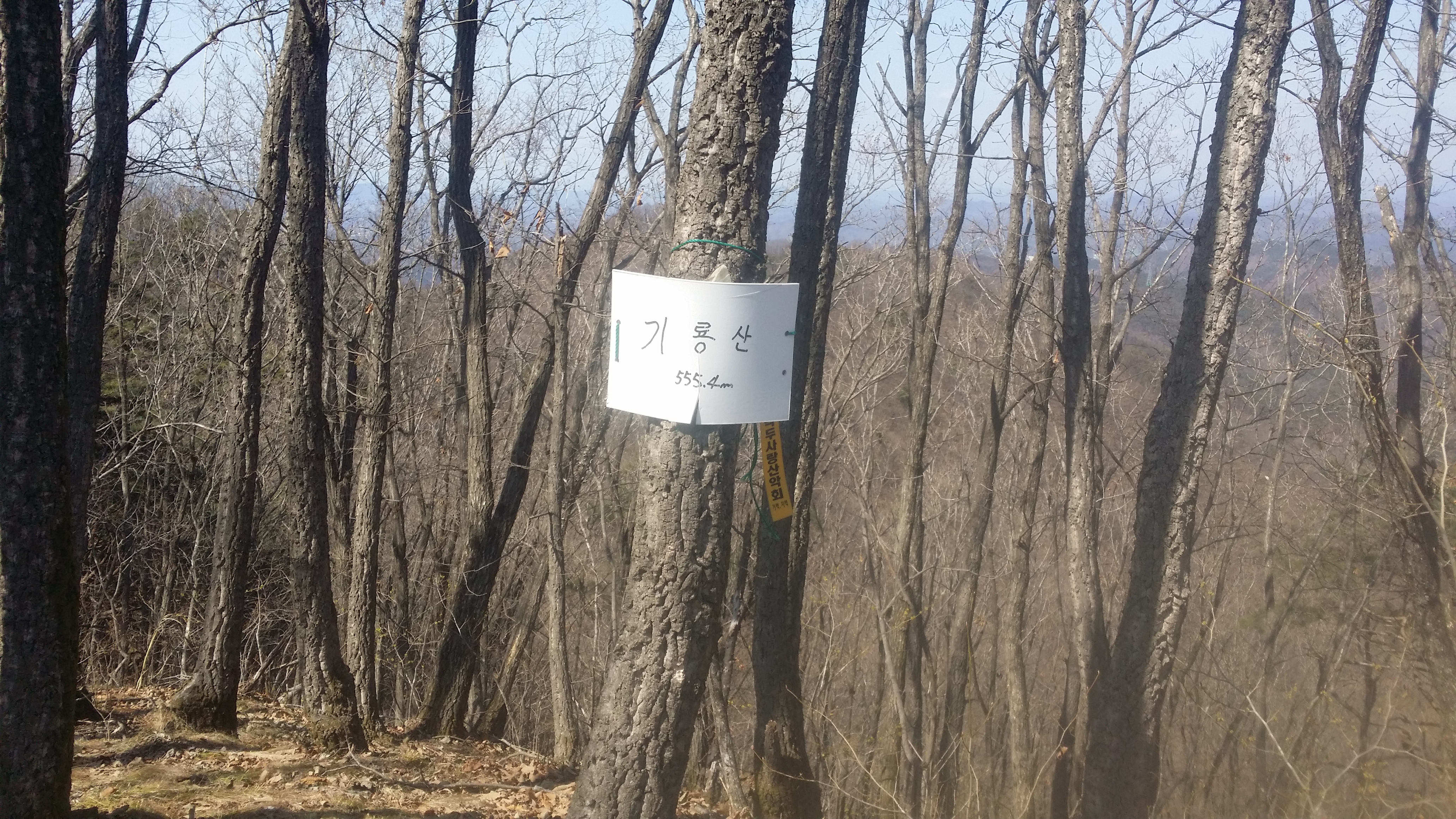 12:28492.9봉(△)12:50 489.2봉13:13 입산금지 / 능선 오른쪽으로 지 땅인것 같네. 거긴 안들어 가요13:29 고갯마루13:44 기룡산 갈림길 / 마루금은 좋은길을 버리고 좌측으로 떨어진다. 마루금에서 떨어져 있는 기룡산에 가보자13:52 502.4봉(△)13:59 기룡산(555.4m)14:12 기룡산 갈림길 / 왕복 28분 소요되었다14:30 519.8봉 / 등로체크지점 / 육안상으론 3거리로 직선방향과 90도 방향의 등로가 보인다. 맥길은 135도방향으로 급작스럽게 꺽는다. 519.8봉에 올라서 90도 방향의 등로가 맥길이라 생각하고 우측으로 보이는 시그럴을 무시했는데 계속 보인다. 그중 맥꾼의 시그럴도 있어 믿고 내려선다14:34~14:37 내림길이 제법 가파르다. 완만한 지점에서 다시 진드기 기피제를 뿌린다. 지속 유효 시간이 6시간용 이지만 어차피 중간에 한번 더 뿌려야 하기에 예상한 산행종료 시점을 기준으로 절반을 잘라 뿌리고 뿌리고14:57 471.5봉15:15 460봉 산패 / 지리원에 고도 표시가 없는 봉우리에 460봉 산패가 설치되어 있다.