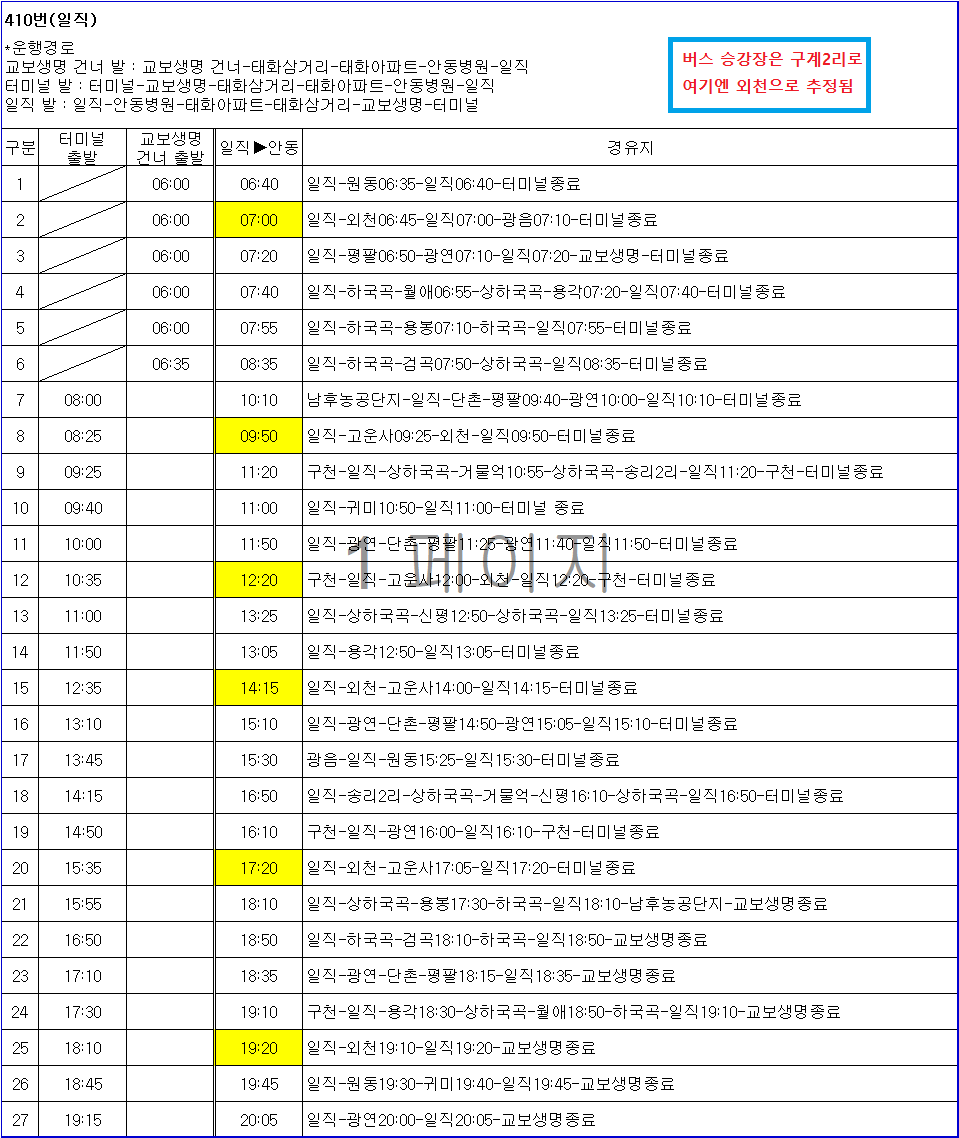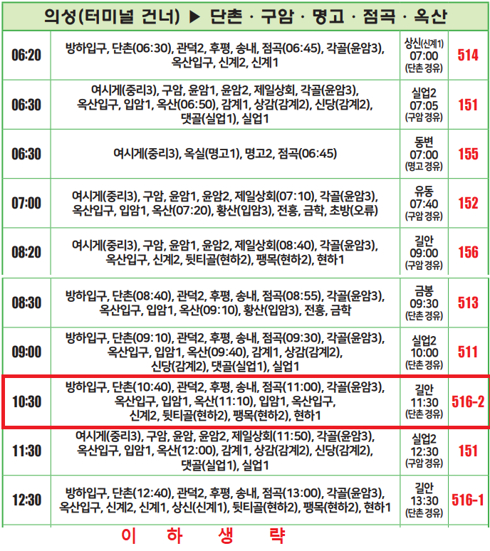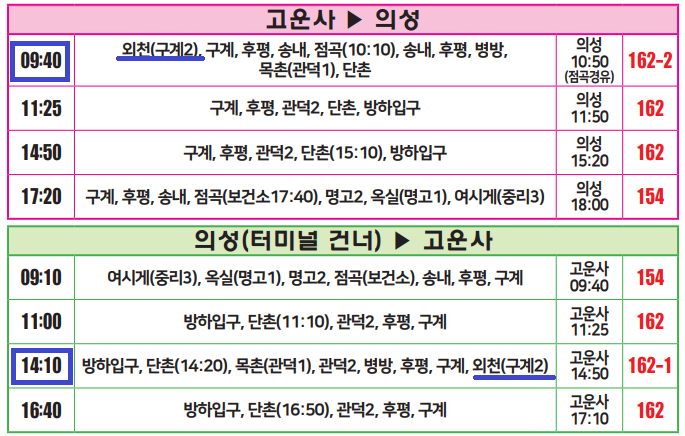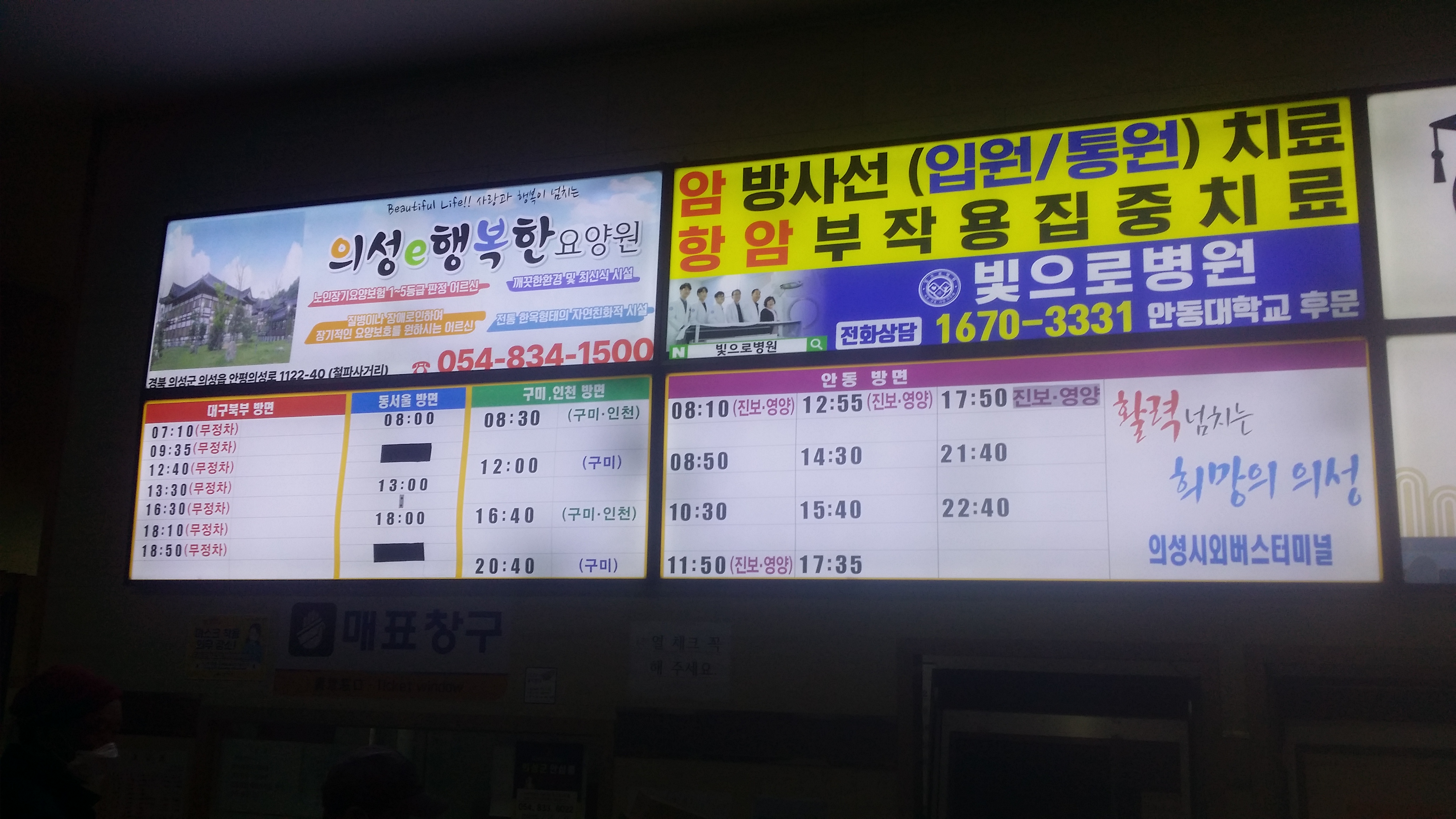 아 오늘도 짜증나네 분명 다른데 좌석이 있는데 하필 입구에 끊는 영감님. 휴 내가 피해야지 KTX 운행전 의성역사 리모델링으로 임시 승강장에서 빠져 나오는데 2분이 걸렸다. 사진은 의성 시외버스터미널 시간표다