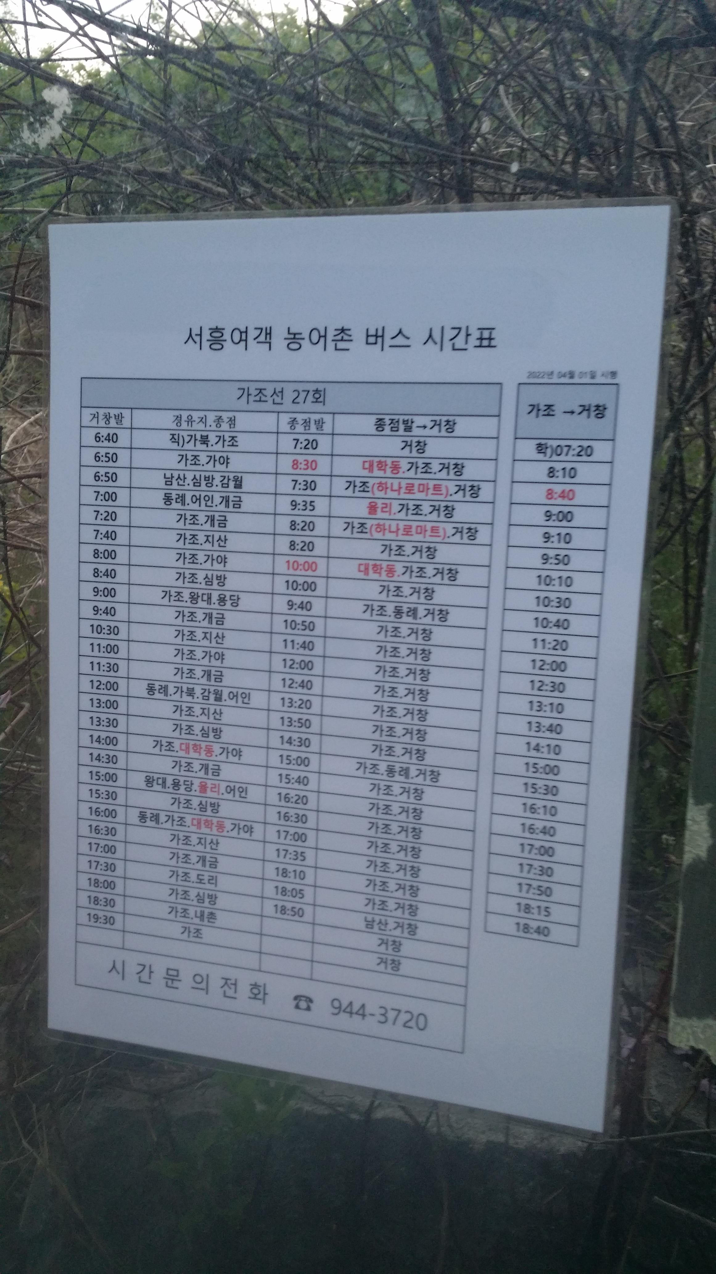 18:02 528.4봉(△)18:18 485.8봉18:27 살피재 / 18시40분 가조에서 거창행 막차가 출발한다. 살피재에 18시45분경 지나갈거라 예상한다. 혹 비슷한 시간대에 산행을 종료하면 손들어 세울려 했는데, 대촌까지 이동해도 된다18:40 대촌 정류소가조에서 18시40분 출발한 막차가 18시49분 도착했다