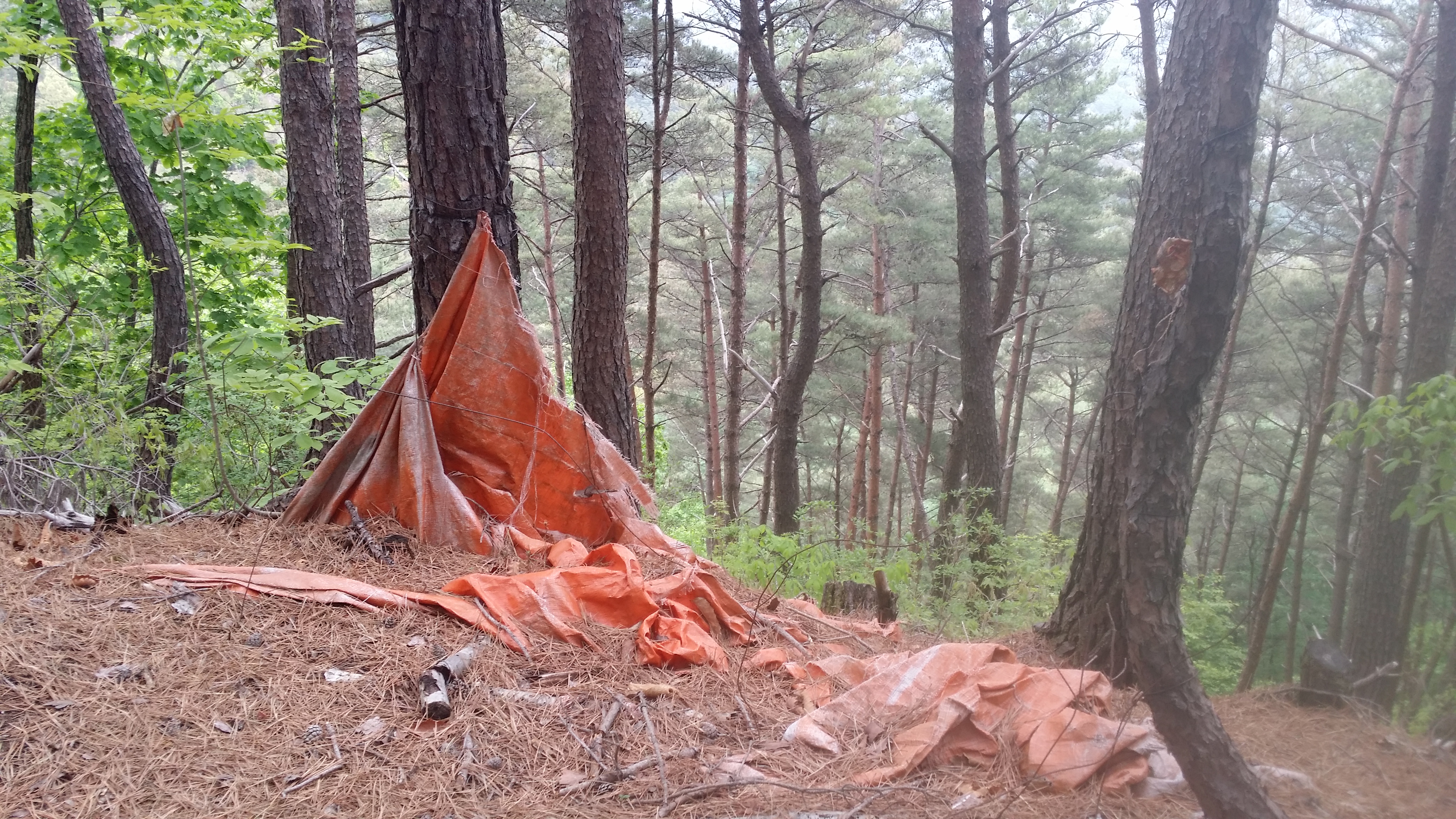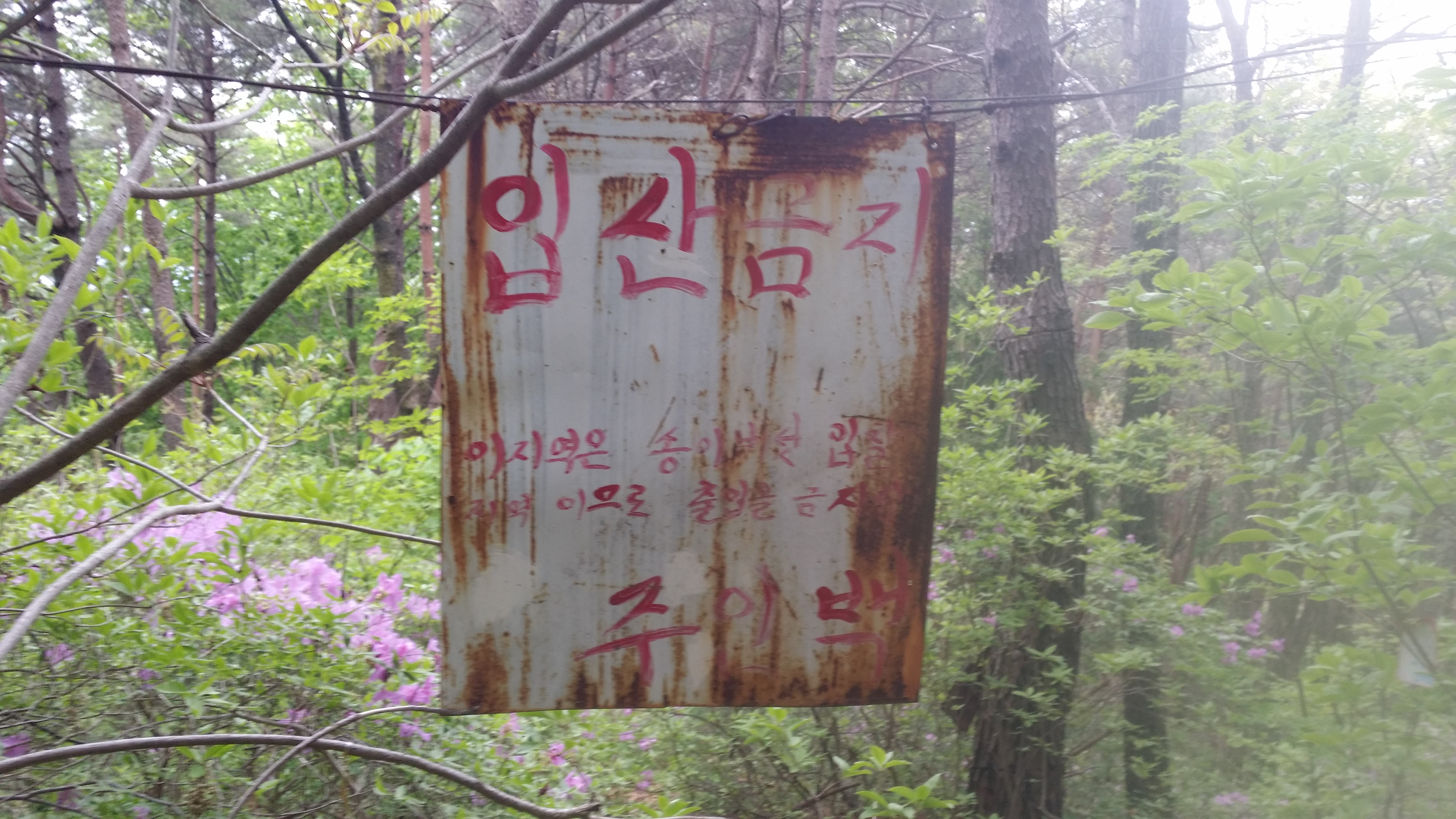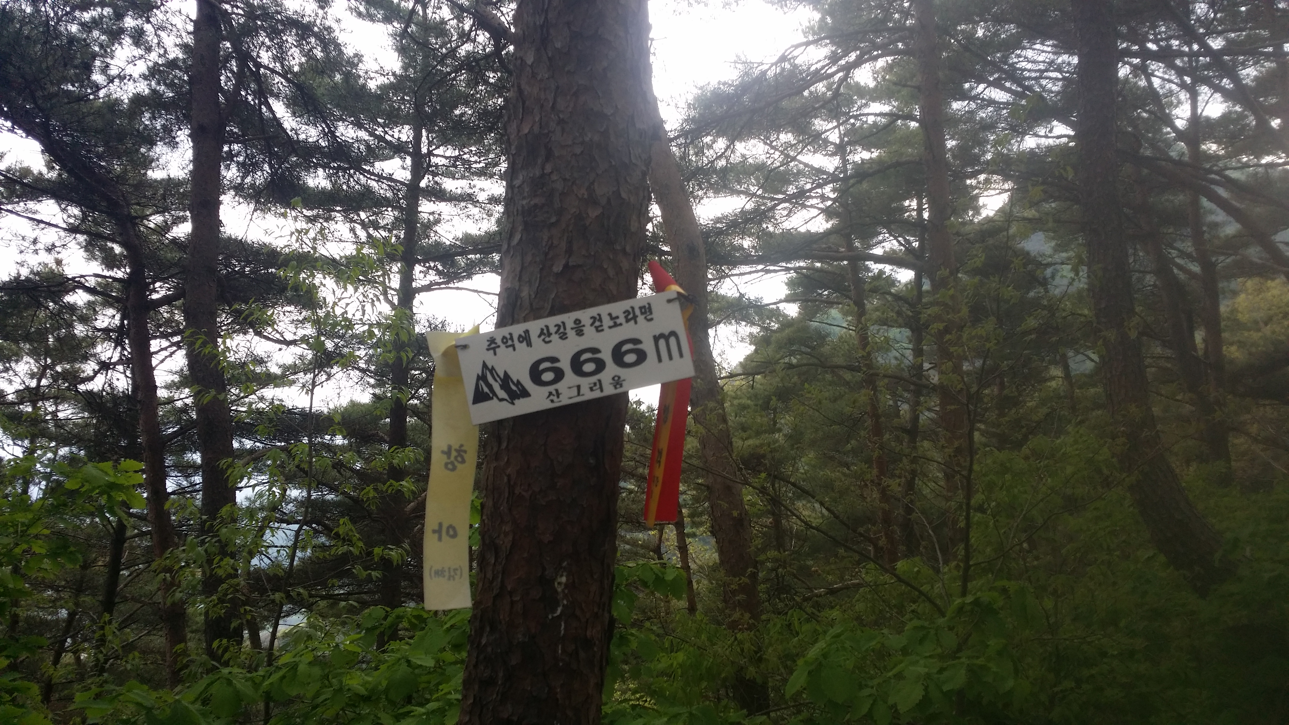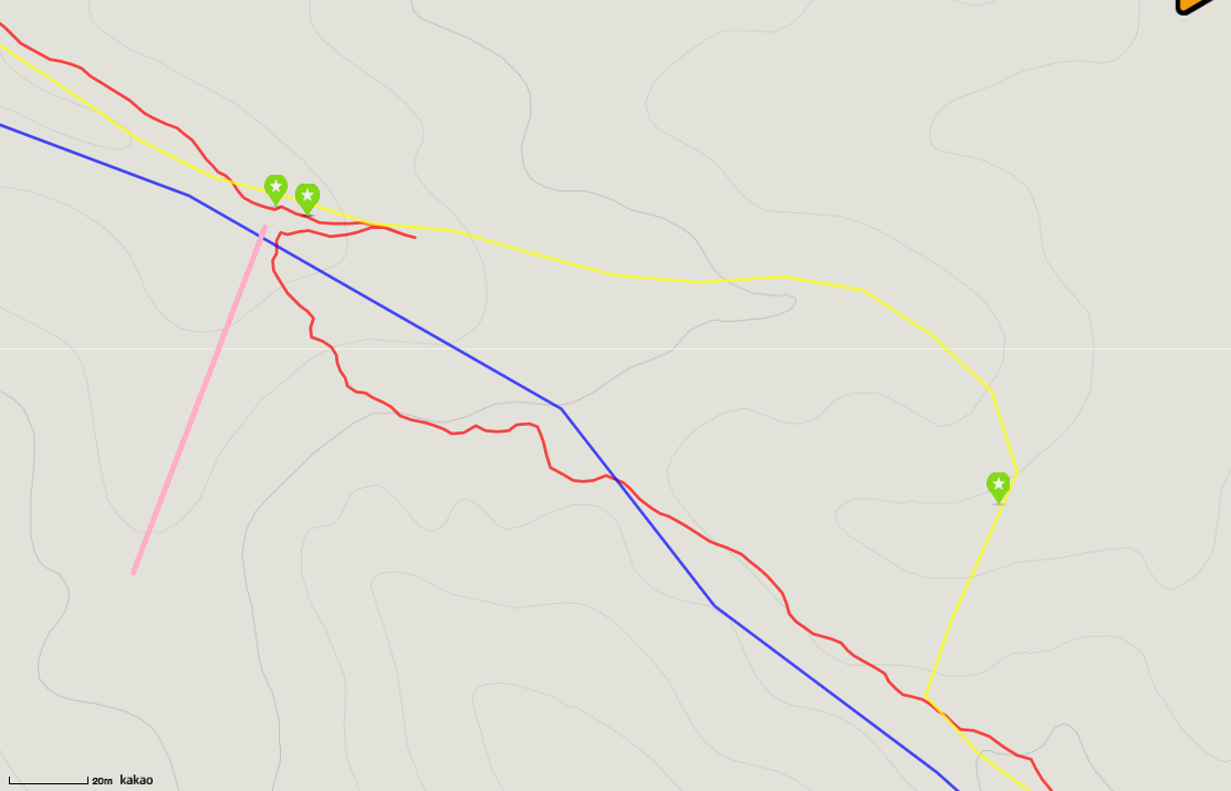17:08 금귀산(838.6m) / 정상엔 산불감시초소 및 요원이 근무중이다. 극한직업이다. 대다수가 인근에 임도가 있어 접근방법이 양호한데 여기는 아니다. 17:44 [독도주의지점] / 등로는 노랑선과 분홍선으로 갈린다. 이론적 마루금은 두 등로 사이로 진행해야 하는데 등로가 안보인다. 노랑선을 따라 갔다. 되돌아와서 분홍선으로 조금 들어서다 좌측으로 꺽었는데 마루금 가까이는 진행이 불가하여 길 좋은데로 내려서니 멀어져 좌측으로 붙으니 계곡이다. 알바! 계속하여 좌측으로 붙으니 마루금이 나온다. 독도가 어려운 구간이다. 차라리 노랑선을 따르는게 속편한것 같다