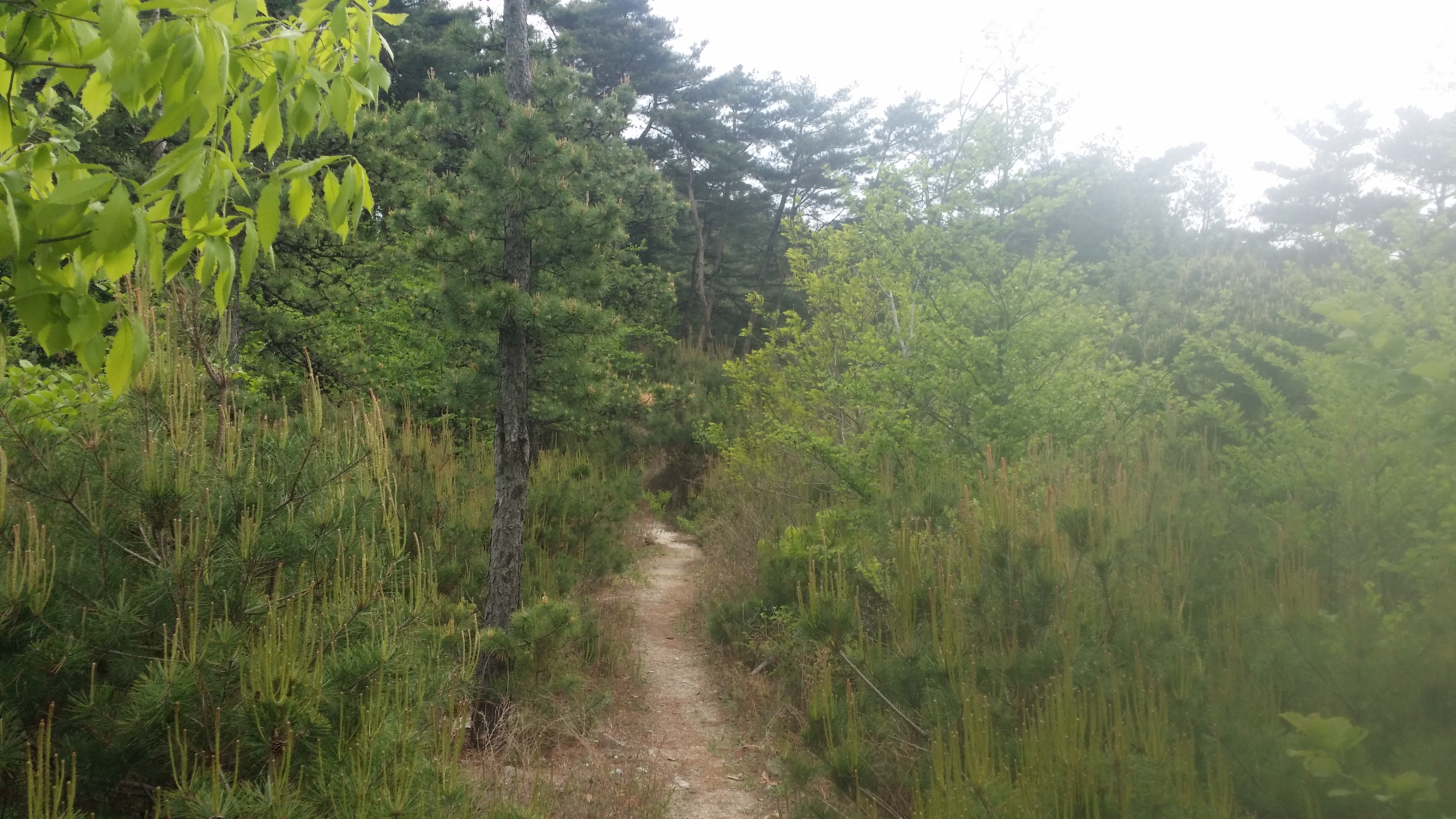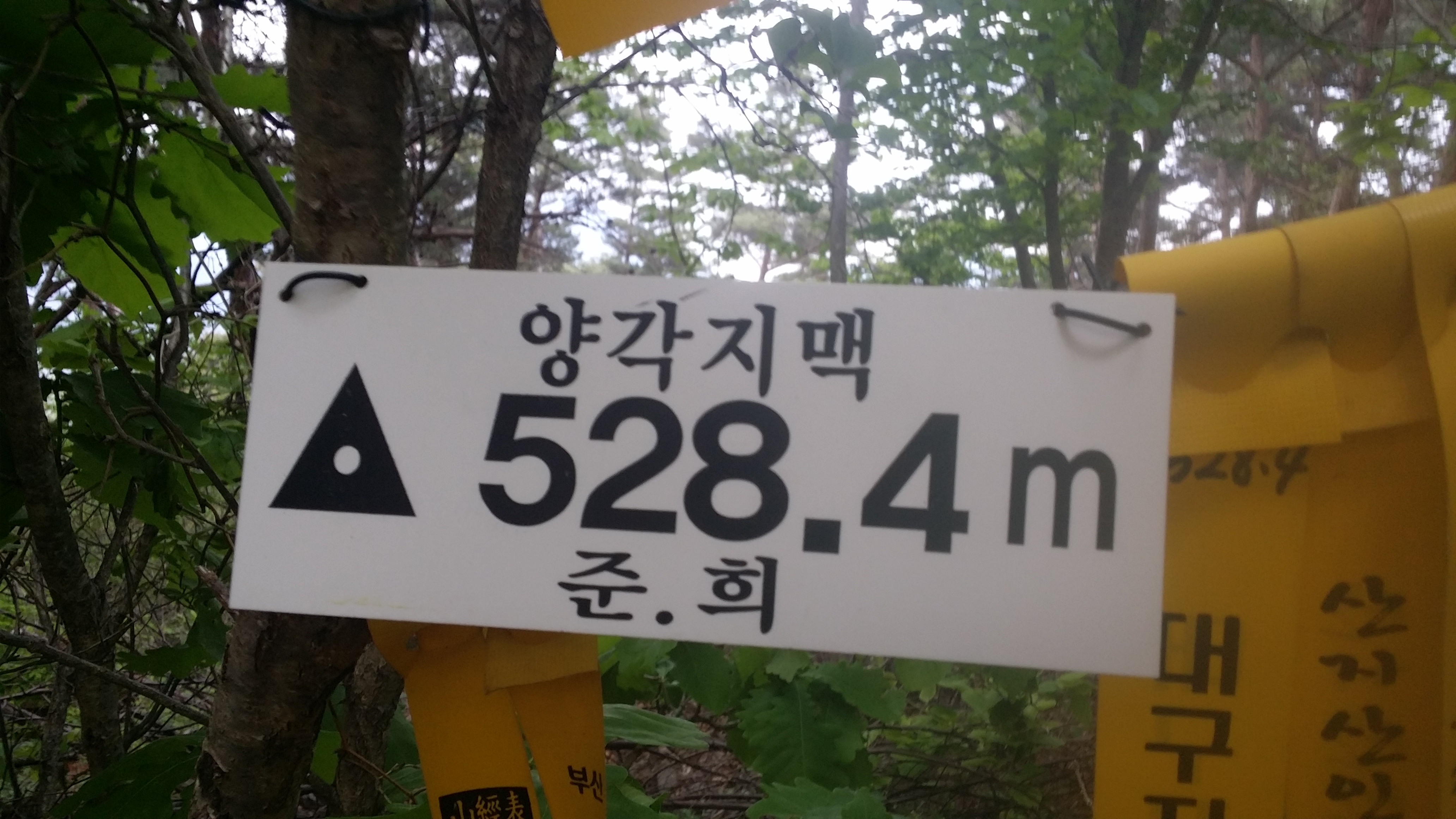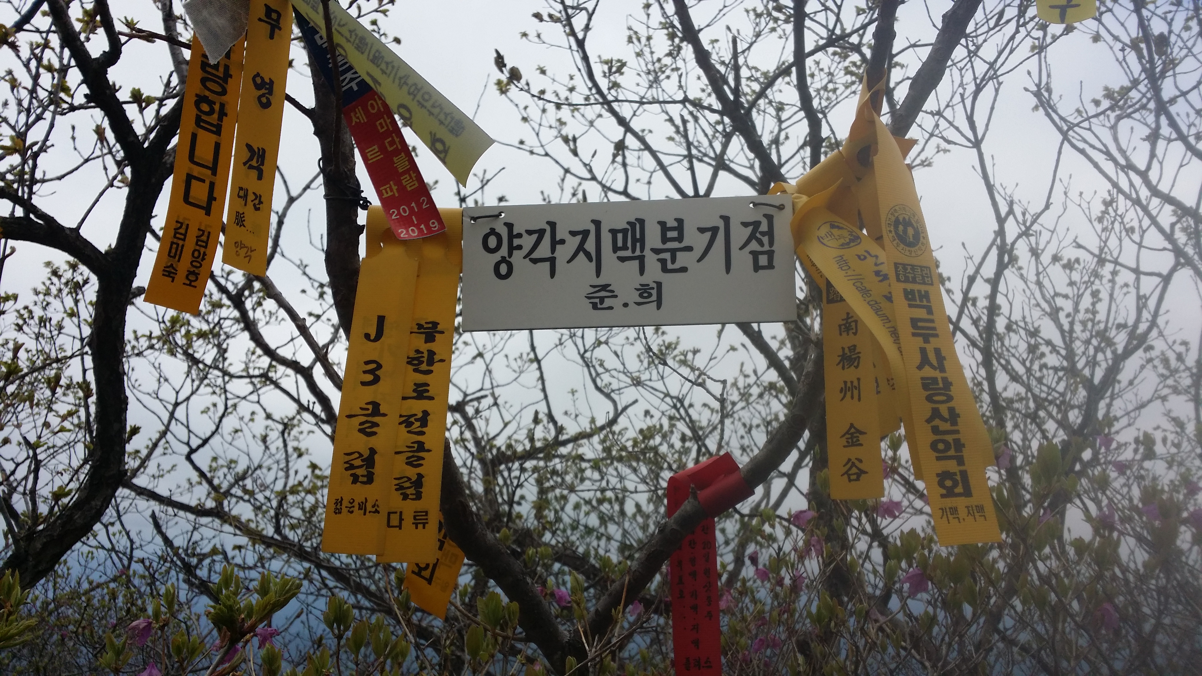 17:08 금귀산(838.6m) / 정상엔 산불감시초소 및 요원이 근무중이다. 극한직업이다. 대다수가 인근에 임도가 있어 접근방법이 양호한데 여기는 아니다. 17:44 [독도주의지점] / 등로는 노랑선과 분홍선으로 갈린다. 이론적 마루금은 두 등로 사이로 진행해야 하는데 등로가 안보인다. 노랑선을 따라 갔다. 되돌아와서 분홍선으로 조금 들어서다 좌측으로 꺽었는데 마루금 가까이는 진행이 불가하여 길 좋은데로 내려서니 멀어져 좌측으로 붙으니 계곡이다. 알바! 계속하여 좌측으로 붙으니 마루금이 나온다. 독도가 어려운 구간이다. 차라리 노랑선을 따르는게 속편한것 같다