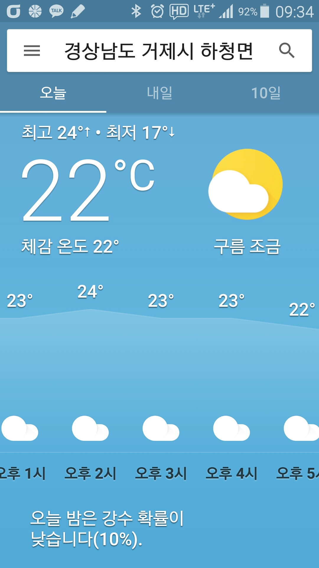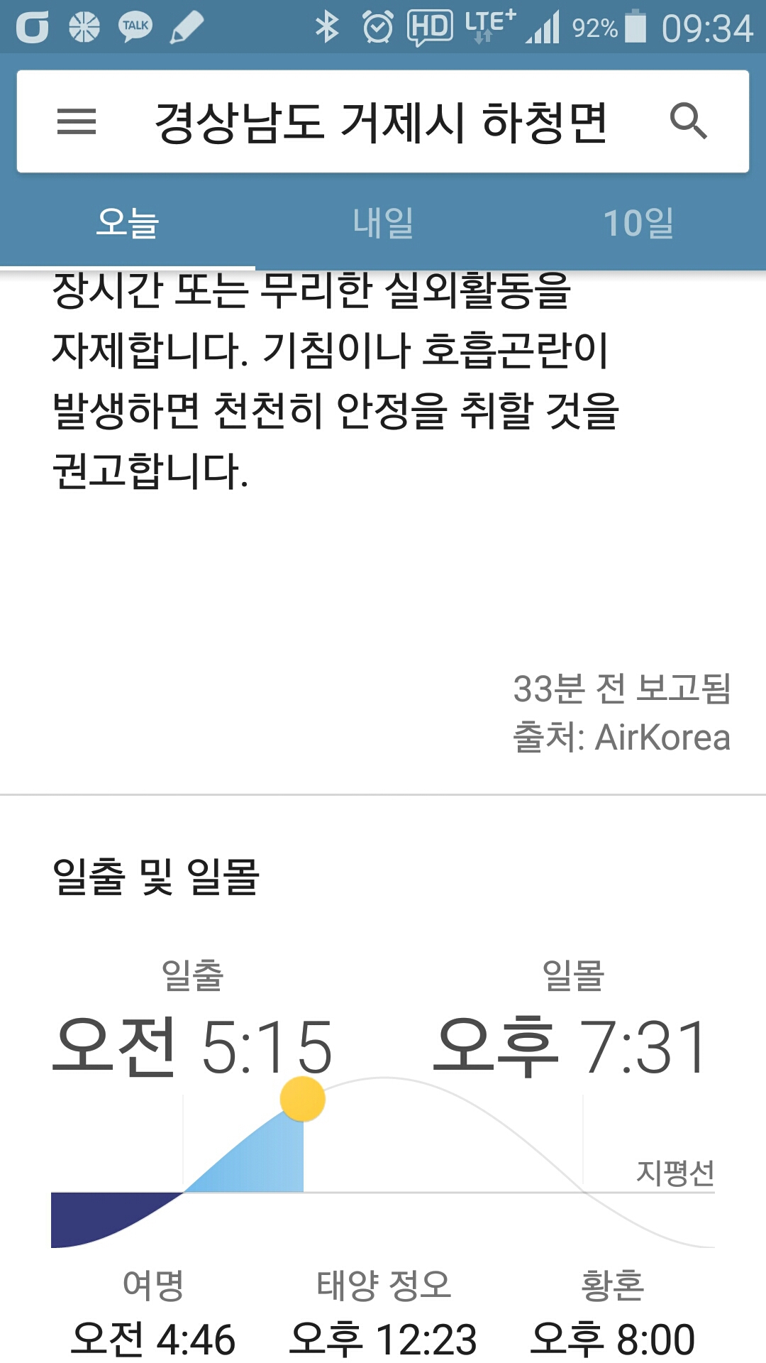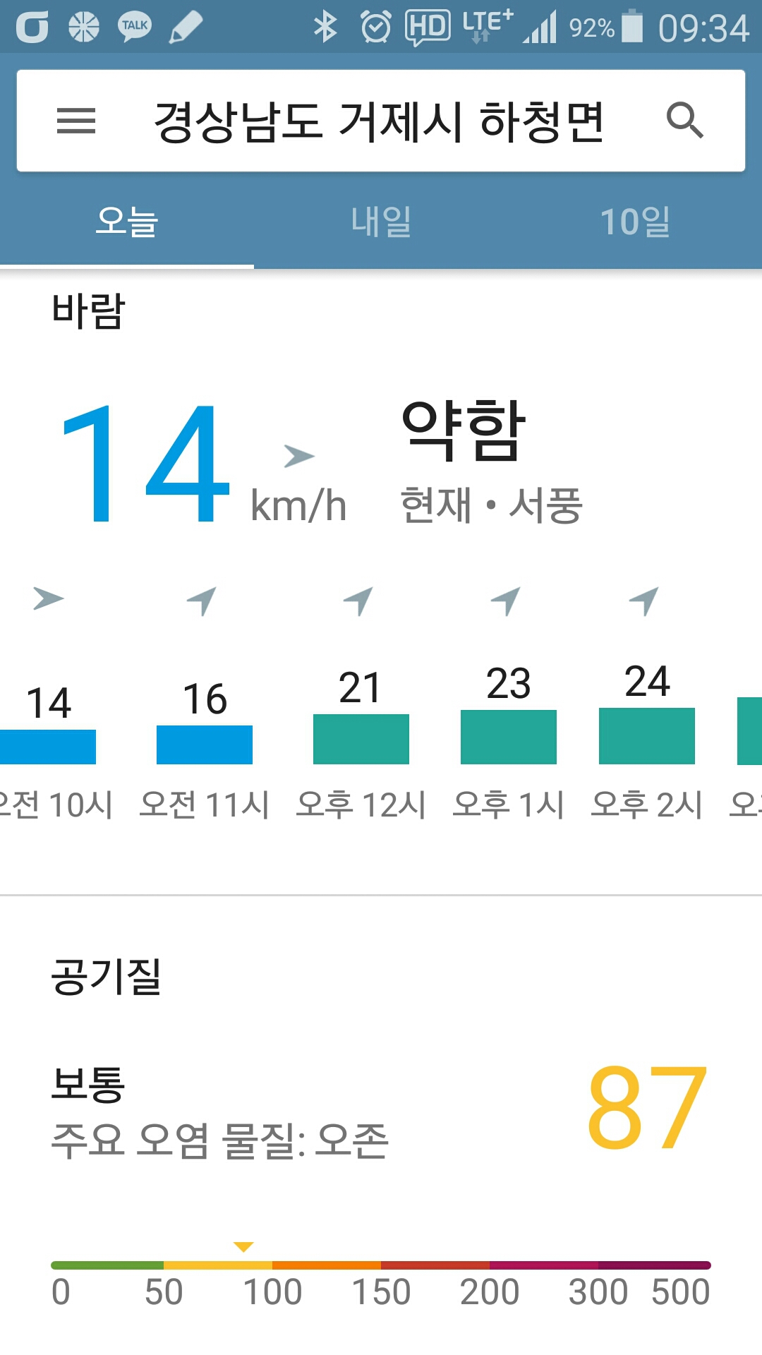 - 기상 : 22˚ ~ 24˚, 습도 49%, 바람 14~24(약함), 공기질 87(보통), 일몰 19시31분