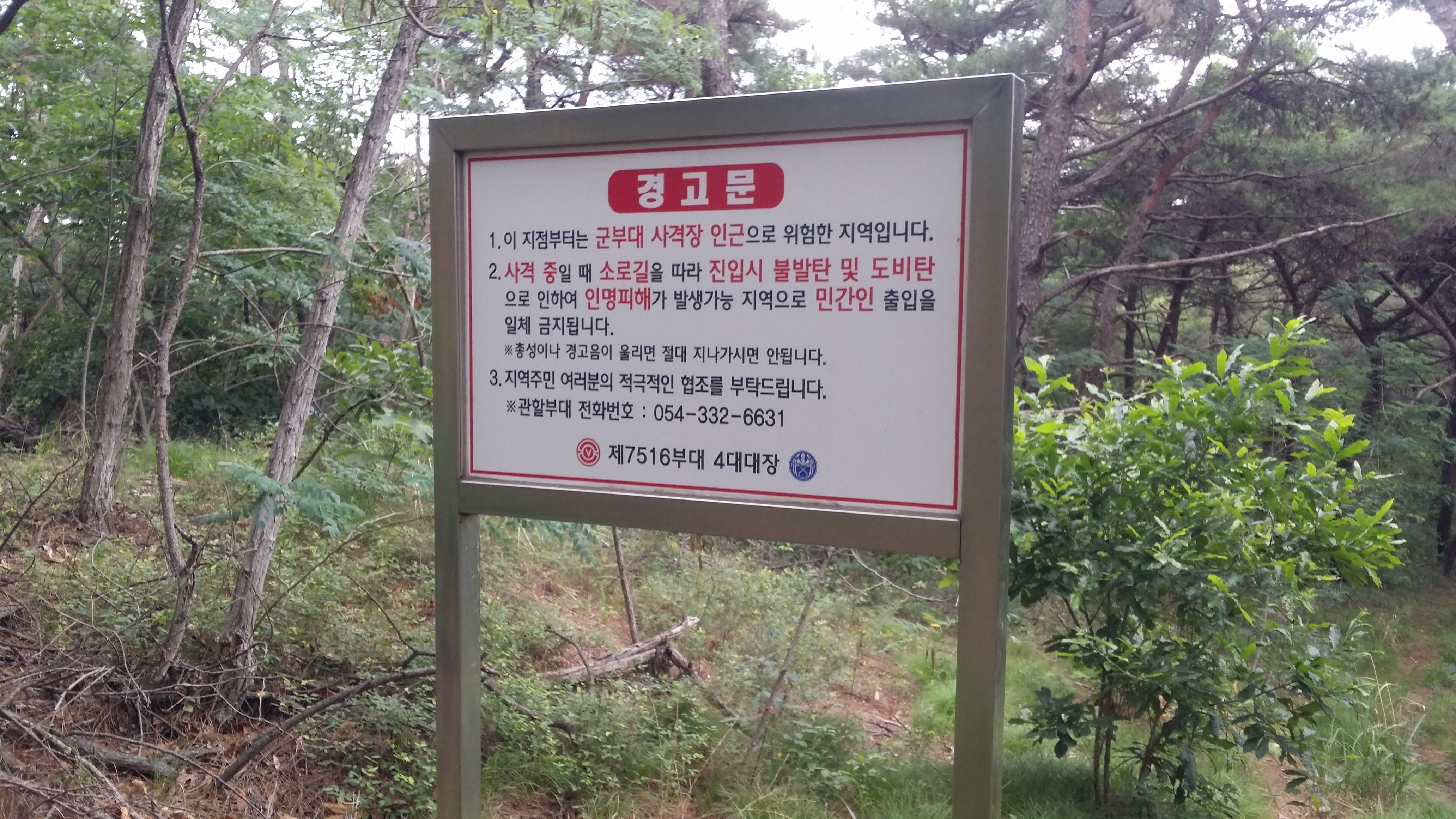13:40 군부대 사격장 경고문 / 도대체 사격장이 어디에 있는지. 경고문은 뒤돌아 앉아 있다. 즉 내가 온길에 사격장이 있으니 출입하지 말라는건데 사격장에 대한 안내패찰을 보지 못했다