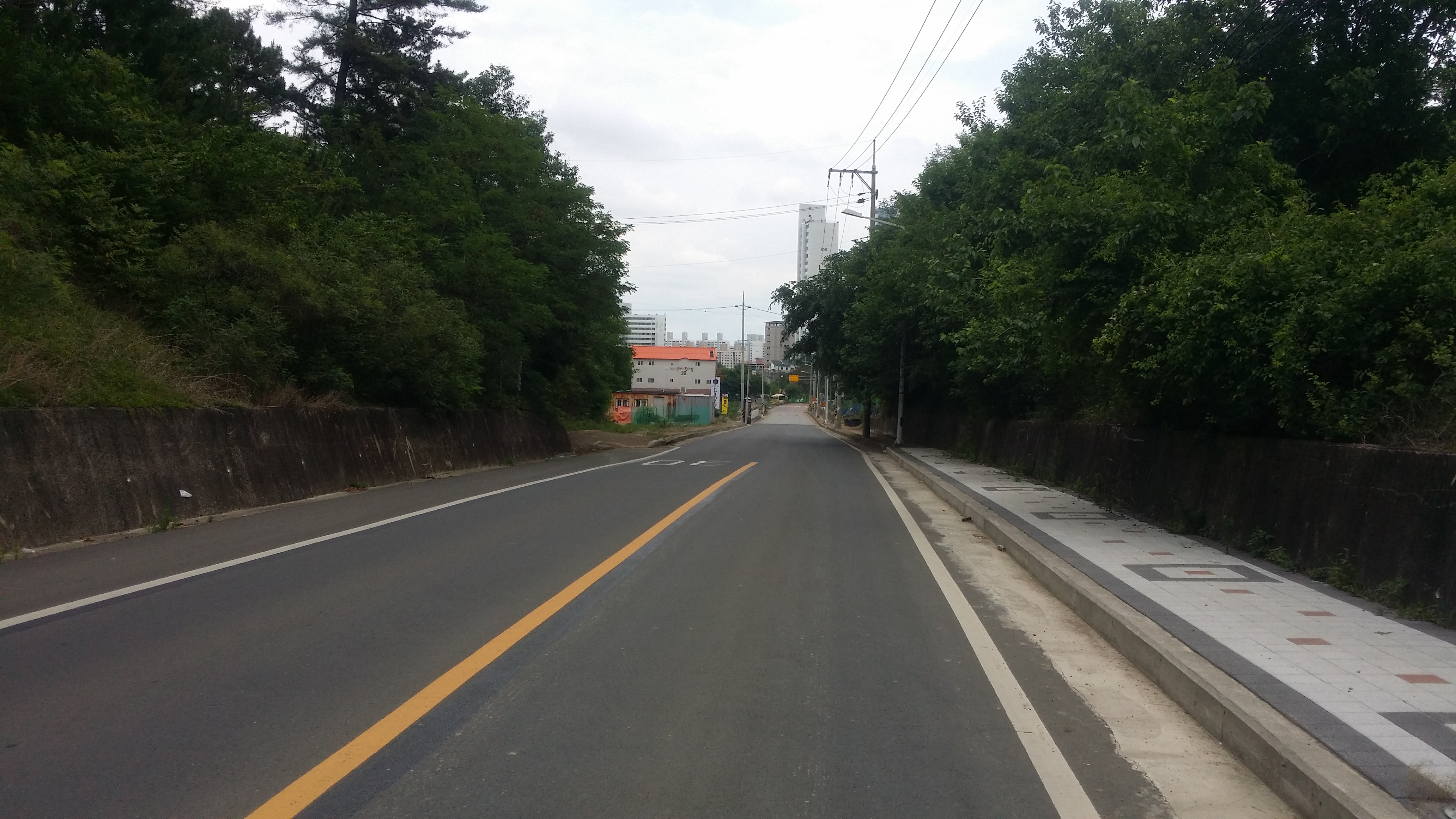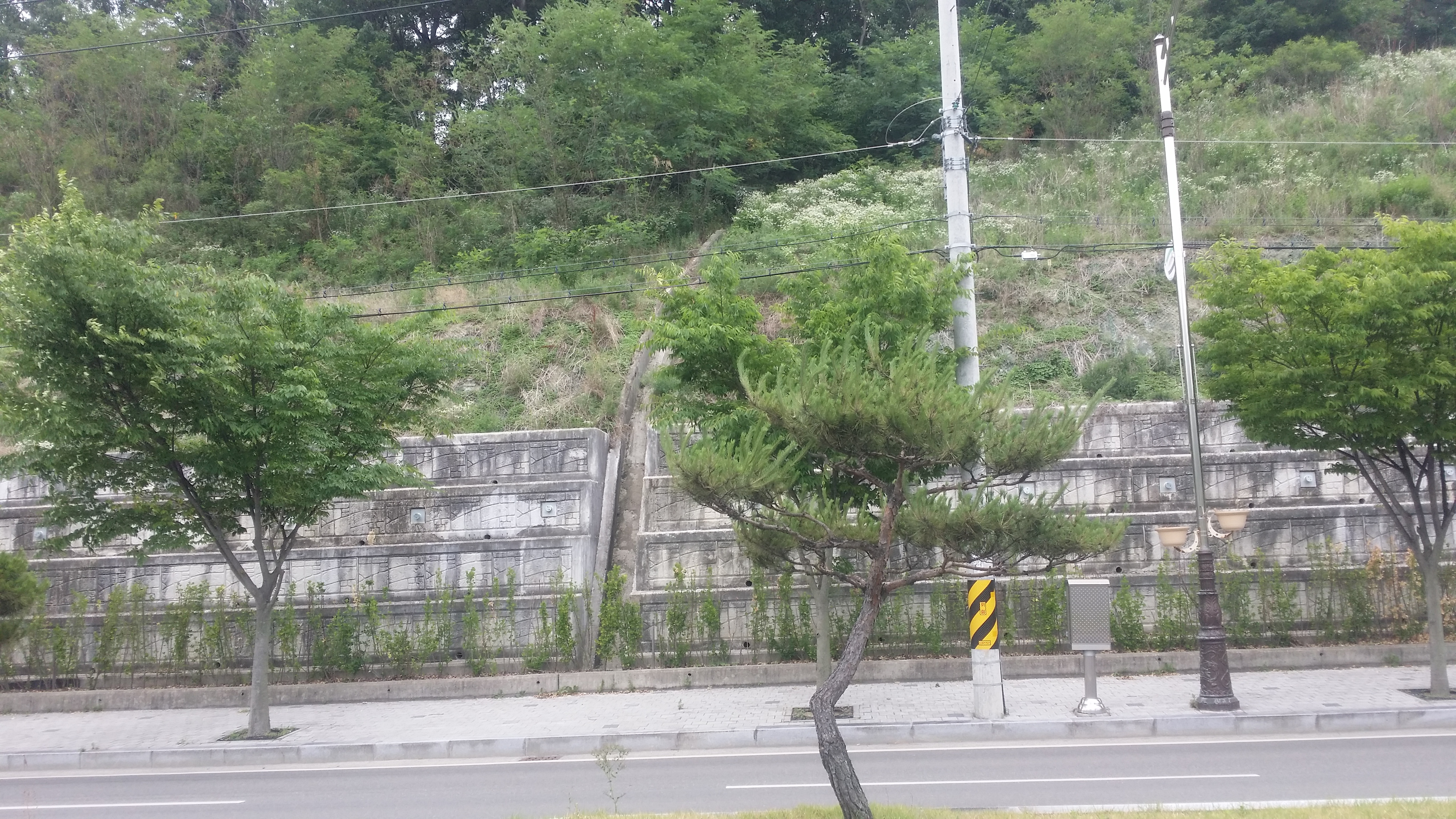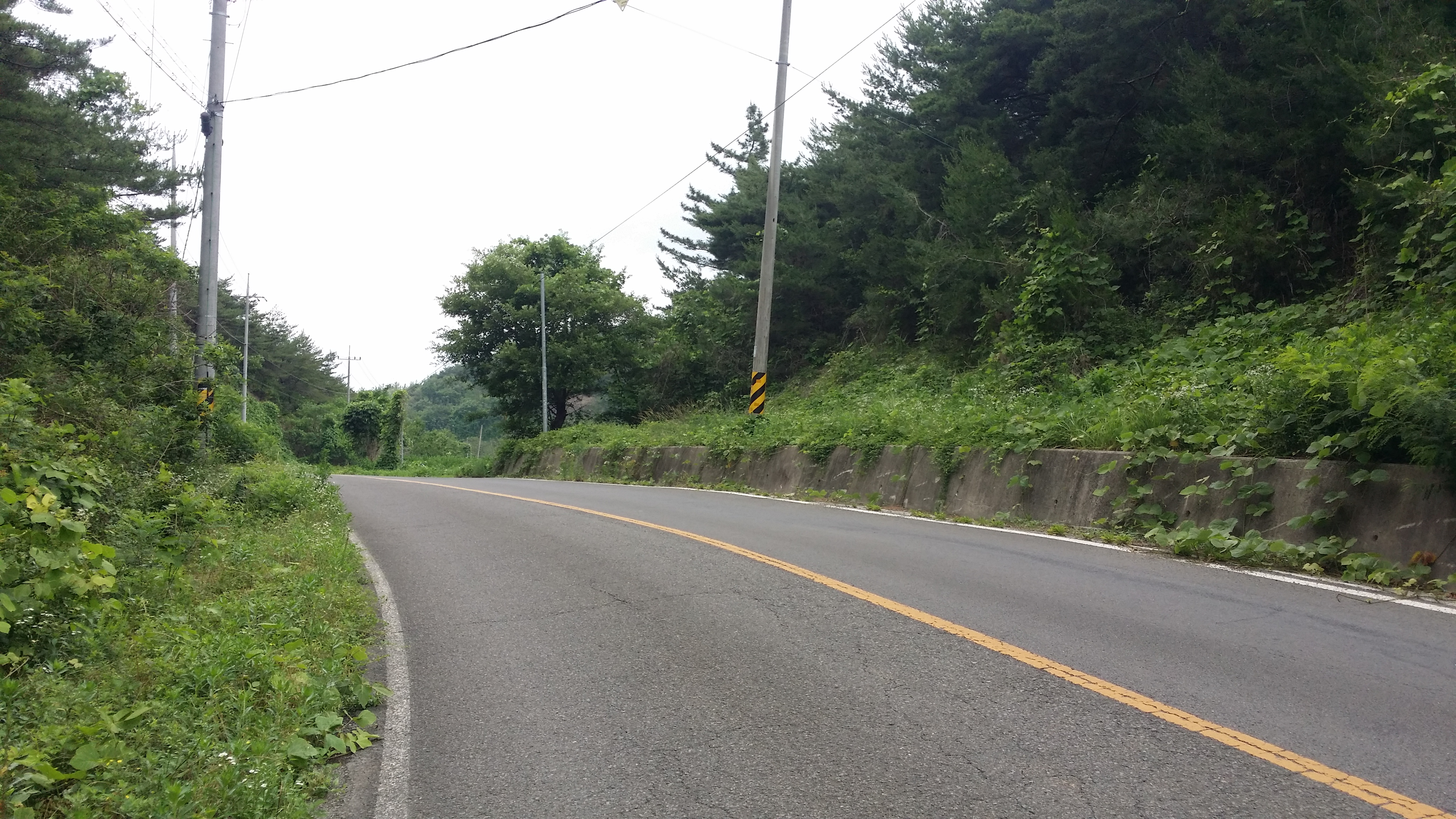 14:44 뒷고개 / 도로 절개지로 인하여 마루금은 좌측 또는 우측으로 우회하여야 하는데 축대로 직등한다
