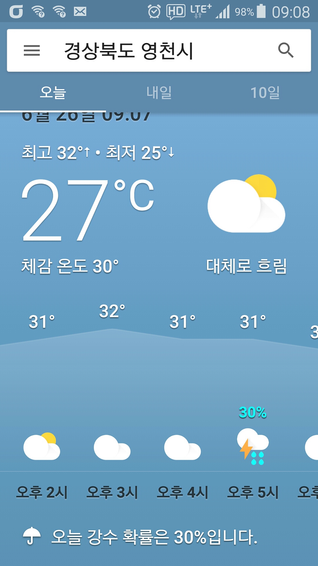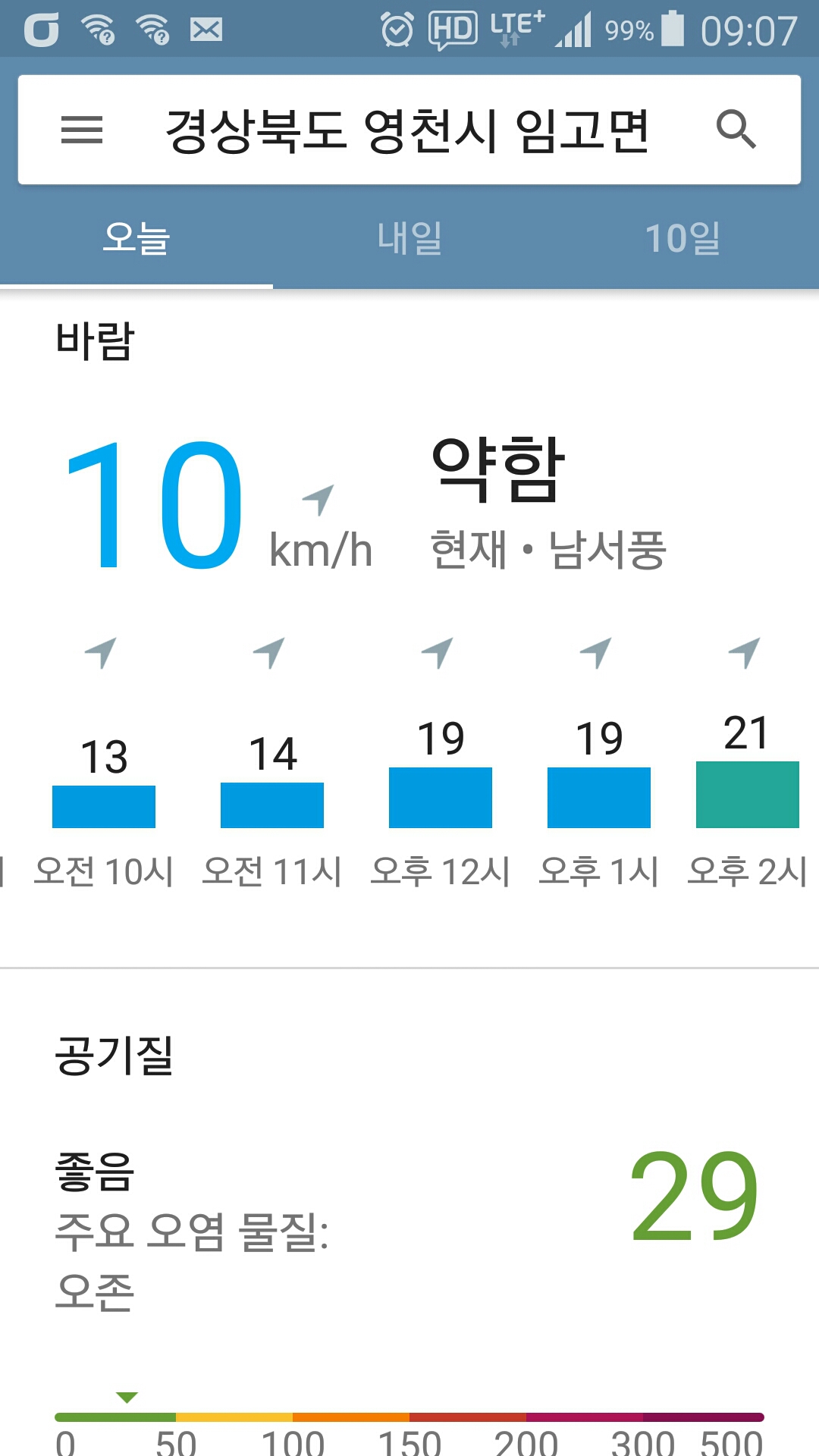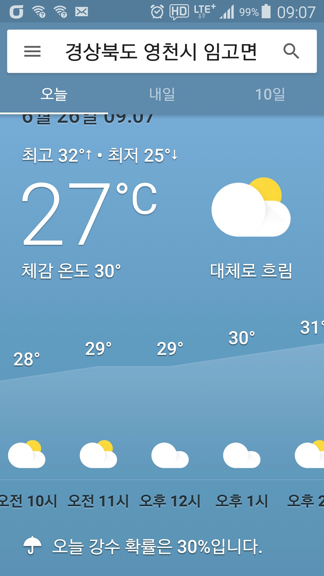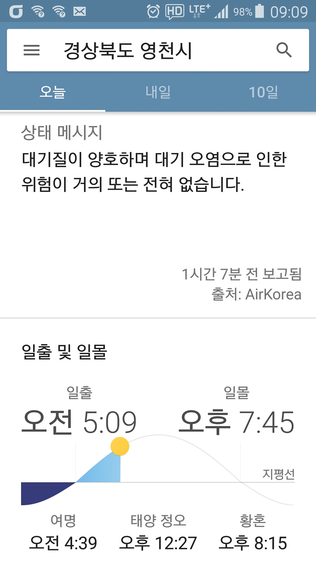 - 기상 : 28˚ ~ 32˚, 습도 ?%, 바람 13~21(약함), 공기질 29(좋음), 일몰 19시45분