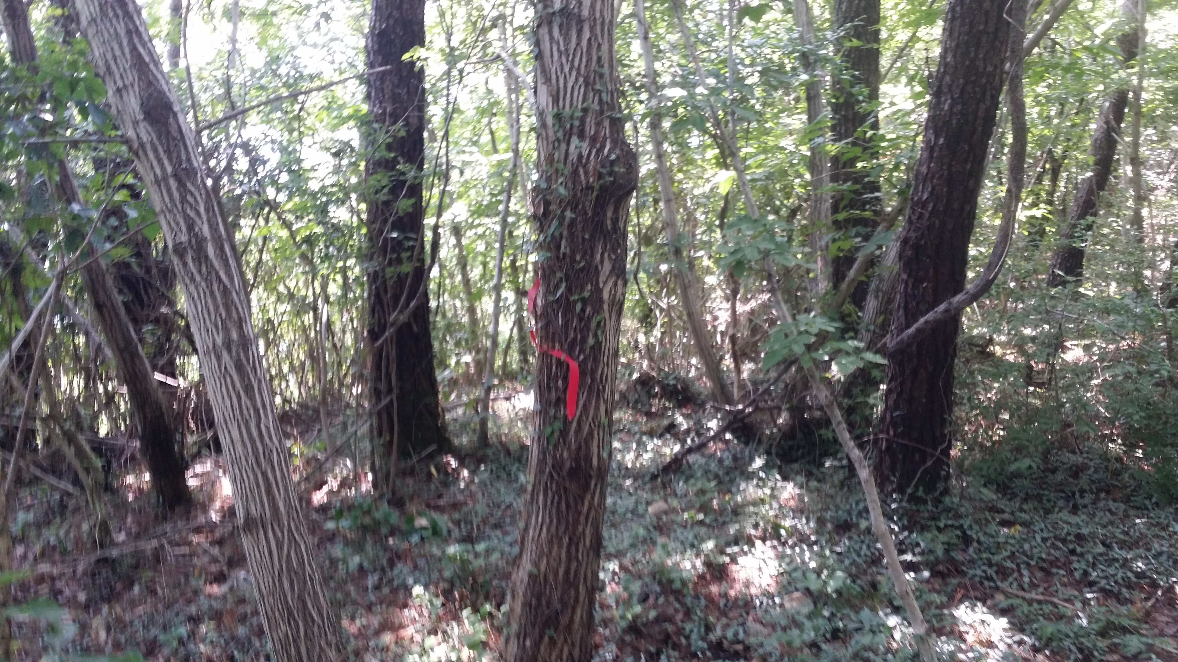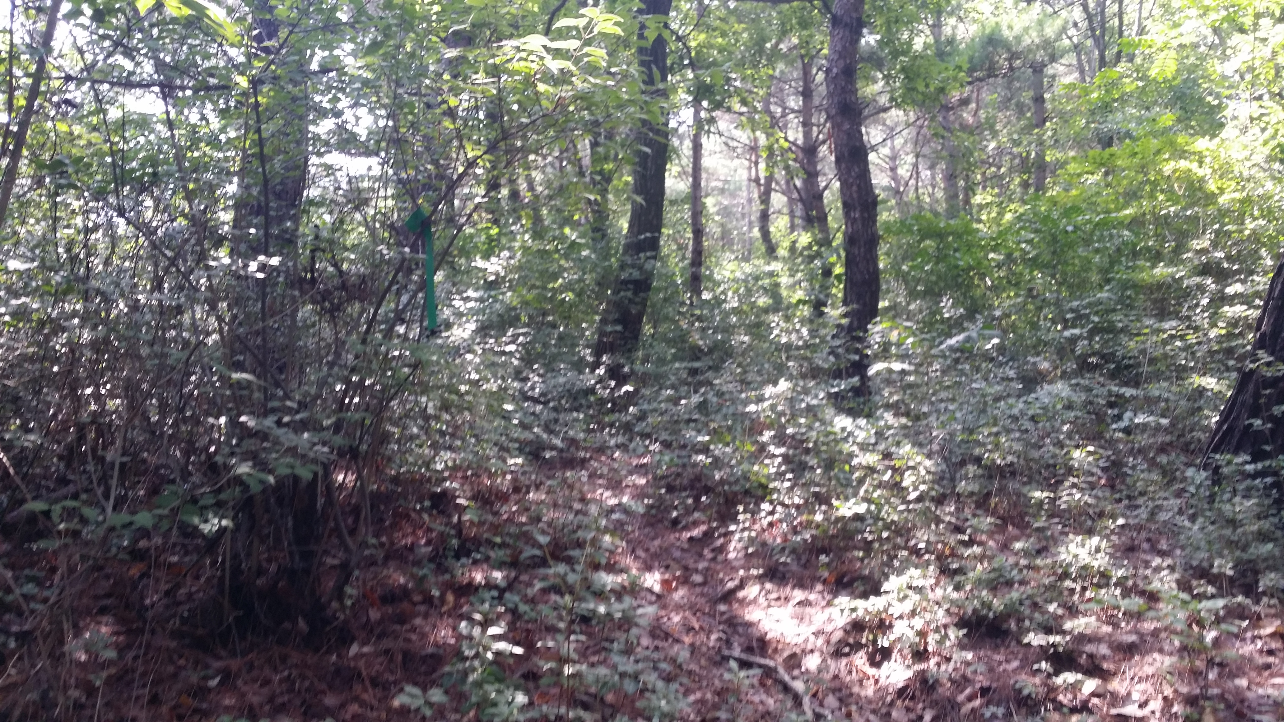 11:19 좌측으로 초록색 시그럴이 보인다. 동묘산 초입이다. 등로는 양호한편인데, 정상에 다가가면 조림을 빼곡히 한데다 가시넝굴이 군데군데 자라고 있어 약간은 진행하는데 상그럽다