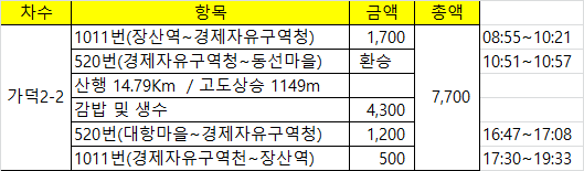 - 비상식 : 물[2.7L 준비 / 2.2L 소모], 행동식[김밥1줄, 양갱50g, 사탕1개, 계란1개, 사과1개, 바나나1개 / 김밥1줄, 양갱50g, 계란1개, 바나나1개 소모]