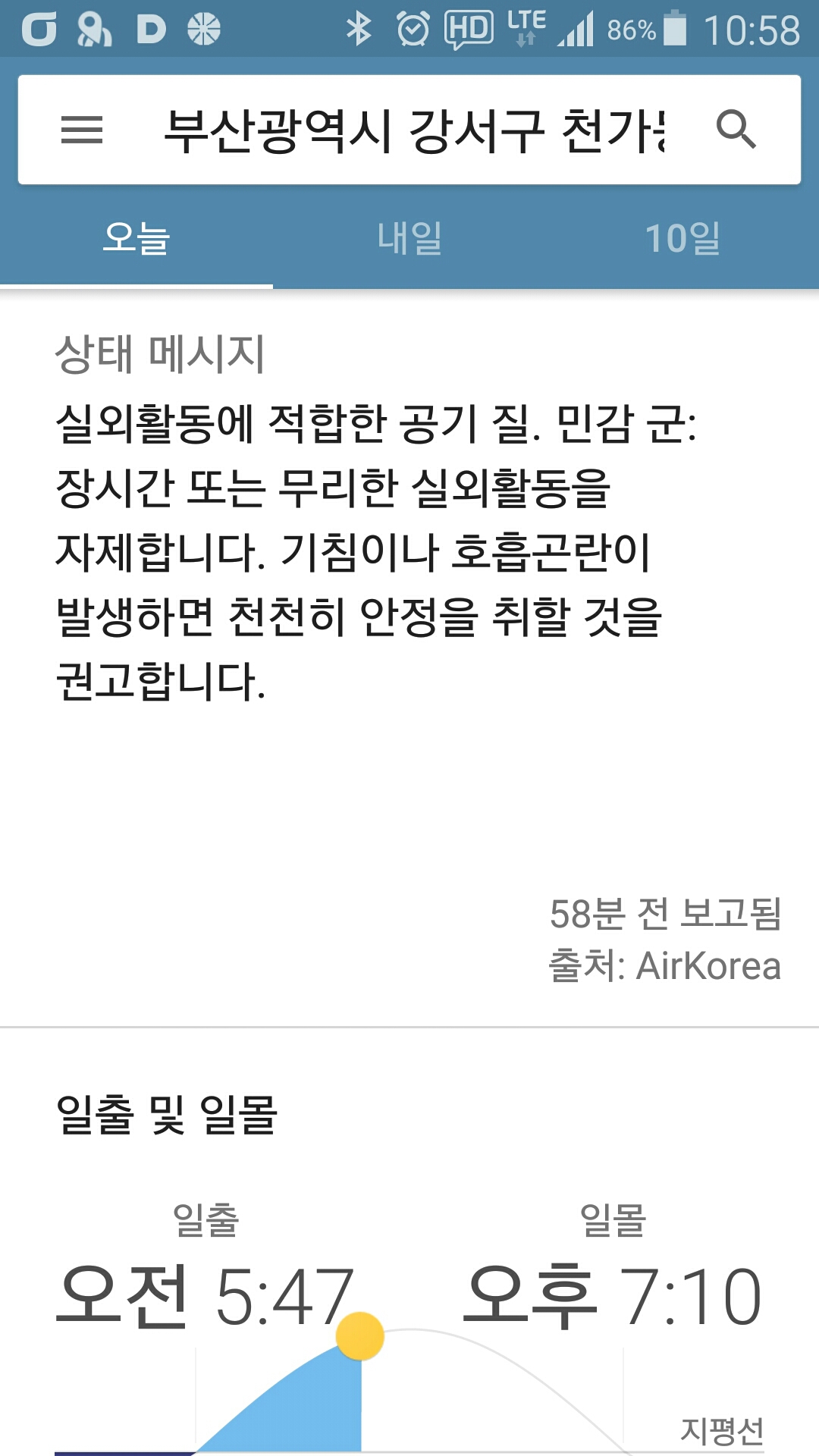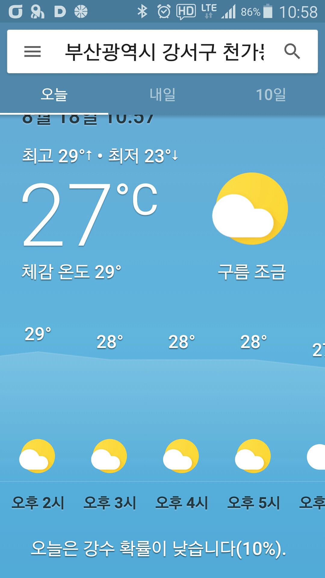- 기상 : 27˚ ~ 29˚, 습도 74%, 바람 5~10(잔잔), 공기질 74(보통), 일몰 19시10분