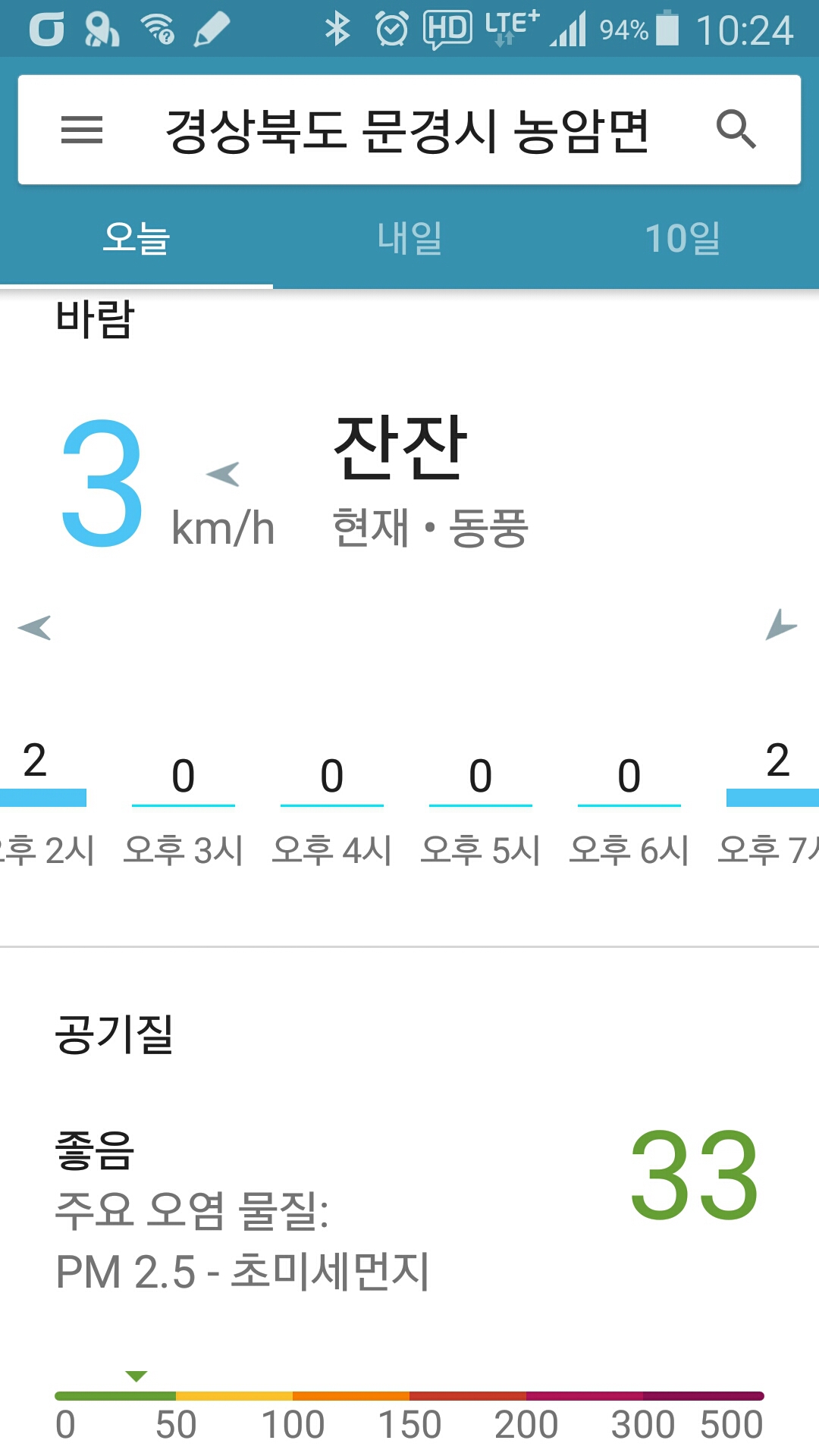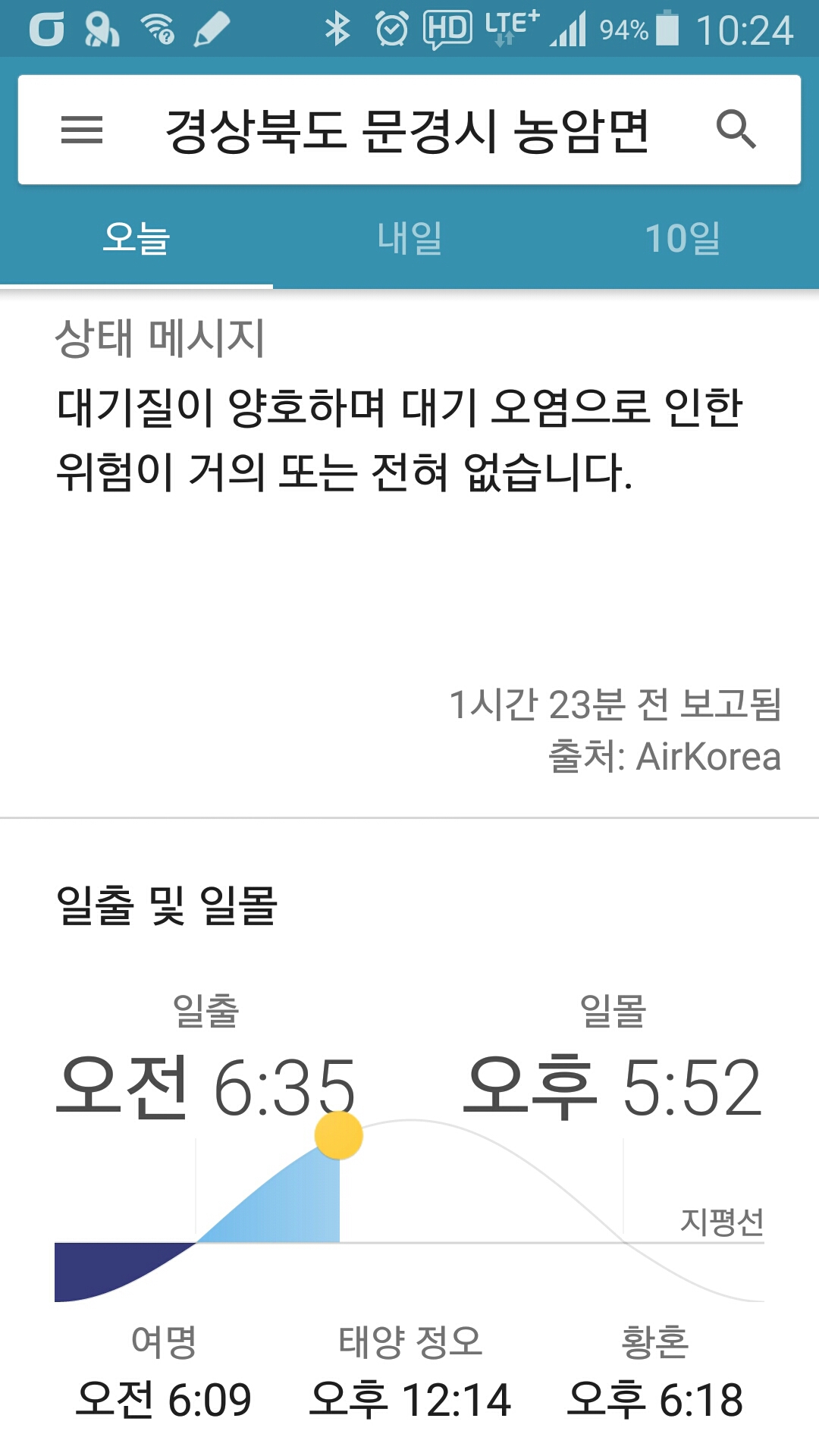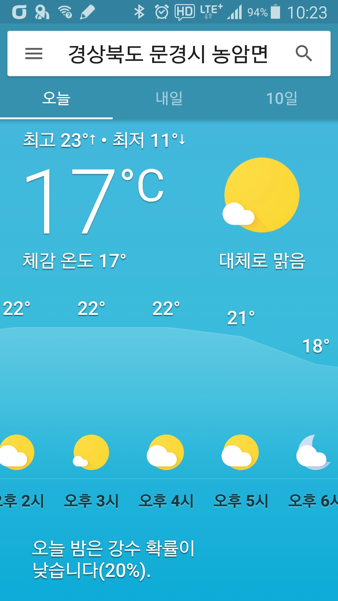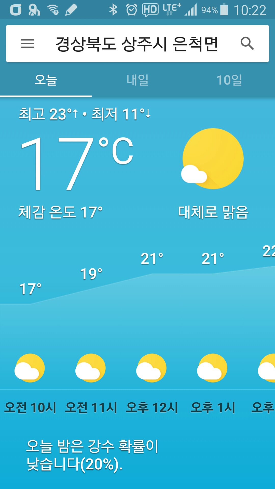 - 기상 : 17˚ ~ 22˚, 습도 75%, 바람 2~0(잔잔), 공기질 33(좋음), 일몰 17시52분