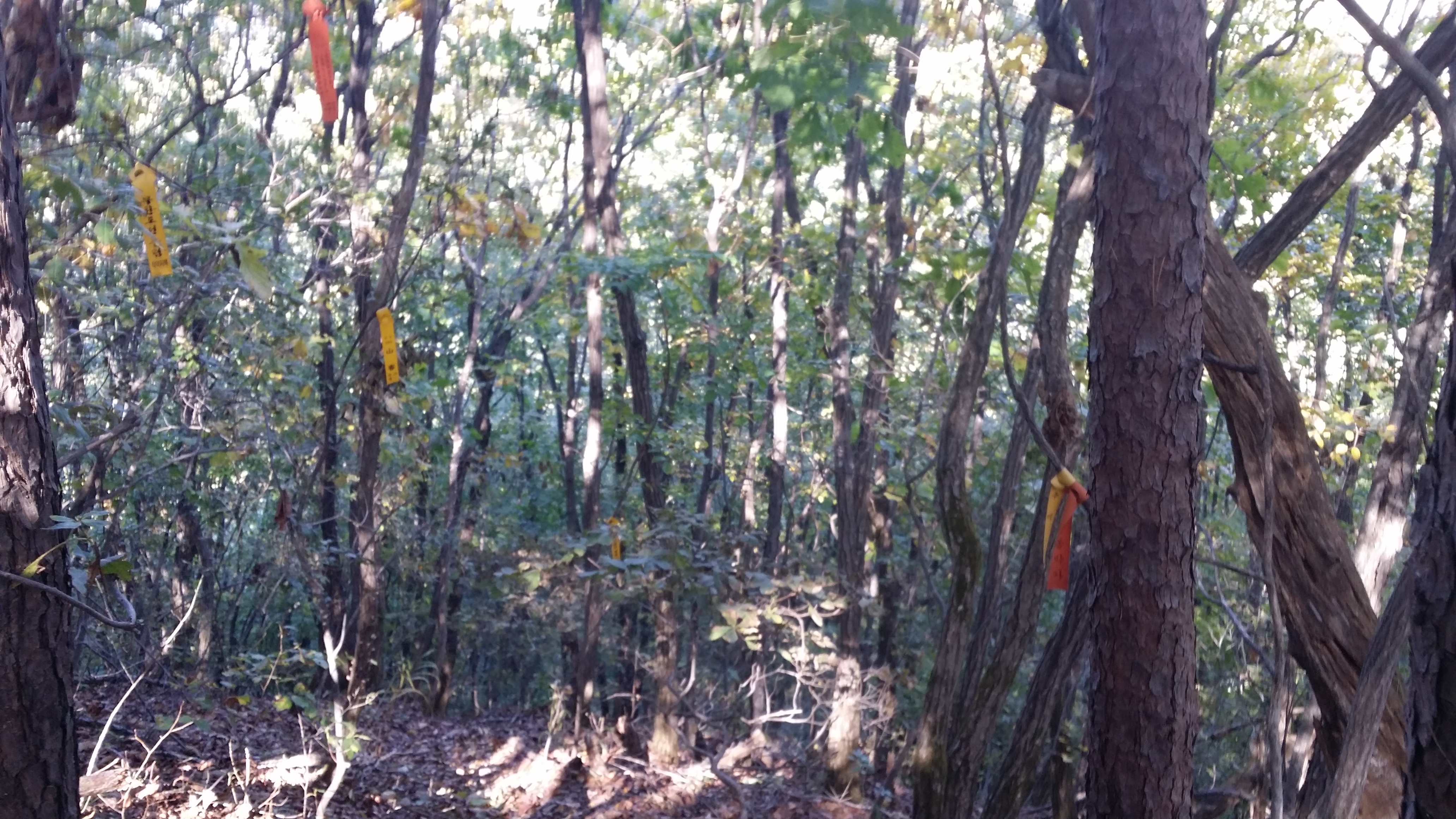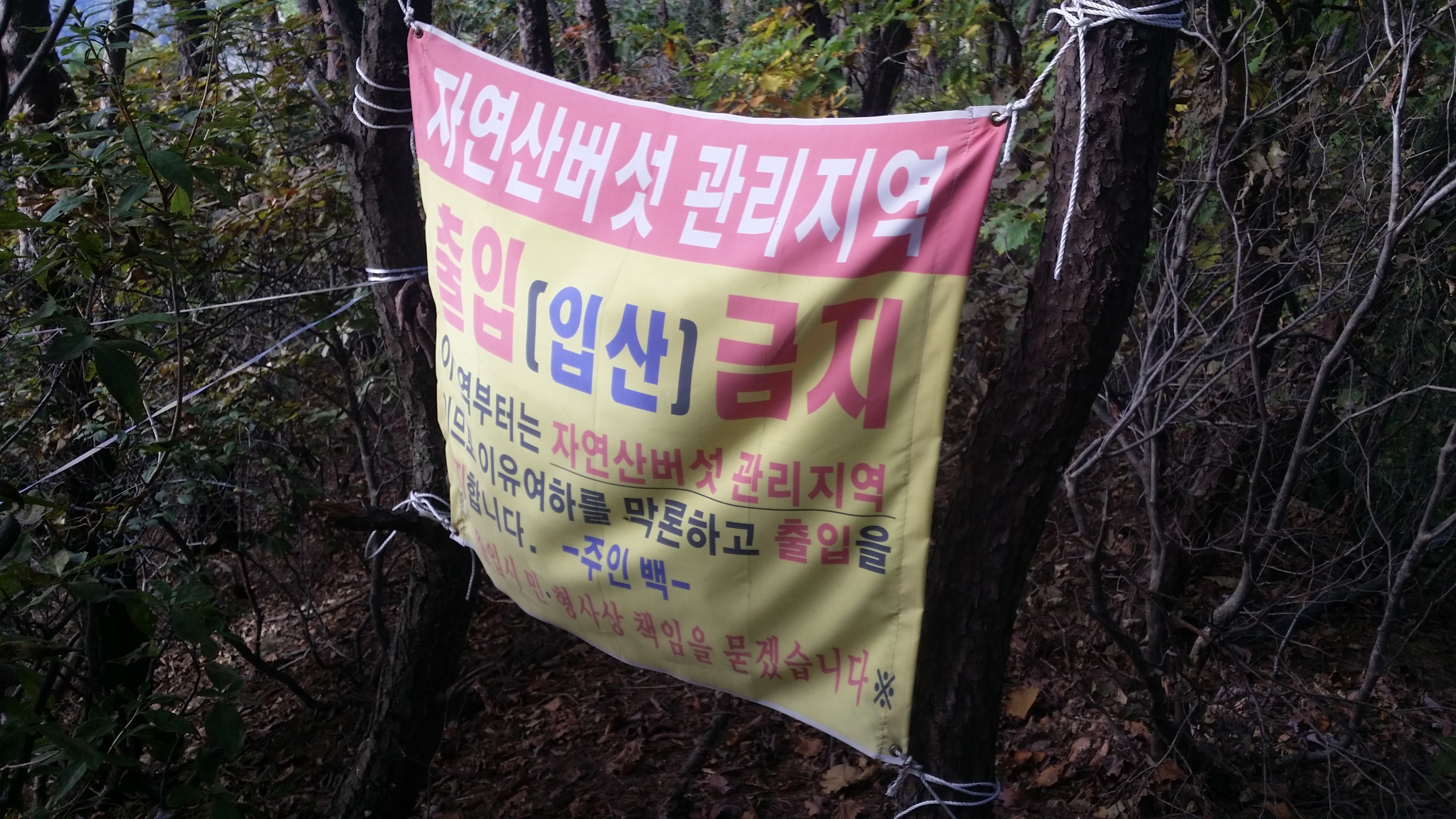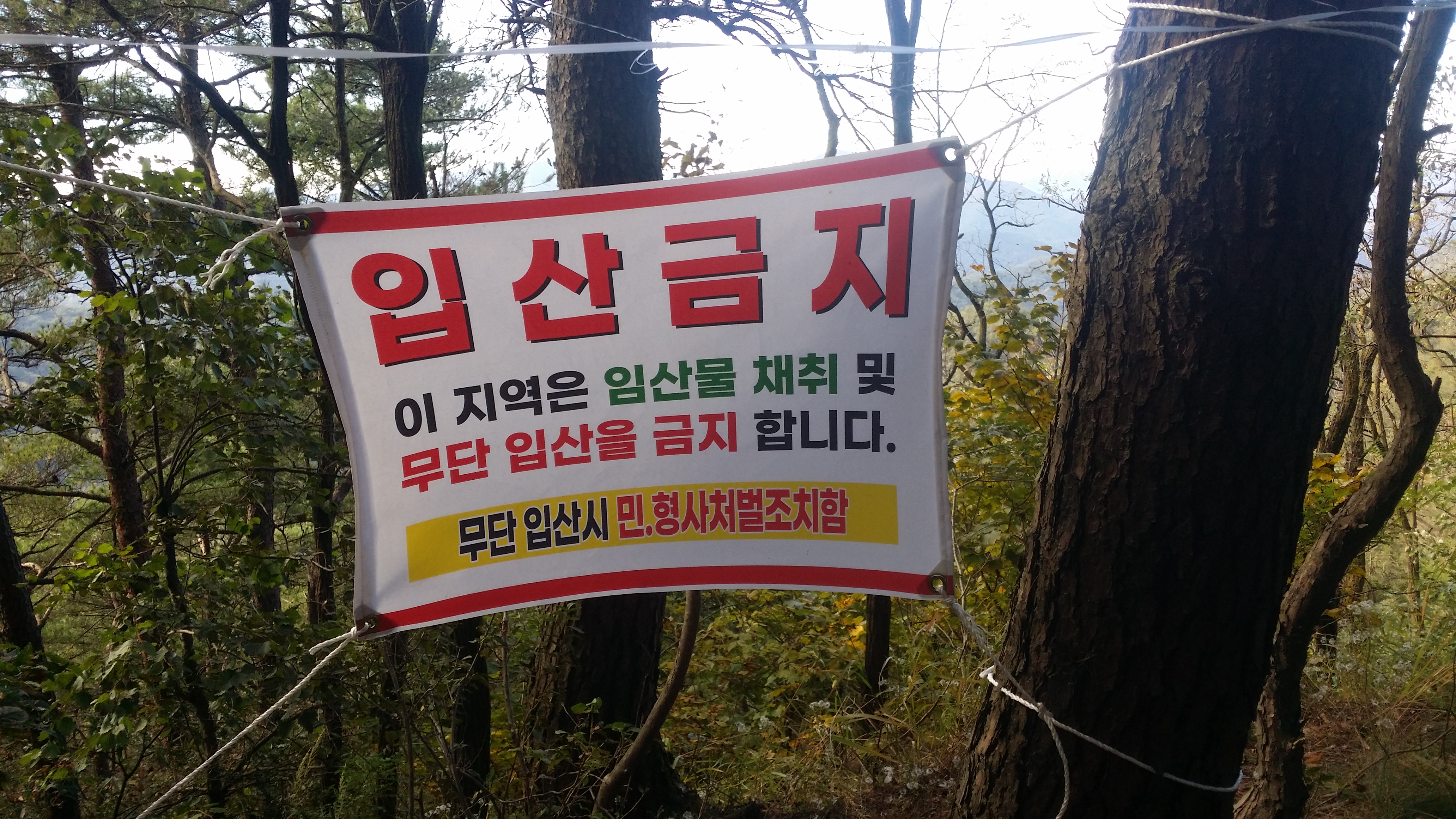 15:19 입산금지 현수막이 줄기차게 붙어 있다. 진행방향 좌측 능선 아래로 진입하지 말라는 뜻같으며 산막이 없어 마음은 놓였다