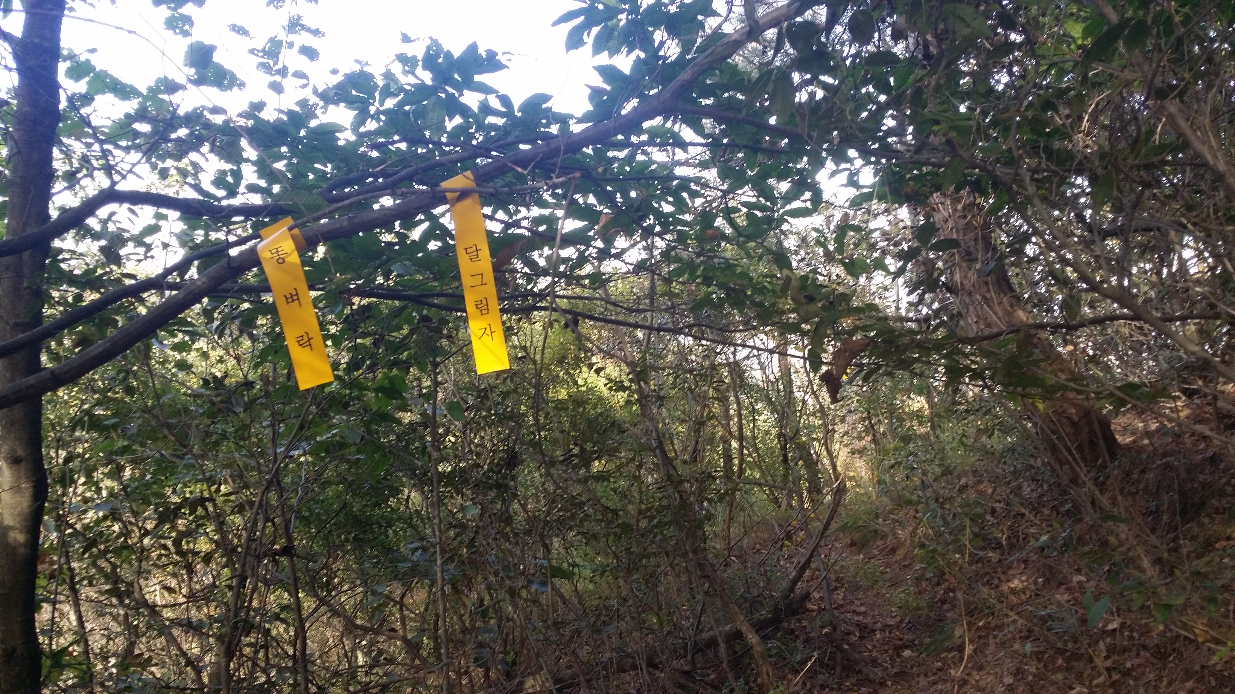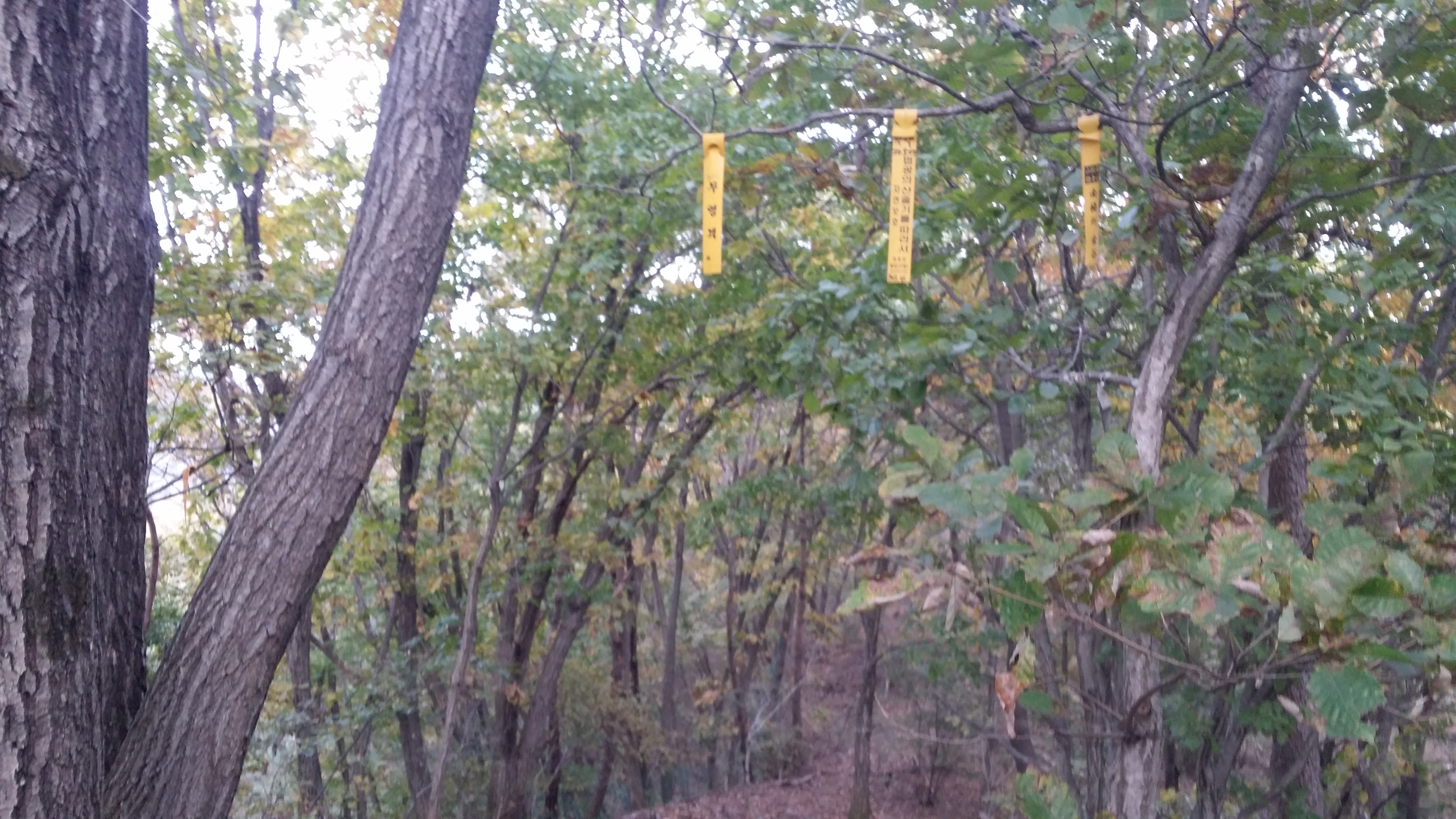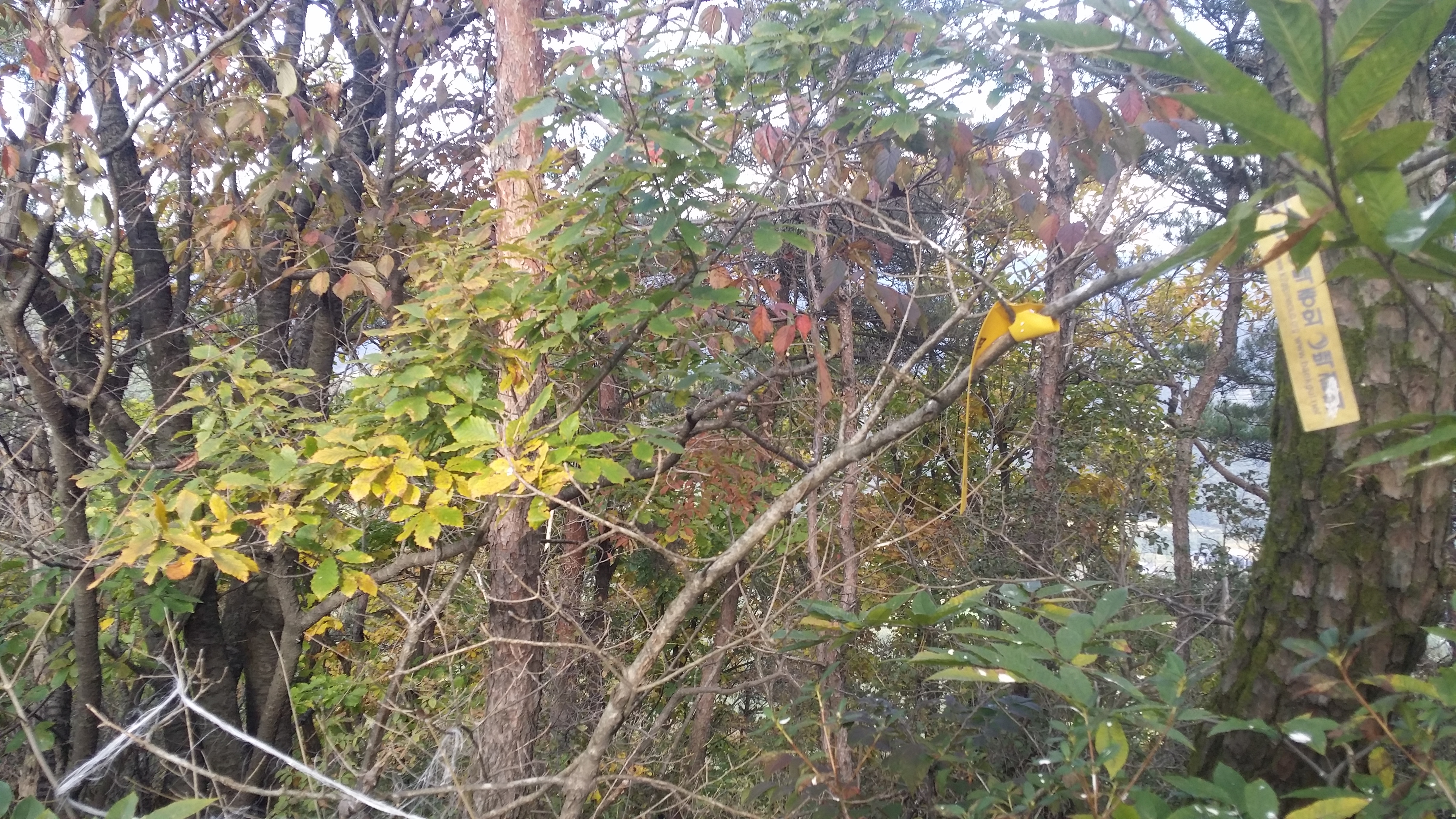15:19 입산금지 현수막이 줄기차게 붙어 있다. 진행방향 좌측 능선 아래로 진입하지 말라는 뜻같으며 산막이 없어 마음은 놓였다