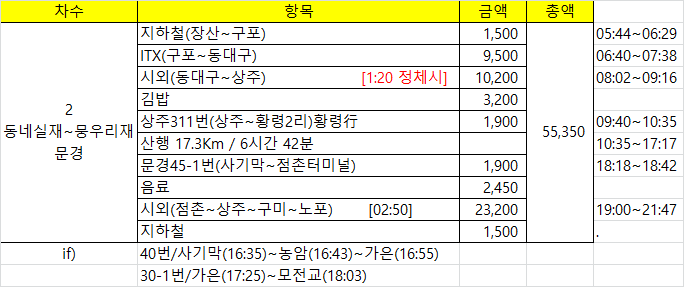 - 비상식 : 물[1.6L 준비 / 1.2L 소모], 행동식[김밥1줄, 양갱50g, 사탕1개, 사과1개, 바나나2개, 계란2개 / 김밥1줄, 사탕1개. 바나나1개, 계란1개 소모]