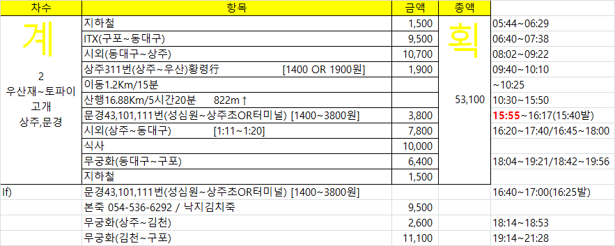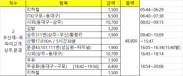 - 비상식 : 물[1L 준비 / 0.85L 소모], 행동식[김밥1줄, 양갱50g, 사탕1개, 사과1개, 계란2개 / 김밥⅝줄 소모]