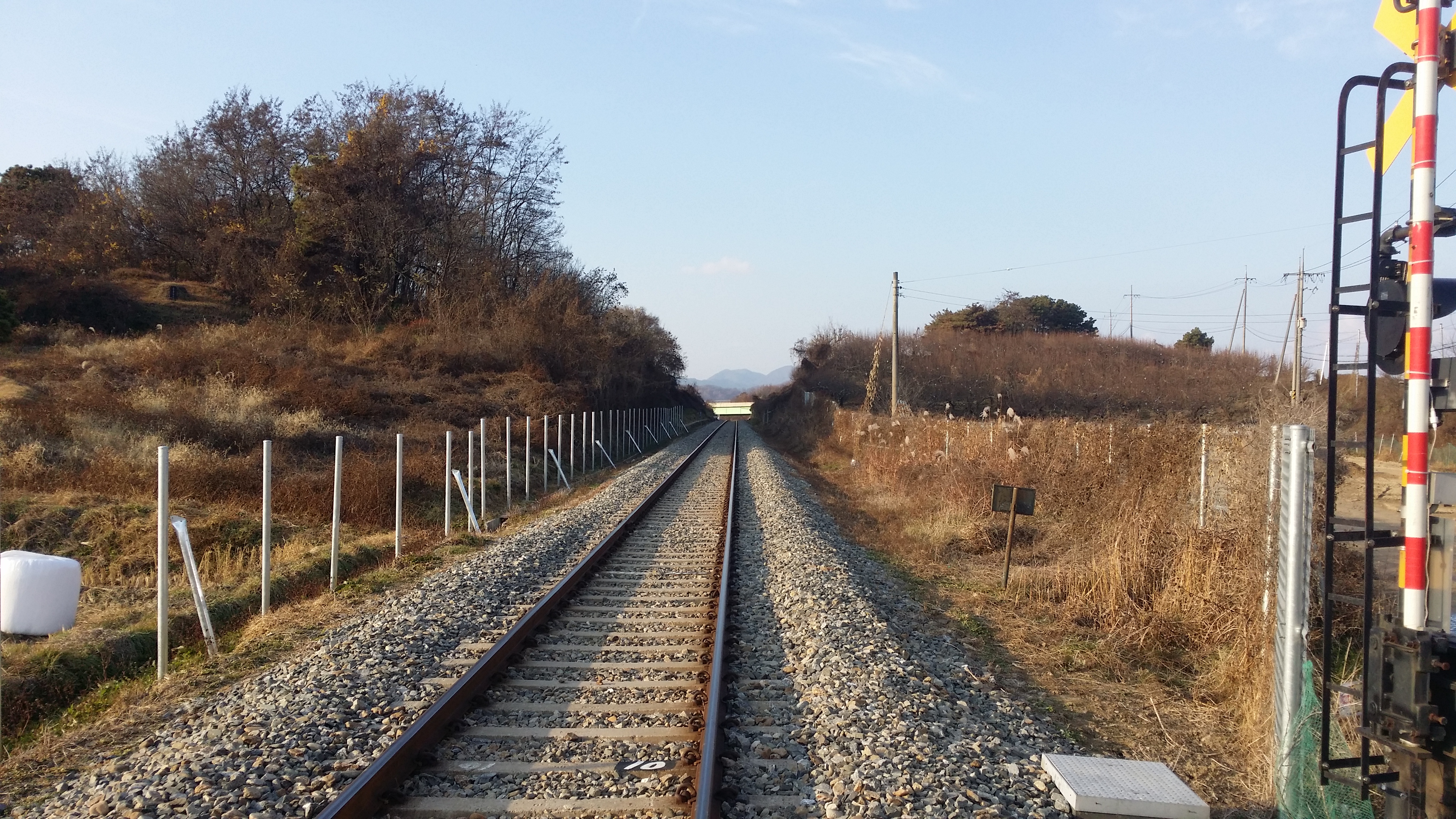 15:42 경북선 / 철길 양편으로 철책이 세워져 있고, 건너편엔 과수원이다. 횡단할 적당한 지점을 찾다 결국 성심원 버스 정류소 인근 건널목까지 내려 왔다
