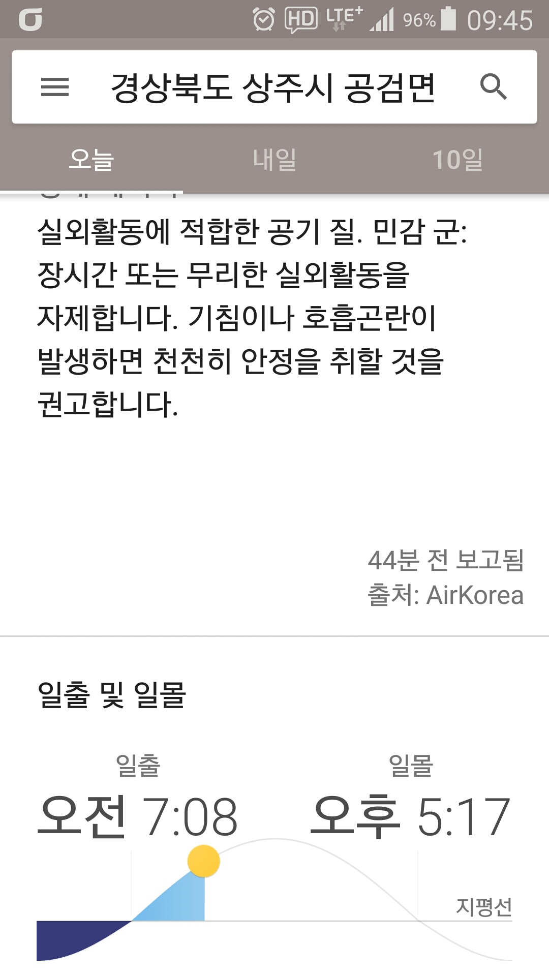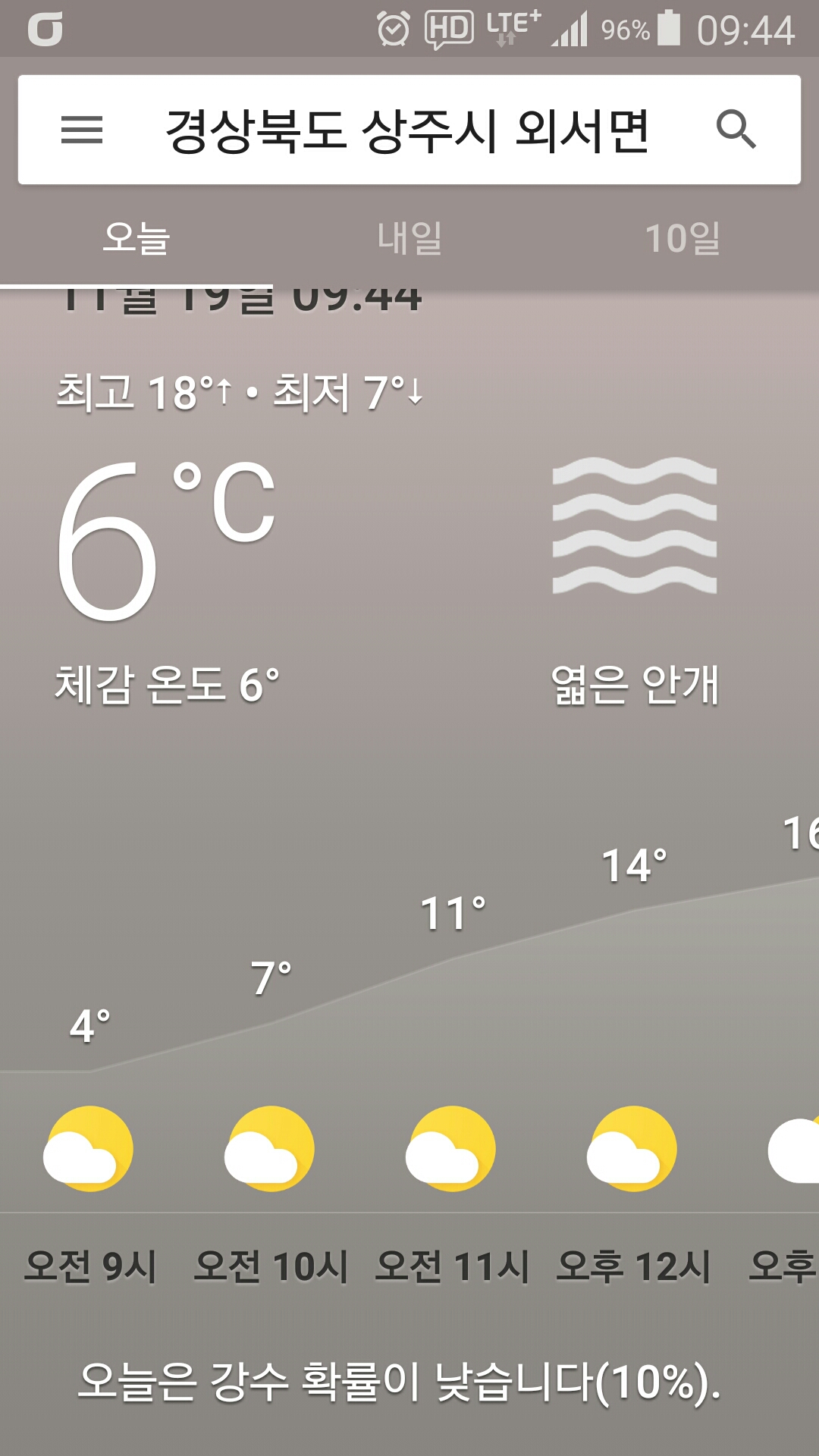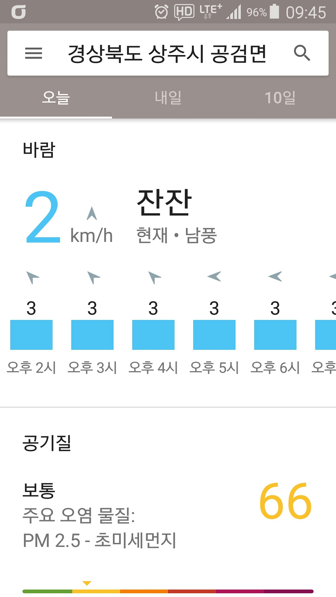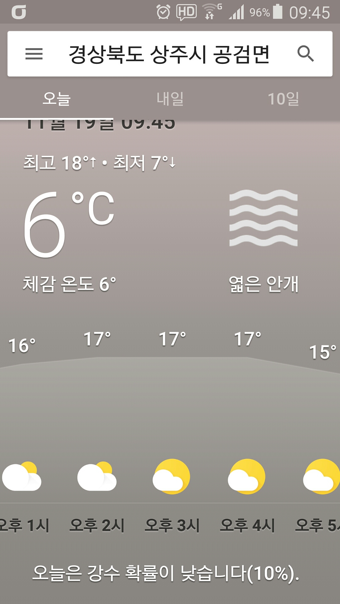 - 기상 : 7˚ ~ 17˚, 습도 75%, 바람 3(잔잔), 공기질 66(보통), 일몰 17시17분