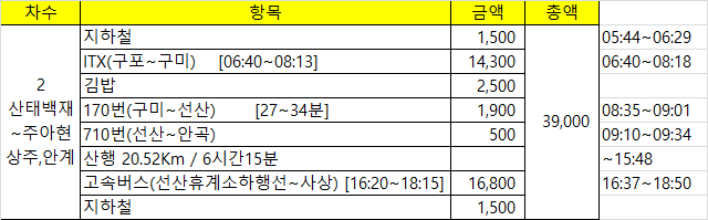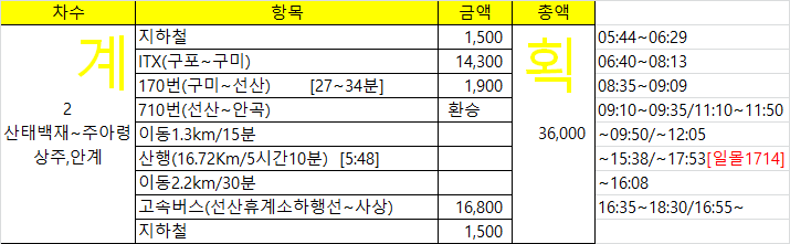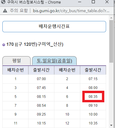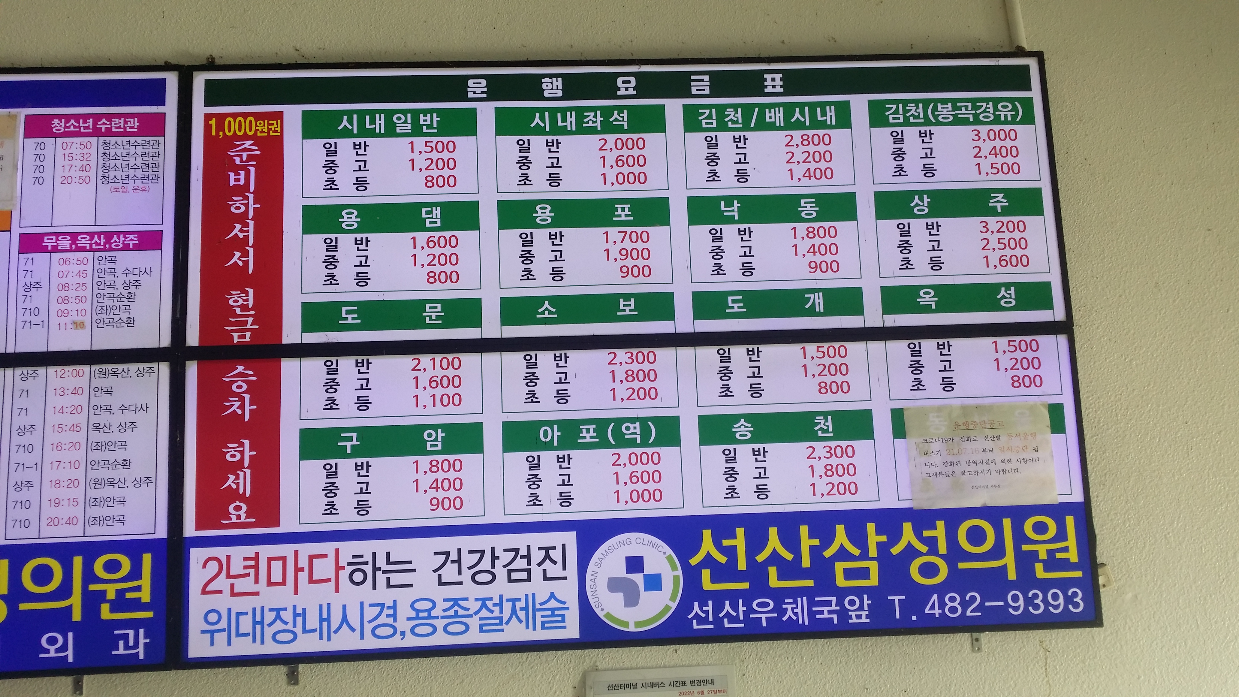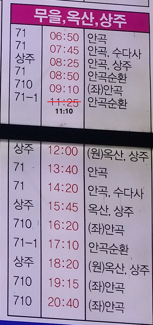 2번째 난관은 선산터미널에서 환승 문제다. 지금까지 170번을 이용 했을시 늦어도 34분내 도착했었는데, 이보다 더 걸리면 9시10분 안곡行 버스를 놓치고 11시10분 버스를 이용해야 하는데 문제는 야간 산행을 해야 한다