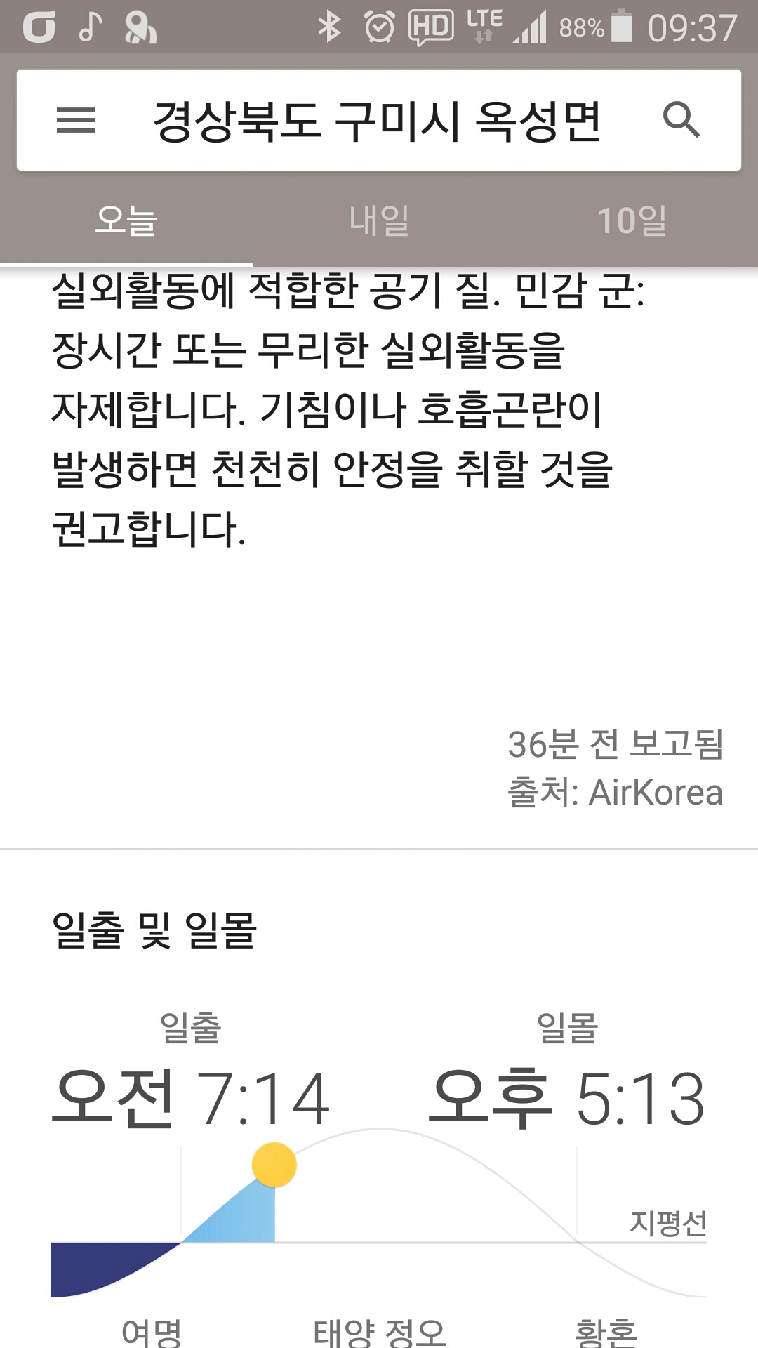 - 기상 : 9˚ ~ 13˚, 습도 72%, 바람 6~16(약함), 공기질 87(보통), 일몰 17시13분