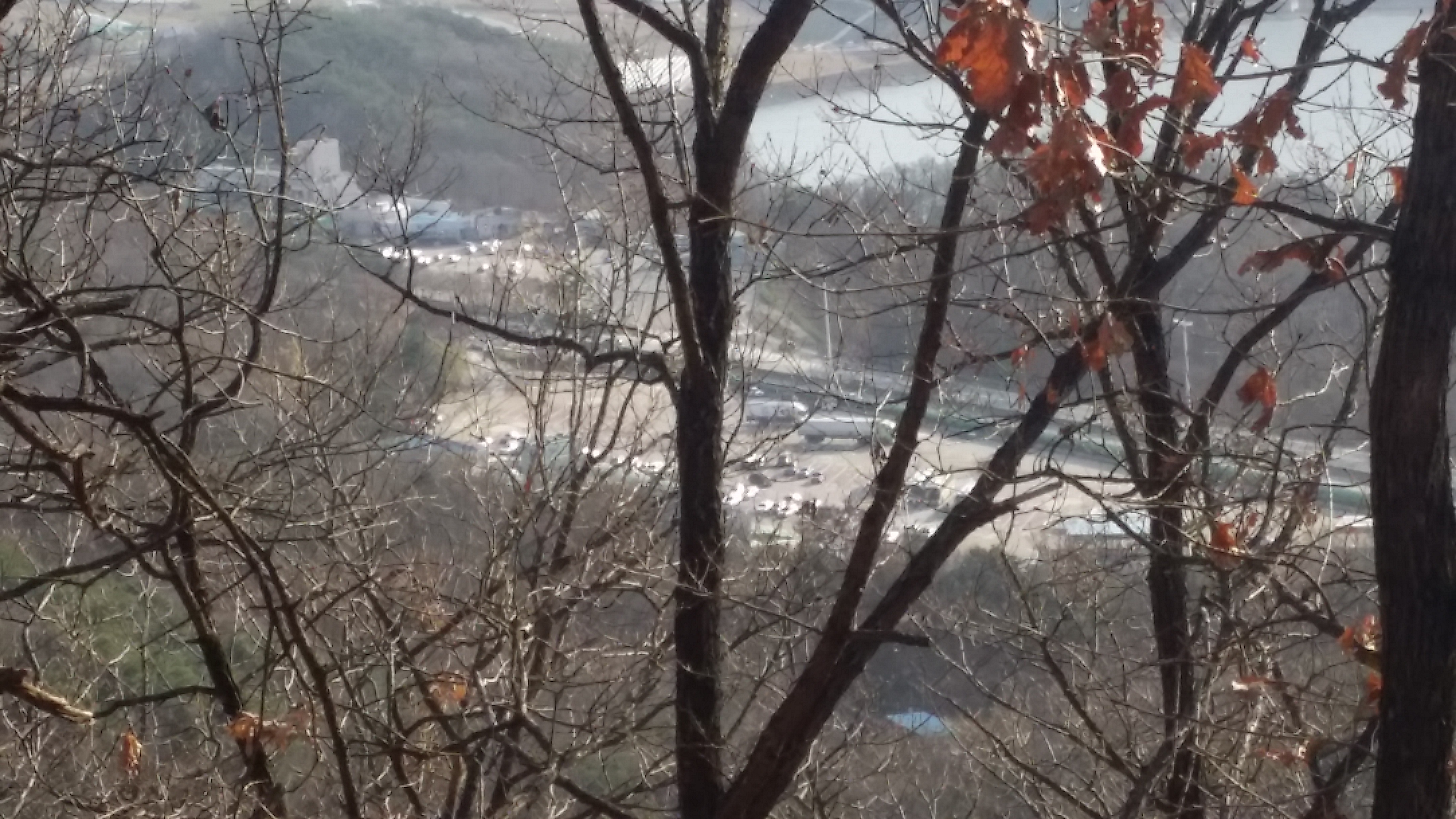14:52 나뭇가지 사이로 오늘의 최종 목적지 선산휴계소가 보인다