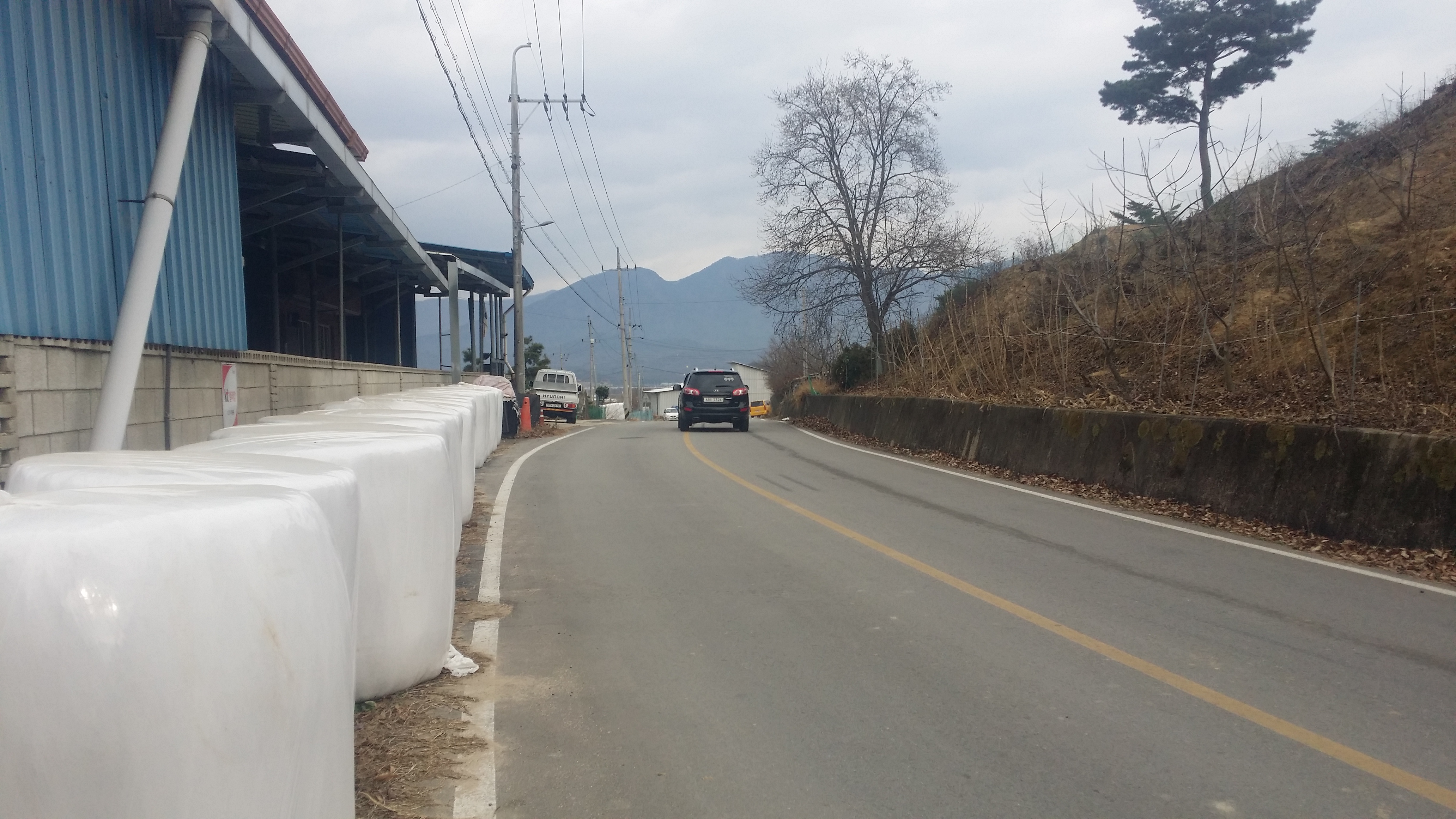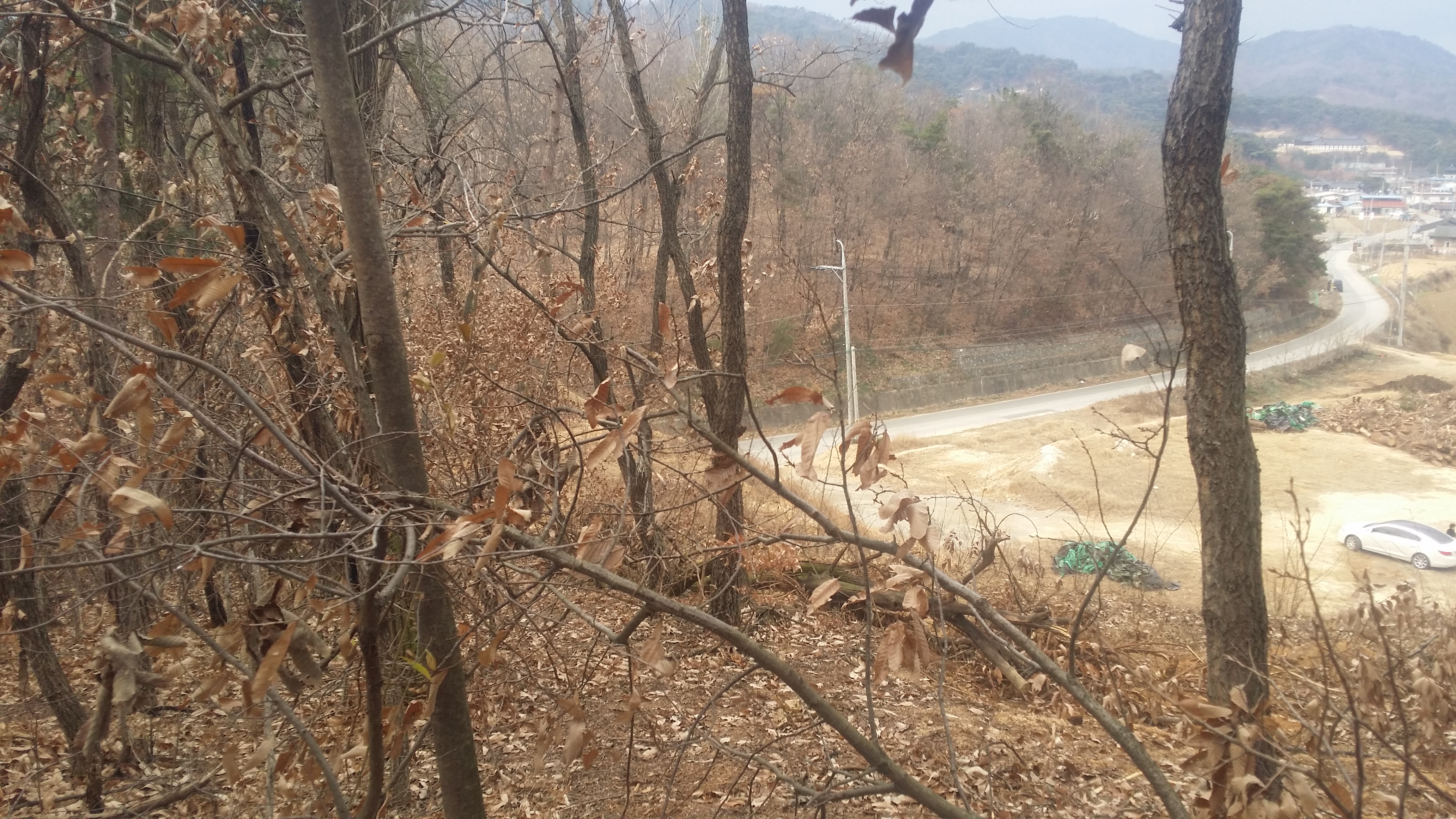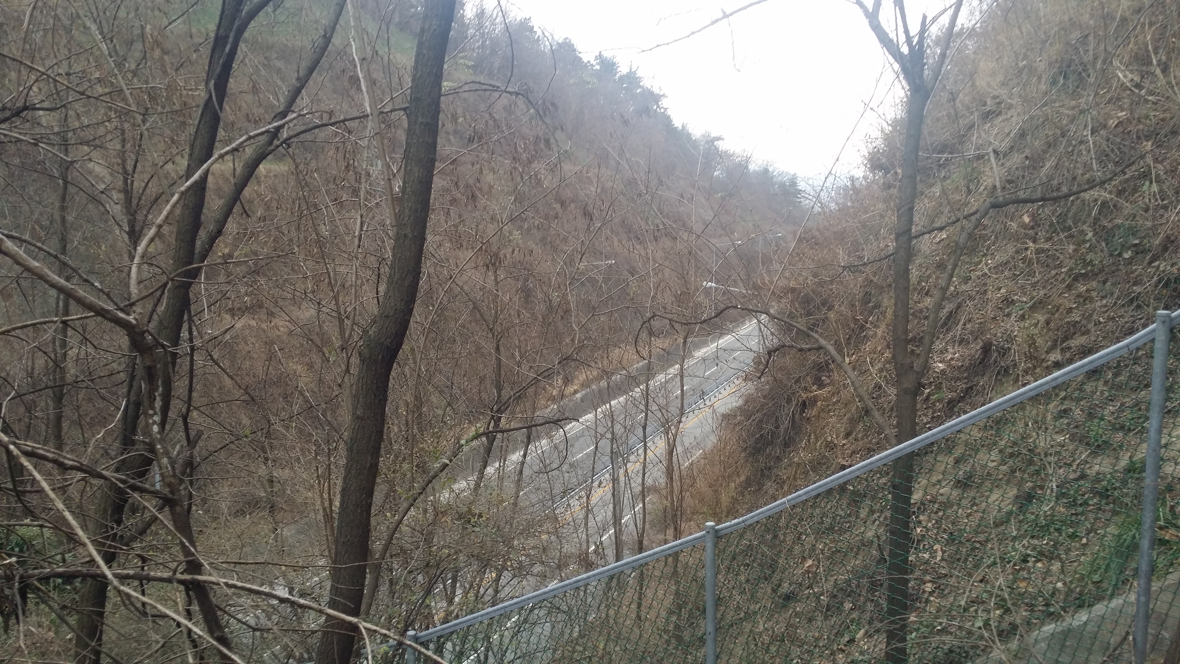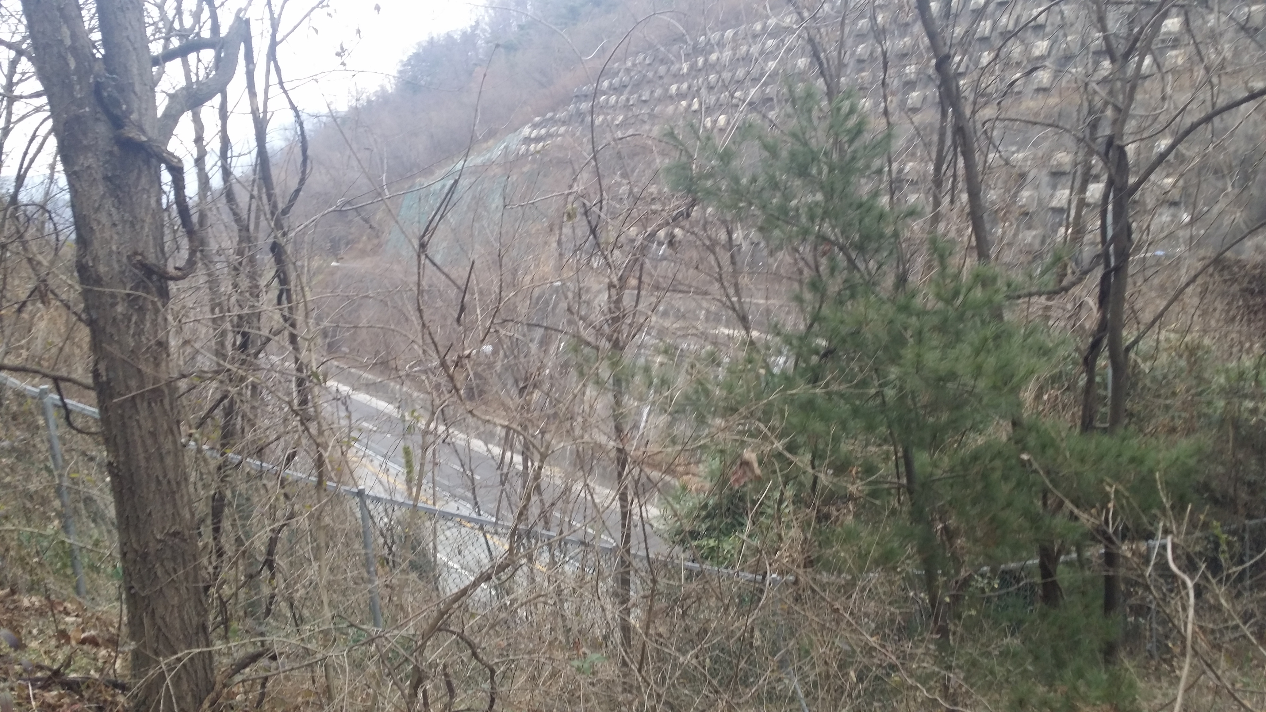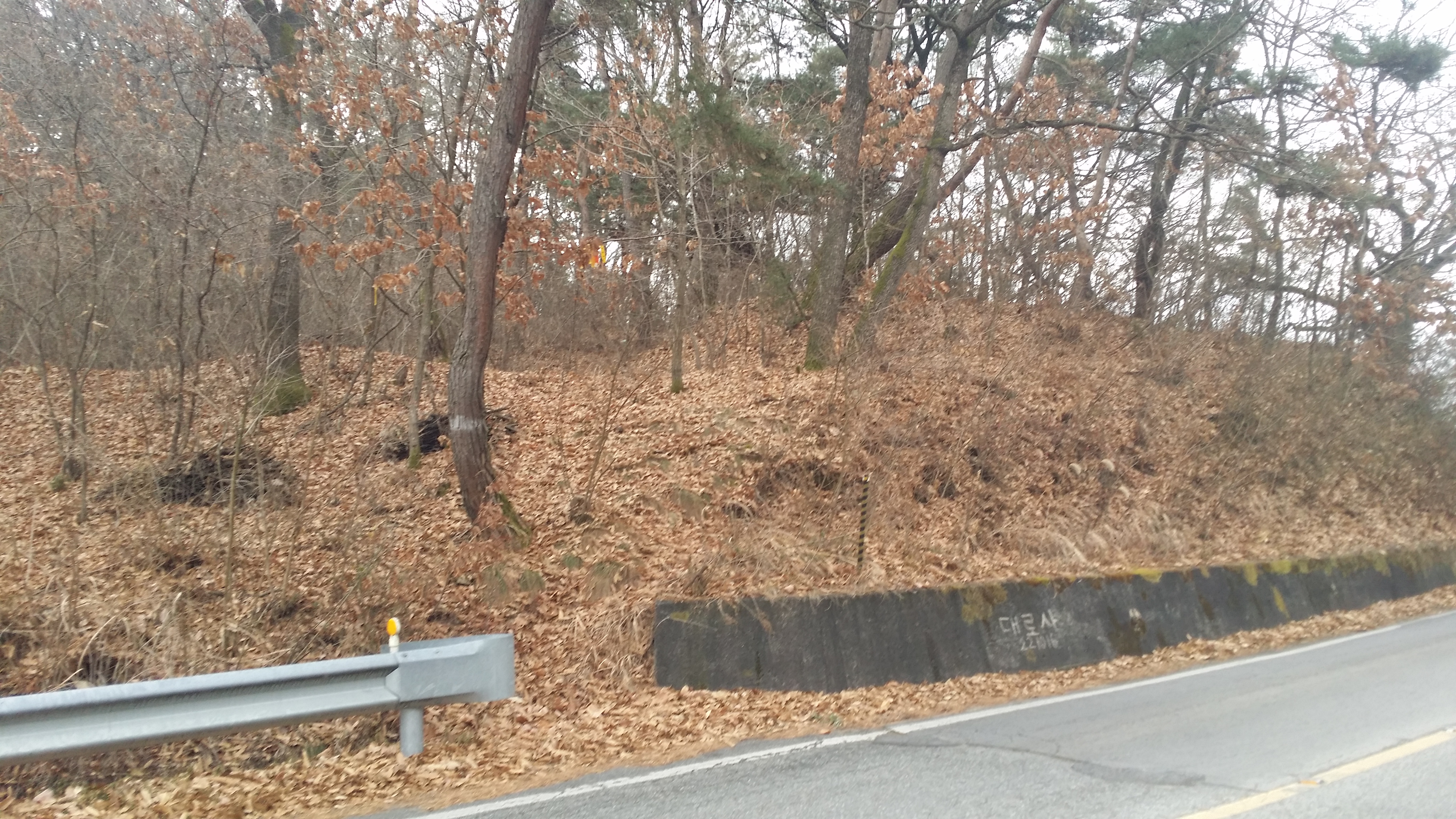 14:34~14:36 도로 / 절개지로 인하여 우측으로 우회하여 내려섰다. 마루금을 고집한다면 목재 야적장 옹벽을 올라서야 하는데 내려서며 보니 야적장에 사람들이 보여 포기하고 포기하고 길거너 묘지로 올라선다