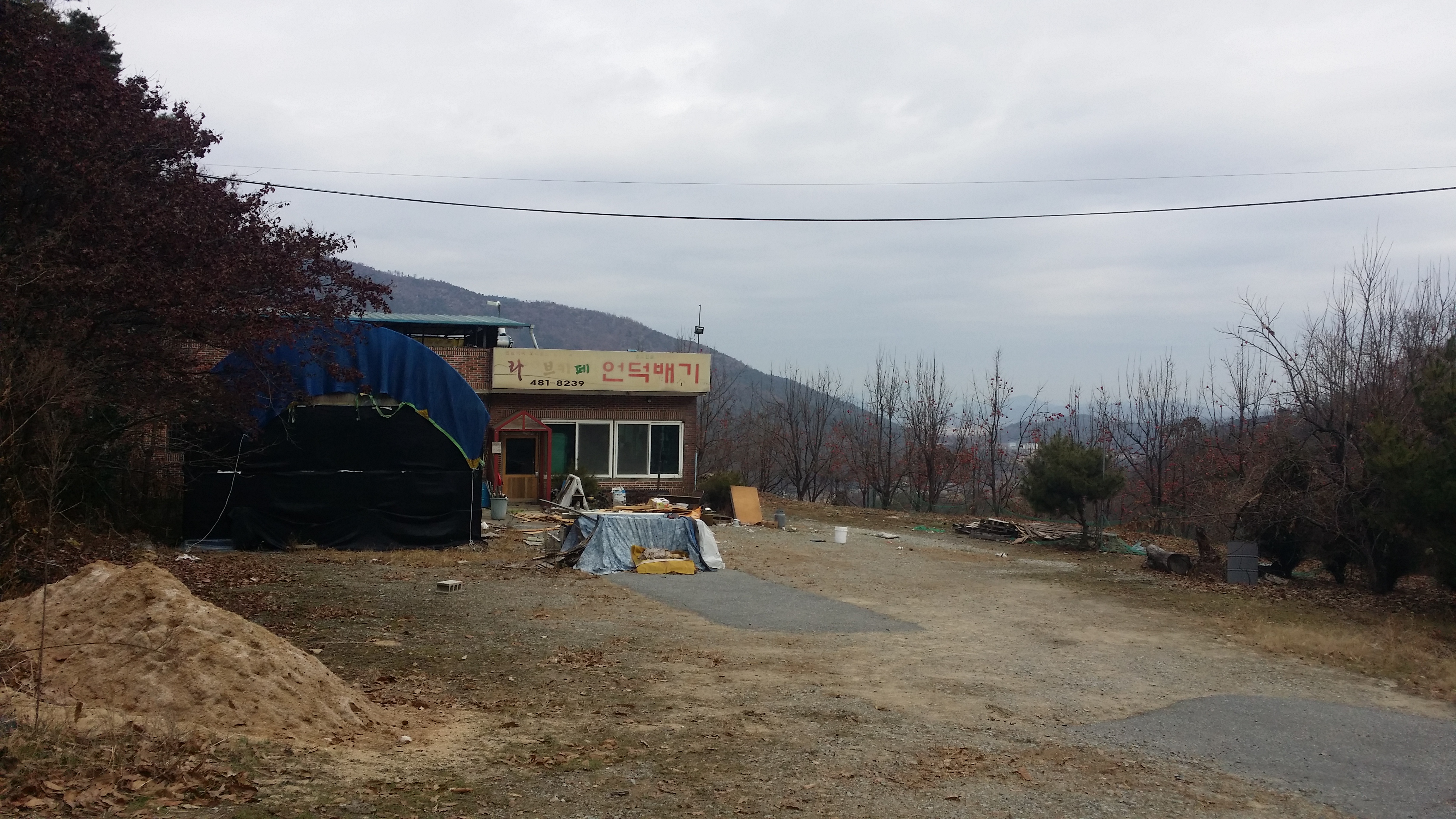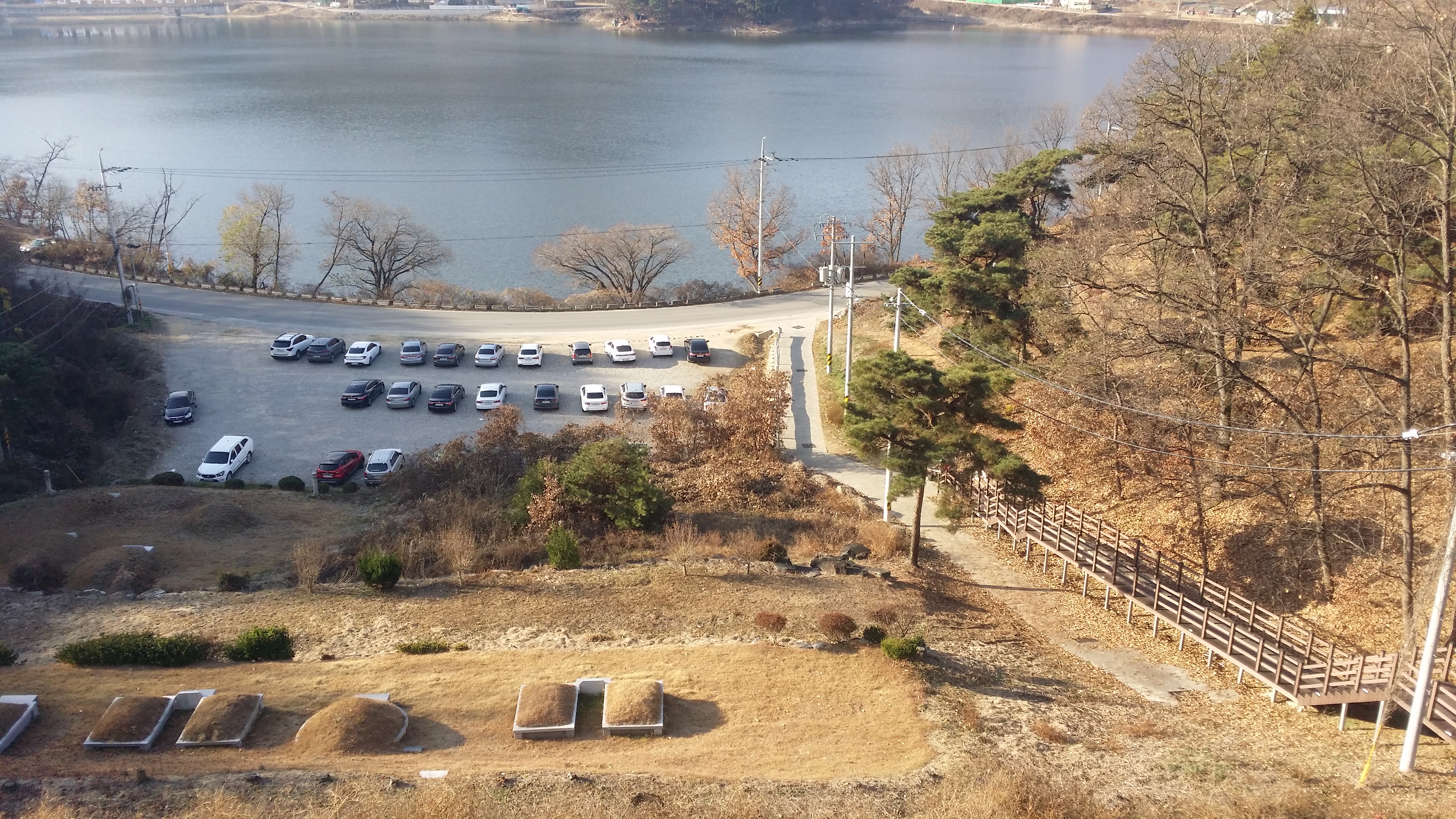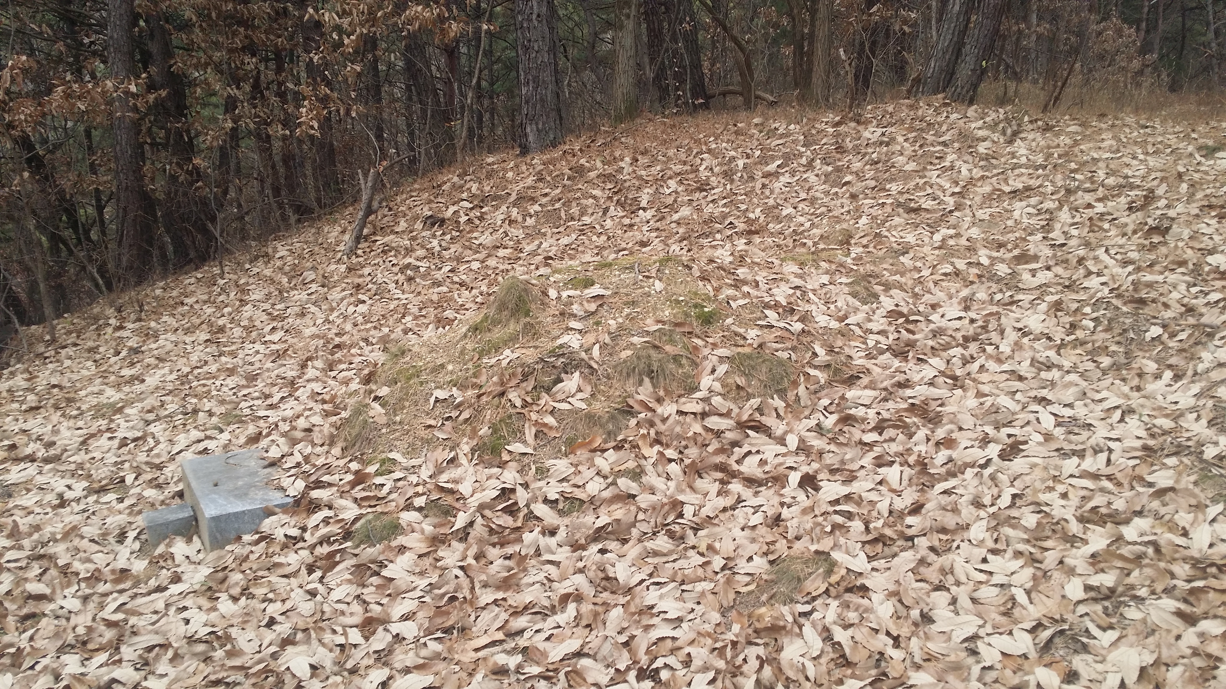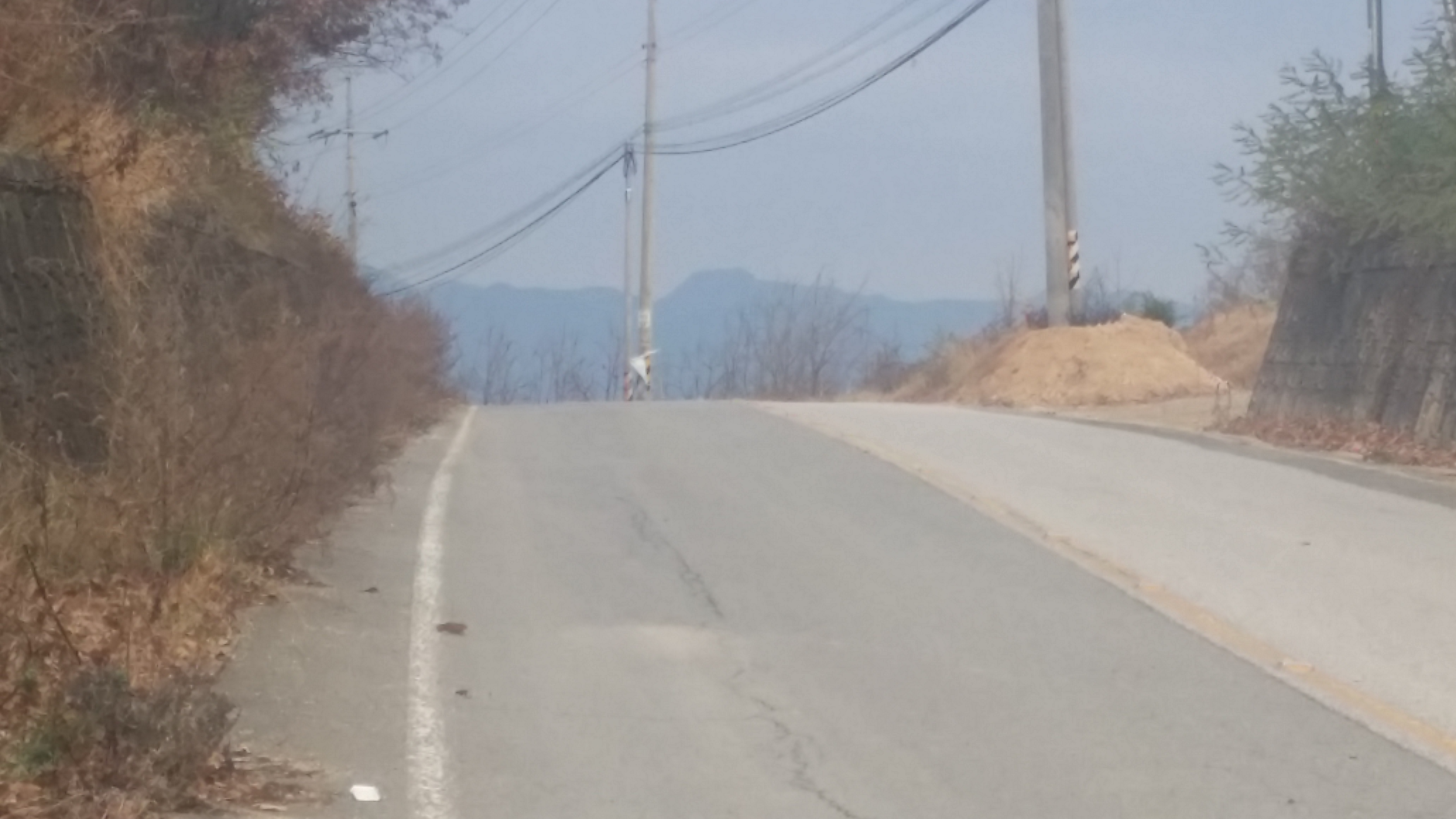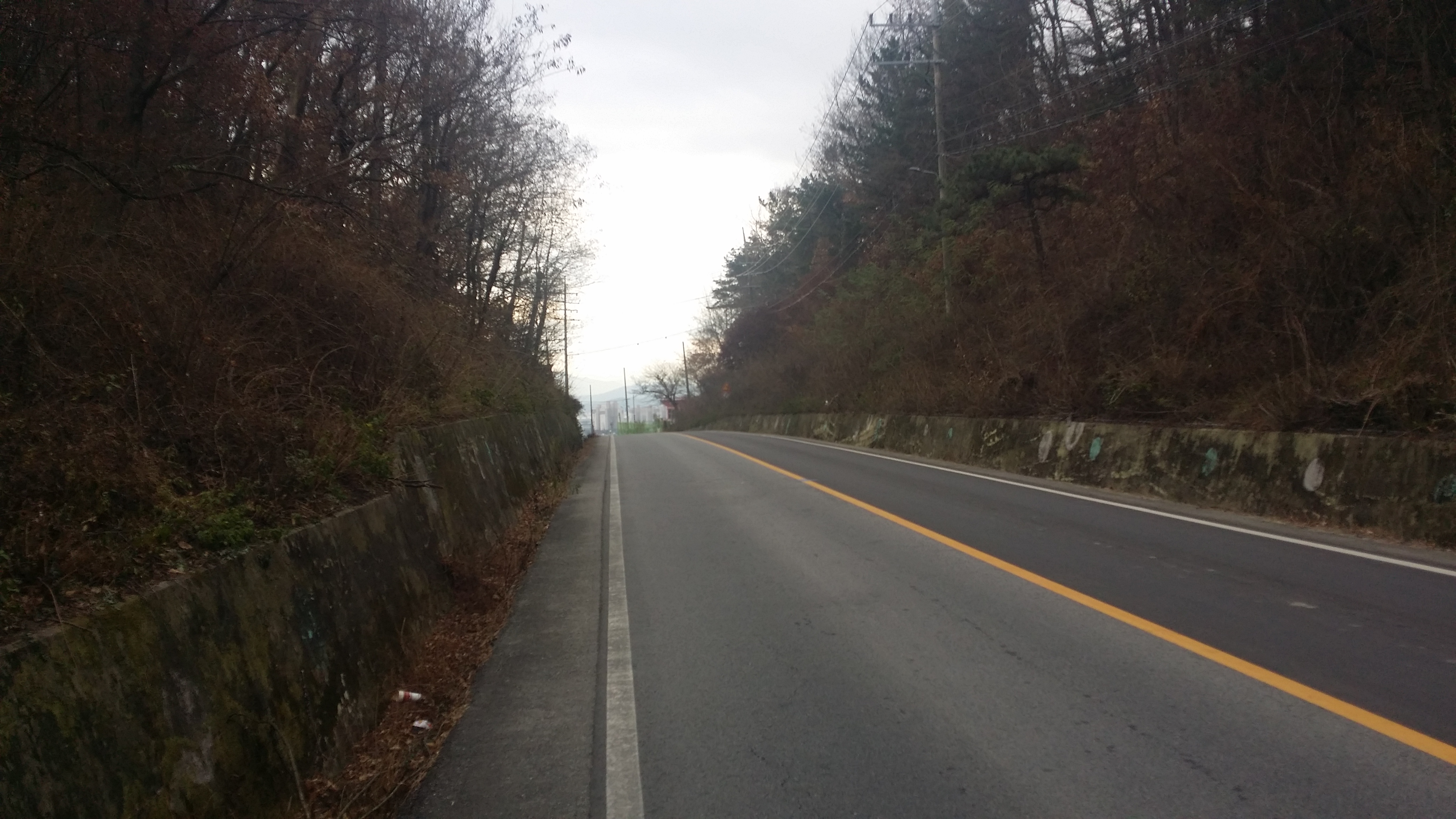 14:34~14:36 도로 / 절개지로 인하여 우측으로 우회하여 내려섰다. 마루금을 고집한다면 목재 야적장 옹벽을 올라서야 하는데 내려서며 보니 야적장에 사람들이 보여 포기하고 포기하고 길거너 묘지로 올라선다