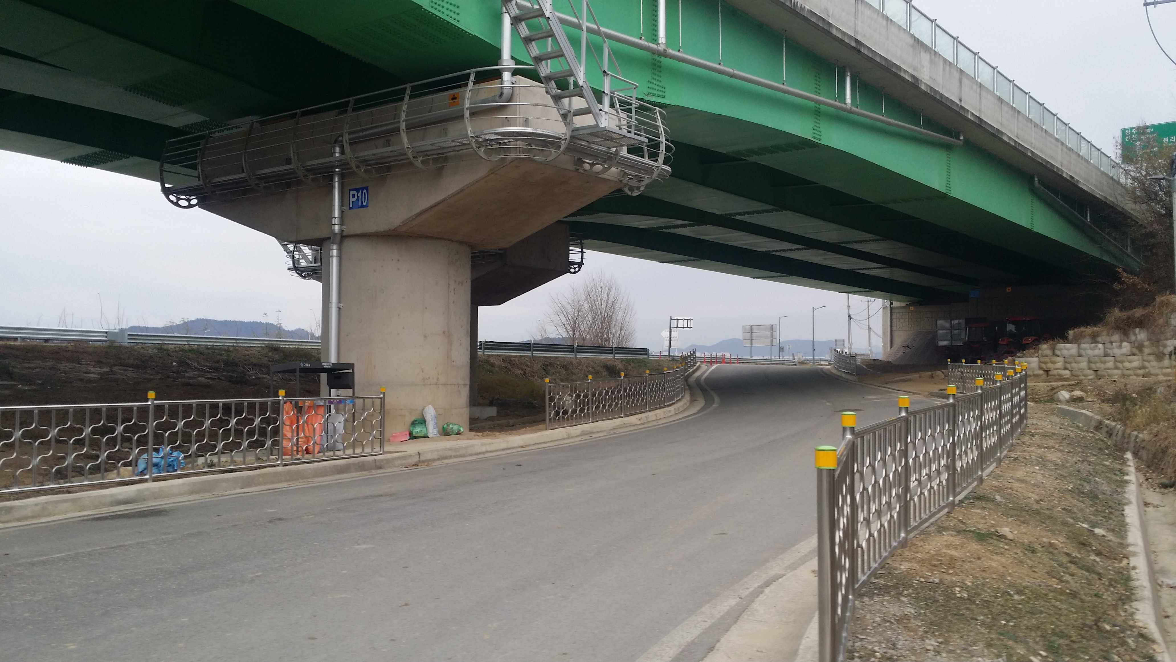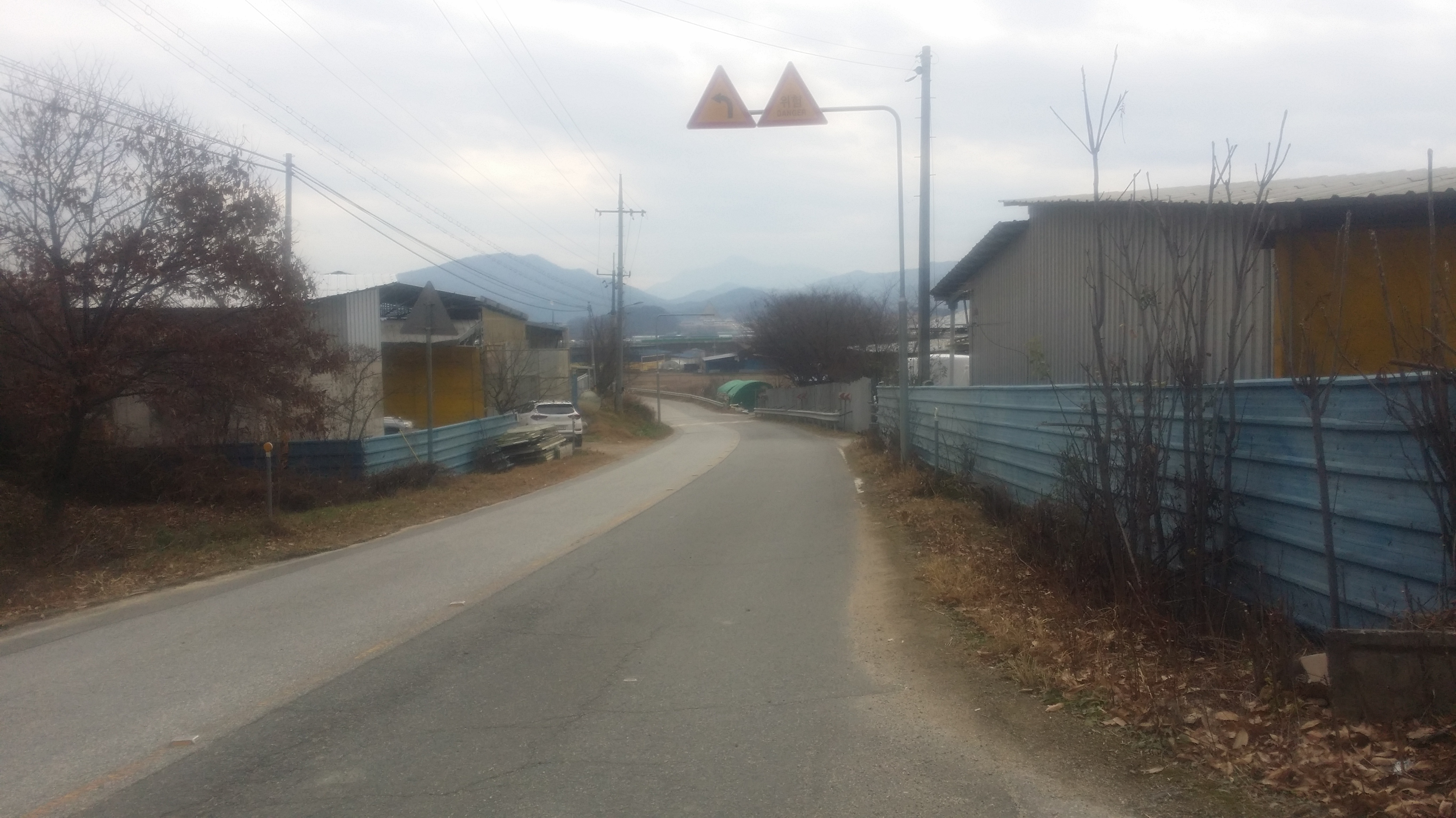 10:01 옥성 곶감 영농법인 마당을 지나 여기로 내려서야 하는데 펜스에 가로막혀 입구 도로변으로 진행하던지, 건물 뒤편으로 진행하던지