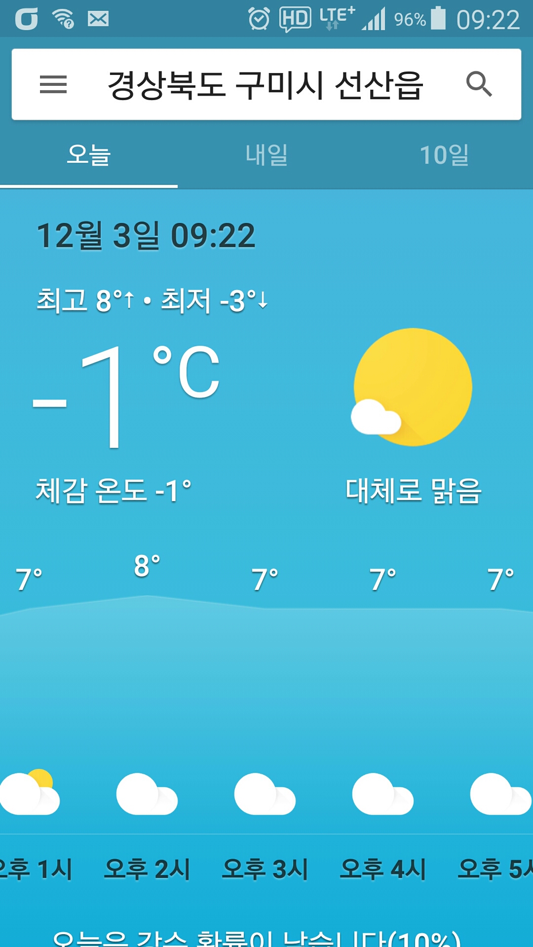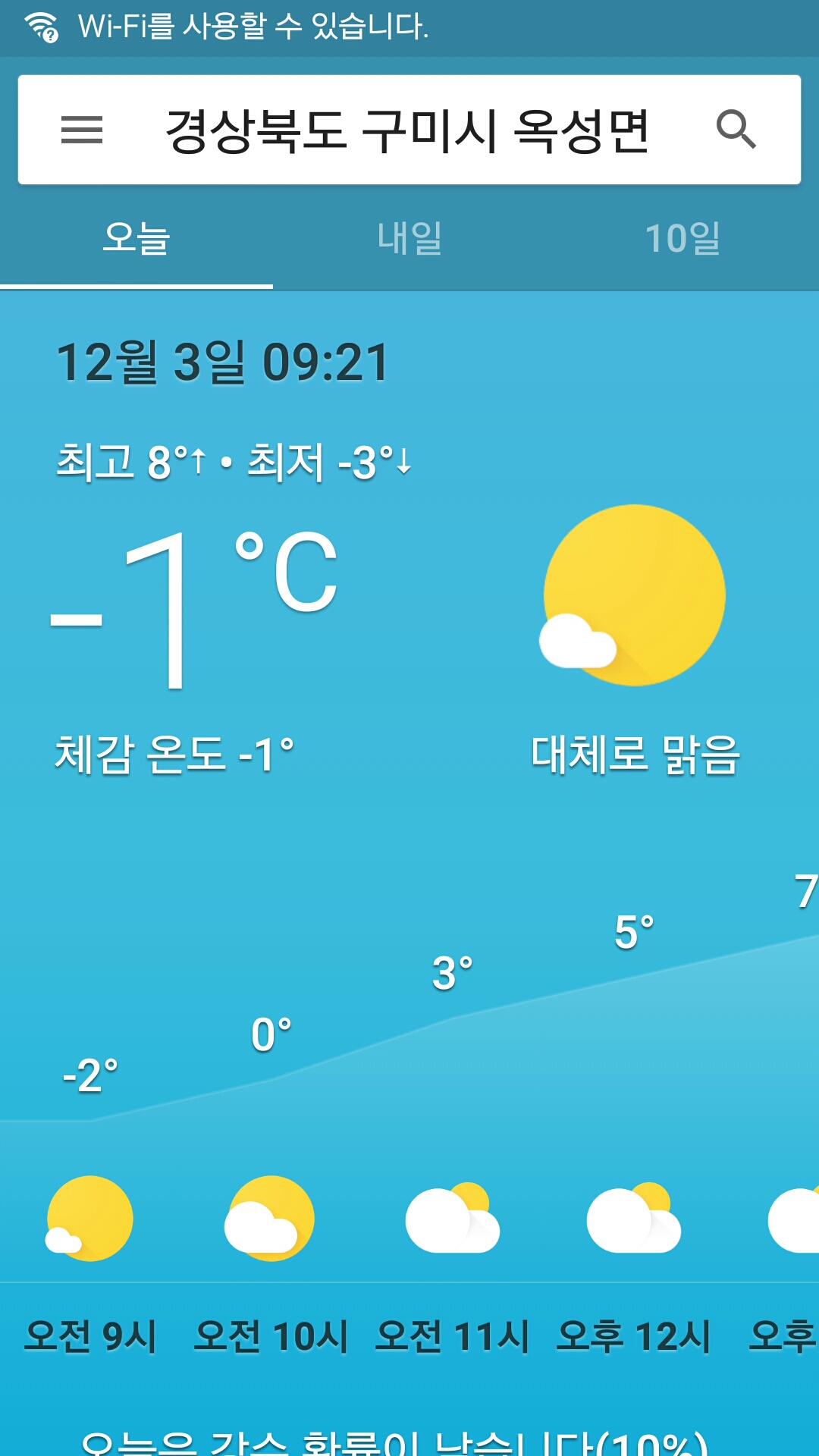 - 기상 : -1˚ ~ 8˚, 습도 70%, 바람 2~6(잔잔), 공기질 74(보통), 일몰 17시12분