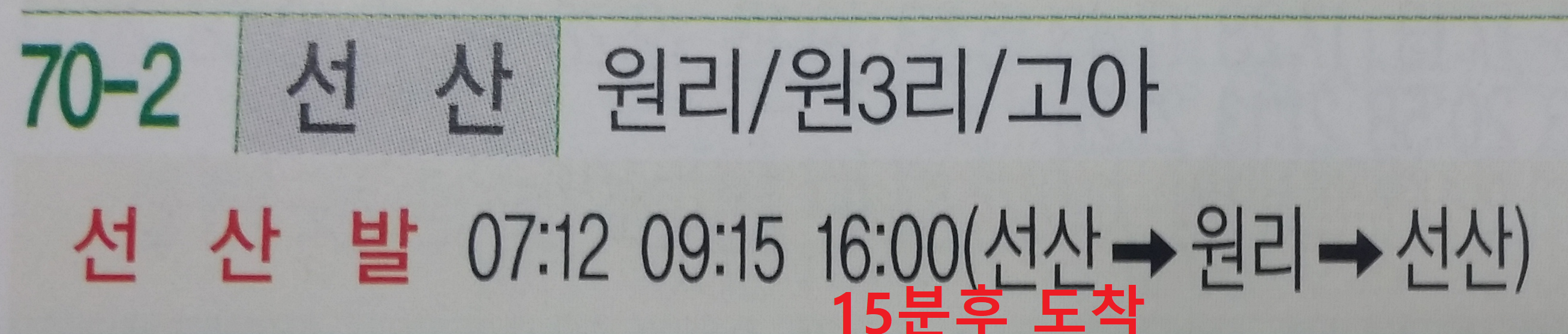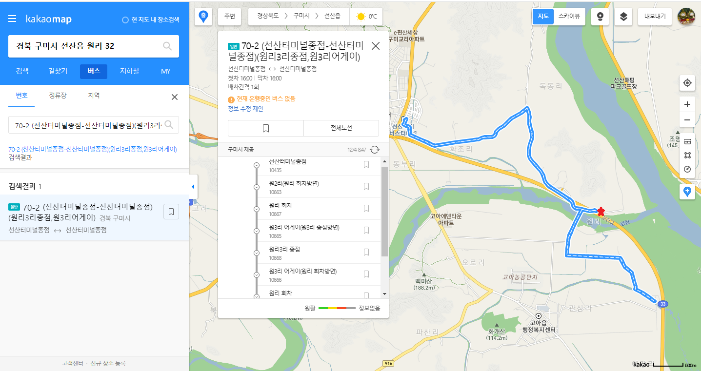 시간대에 따라 버스 운행 코스는 다르다. 16시 선산발은 왕복형으로 최종 종점은 원3리다 16시10분 원리에 도착하여 원3리 갔다 되돌아 온다는데, 원리가 종점이라 착각하여 버스 이동을 자세히 체크 안했는데 아무튼 원리에 되돌아 온다면 16시15분경 경유하고 16시25분경 선산에 도착하는데, 왠떡으로 16시10분에 버스가 도착하여 16시20분이면 선산에 도착, 16시25분 구미행 170번 환승하면 컵라면 먹을 시간 있어 좋아라 했는데, 선산에 20초 차이로 16시25발 구미행 버스를 놓쳐 엄청나게 욕했는데, 집에와서 체크해 보니 내가 오해했네. 미안해유