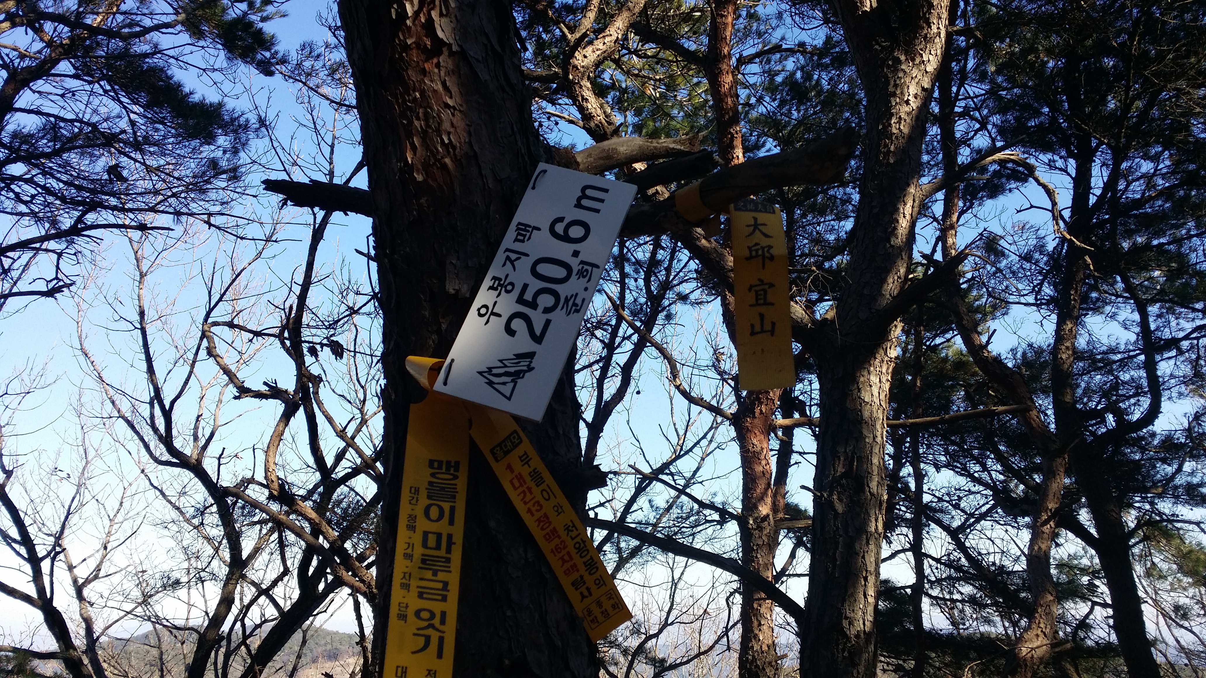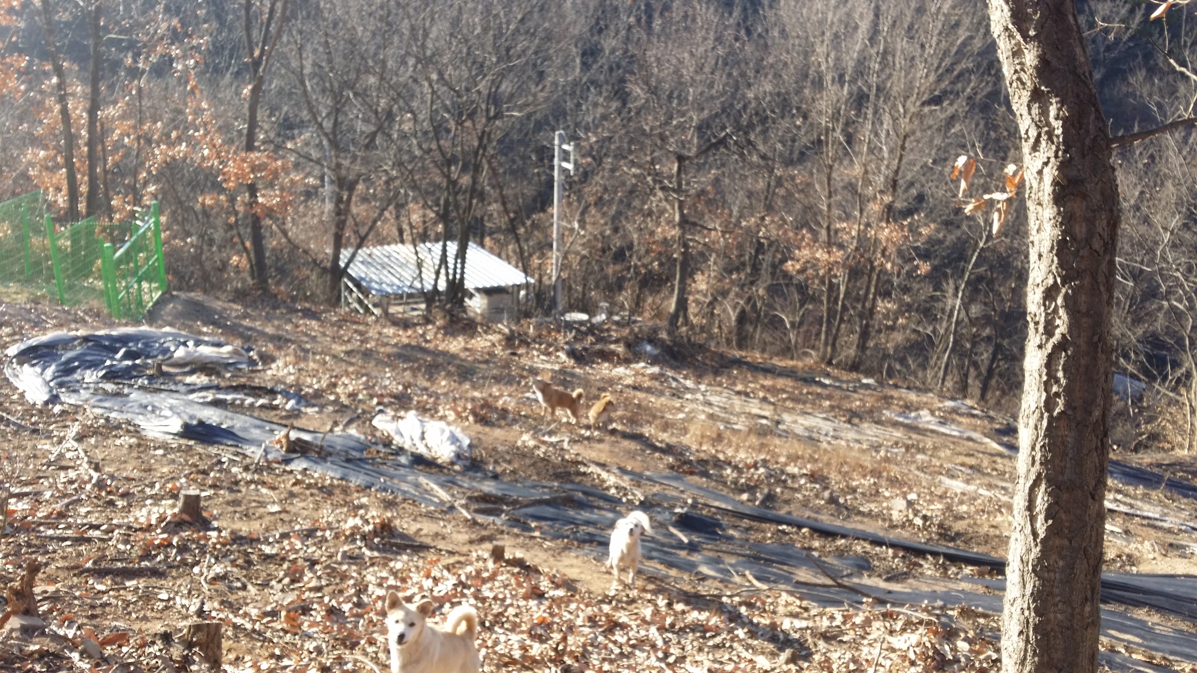 15:22 남재 / 건너편 능선에서 내려서면서부터 견공이 짖기 시작하여 농원을 지나 시야에서 사라질때 까지 짖는다. 똥개도 지집에선 큰소리 친다고 5마리가 몰려와 짖는데, 개무시하고 올라섰다.